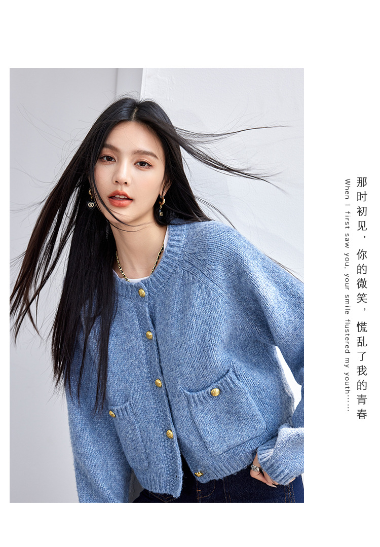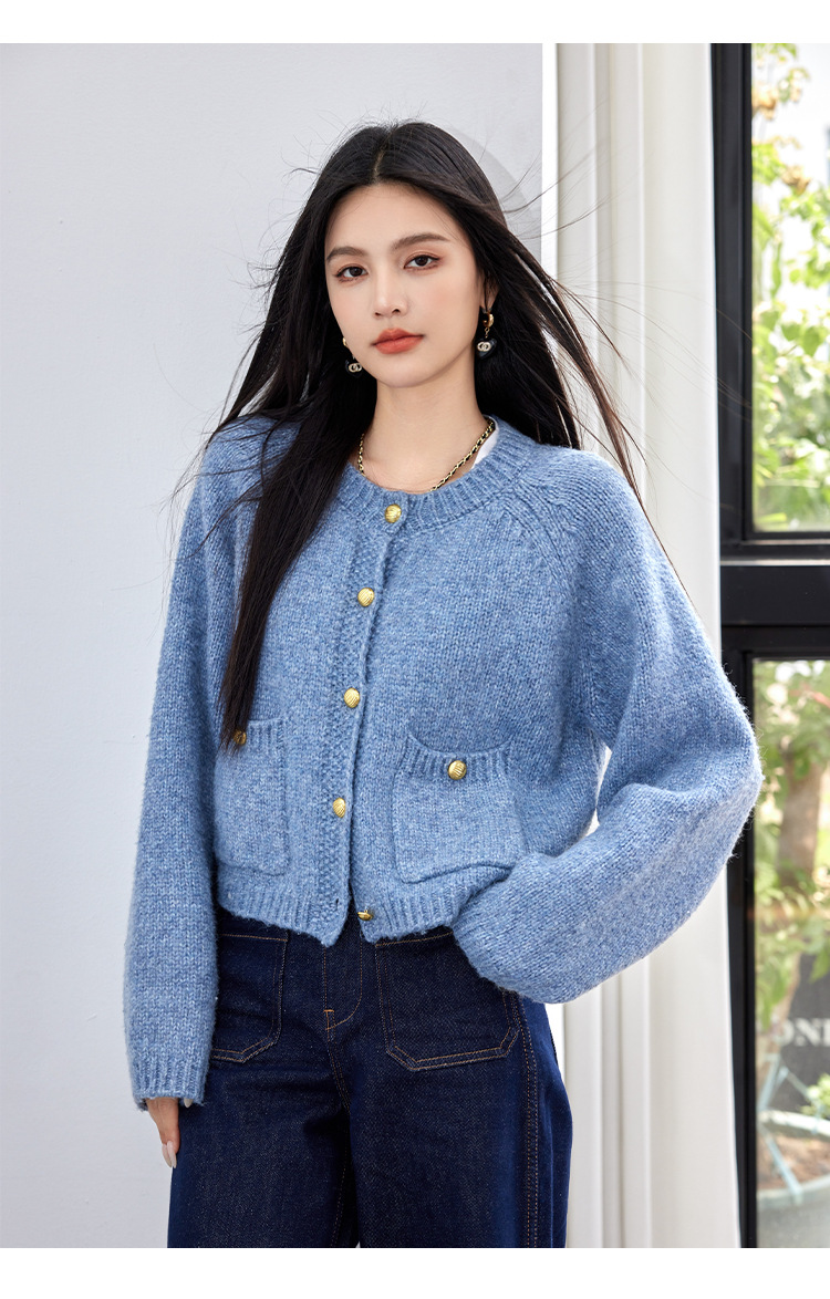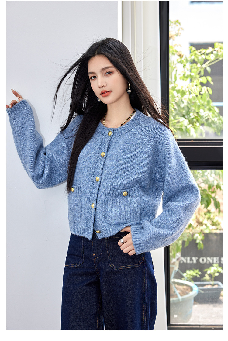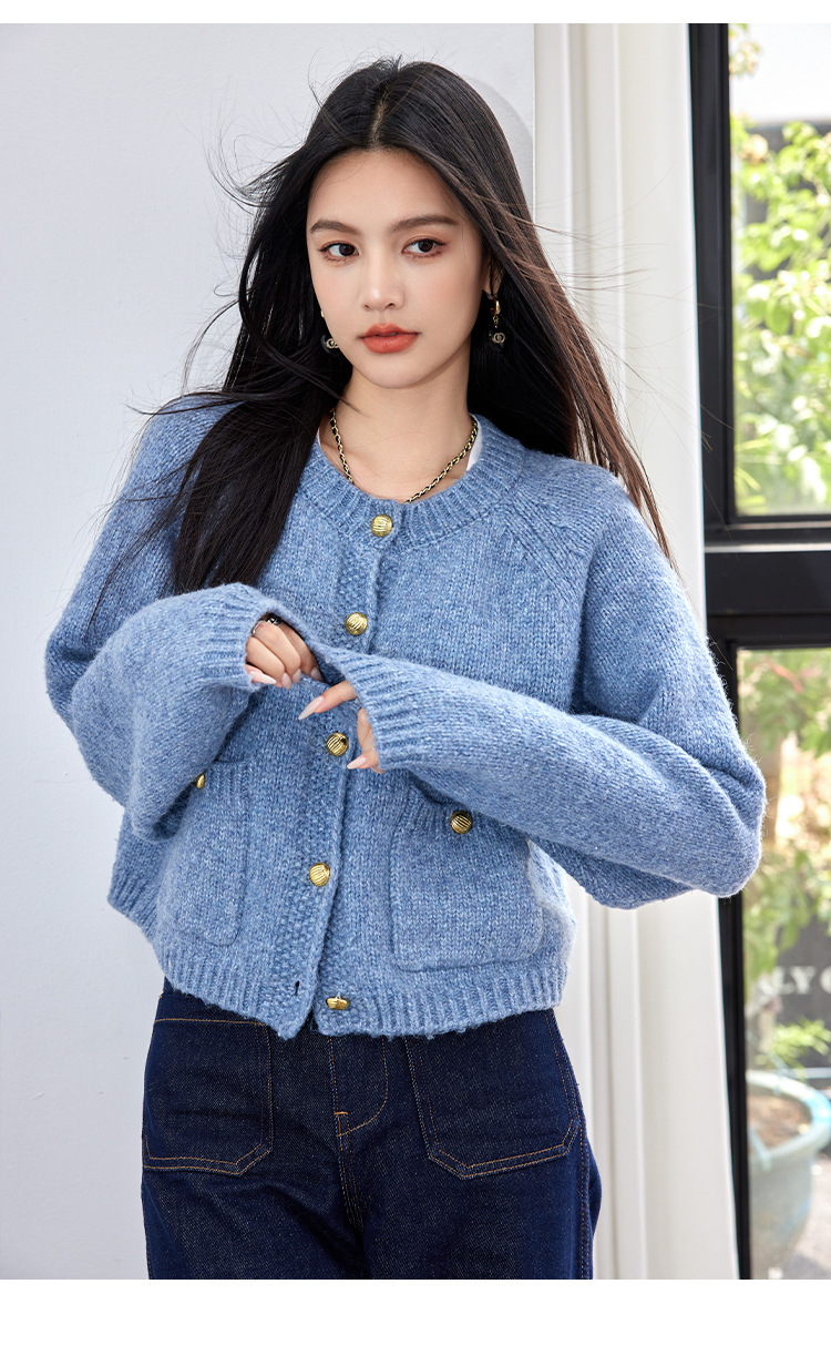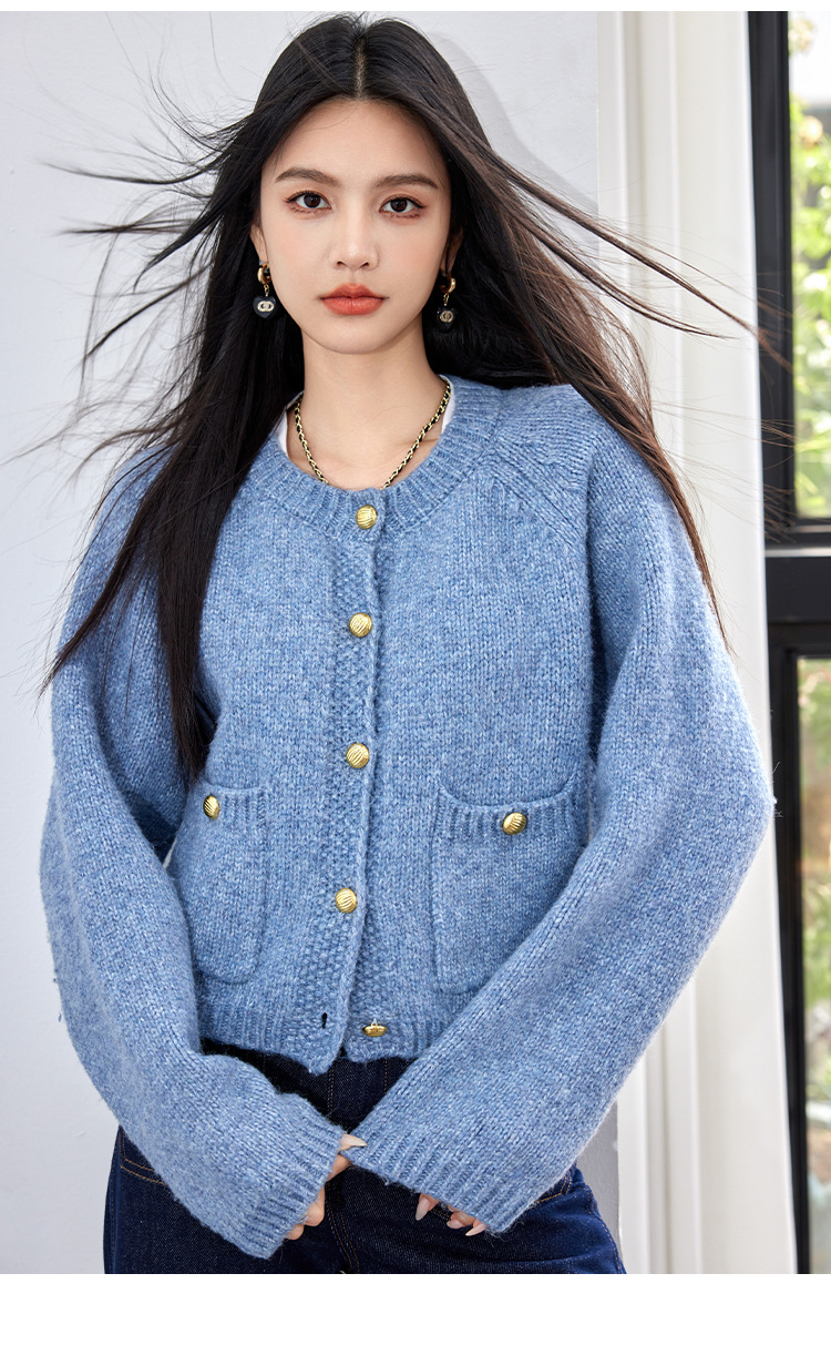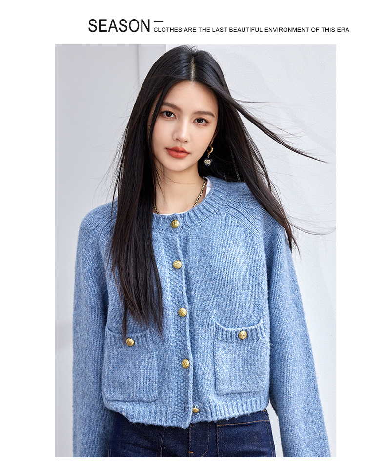 2024 겨울 새로운 한국 스타일 샤넬 스타일 두꺼운 따뜻한 작은 골드 버튼 디자인 포켓 카디건 짧은 스웨터