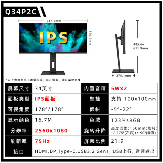 • Q34P2C 34inch 스피커 회전 리프트가 내장된 피쉬 스크린 2k ips usb