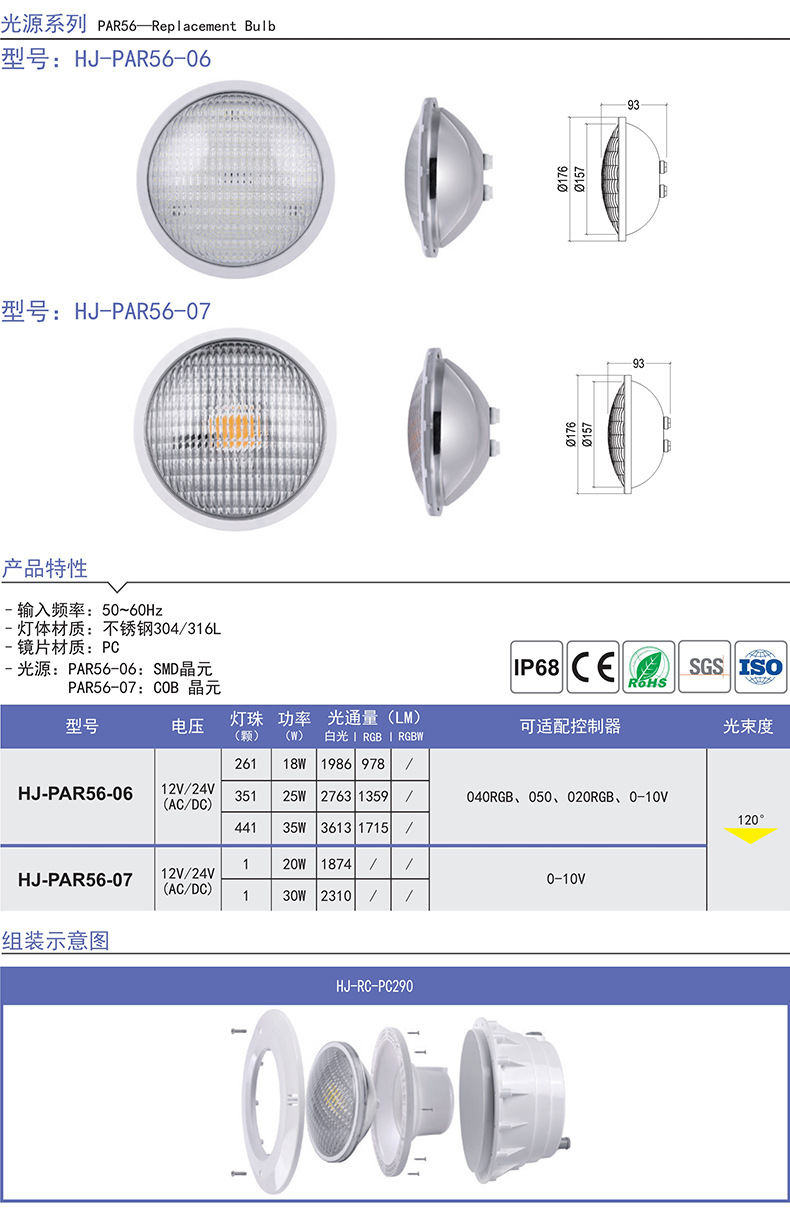 국제 크기의 고출력 PAR56 수영장 벽 램프 30W 다채로운 RGB 수중 LED 램프 컵 전구 교체 광원