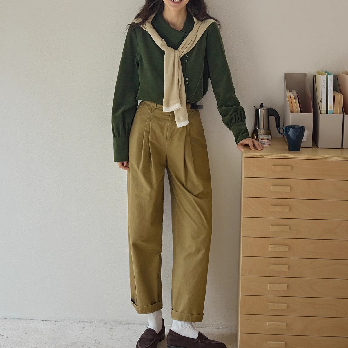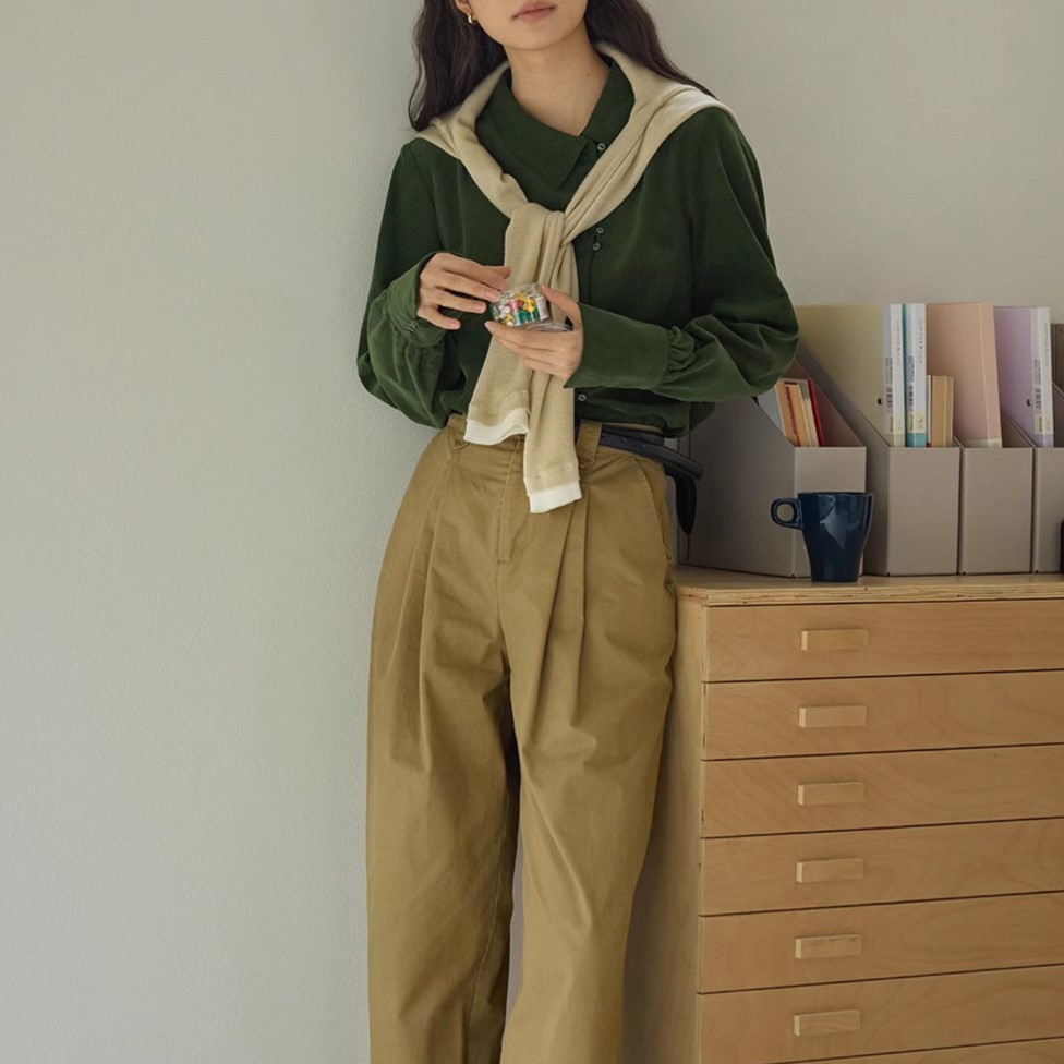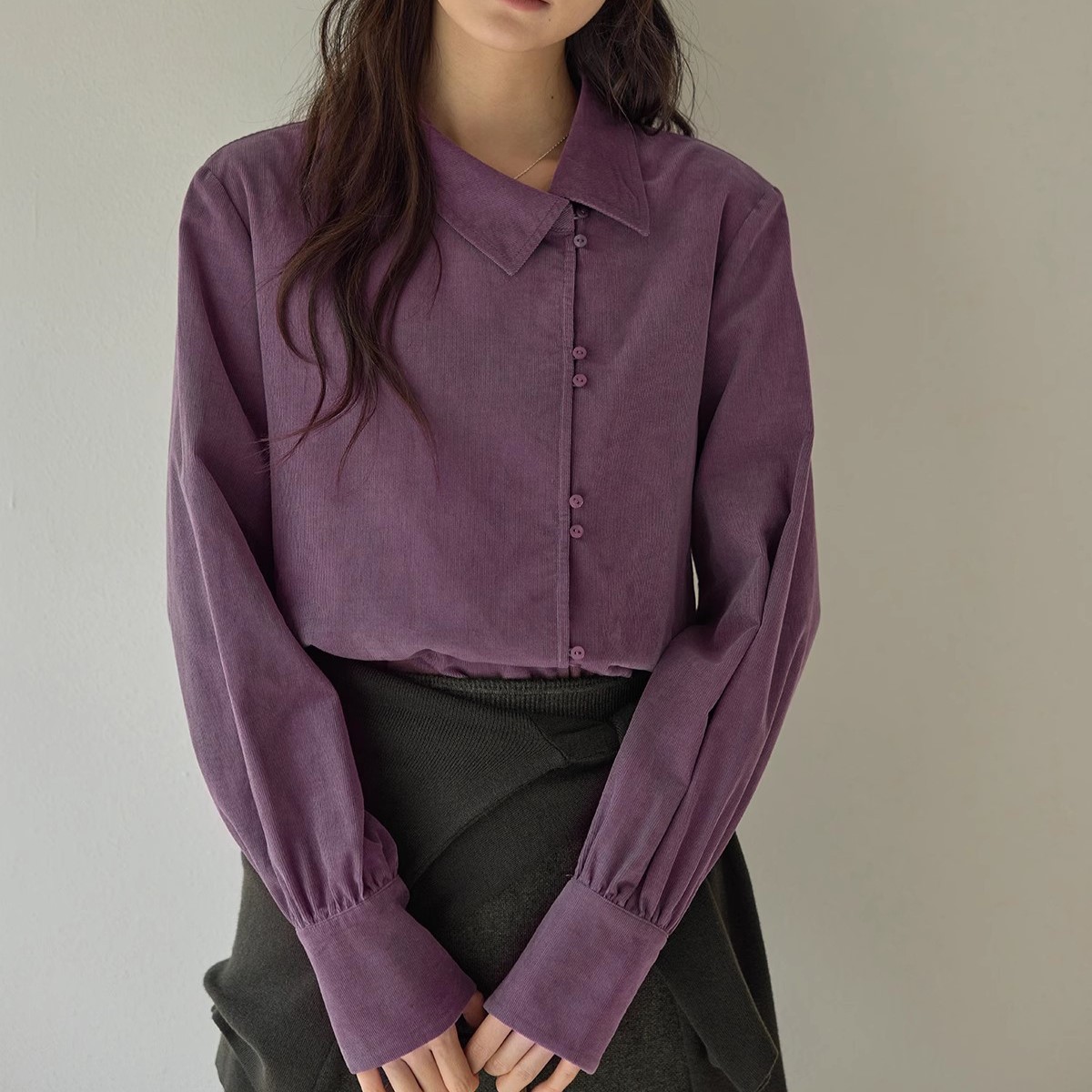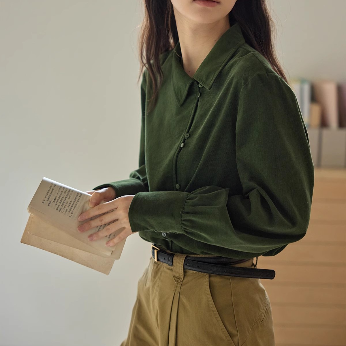 프랑스 레트로 코듀로이 그린 셔츠 여성의 가을과 겨울 경사 버튼 불규칙한 셔츠스토어 가기
