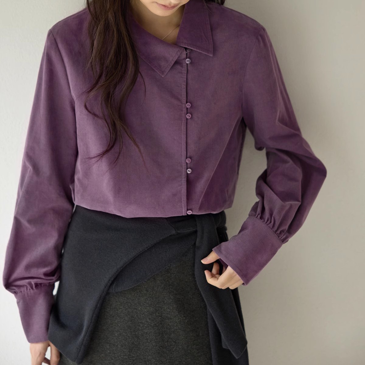 프랑스 레트로 코듀로이 그린 셔츠 여성의 가을과 겨울 경사 버튼 불규칙한 셔츠