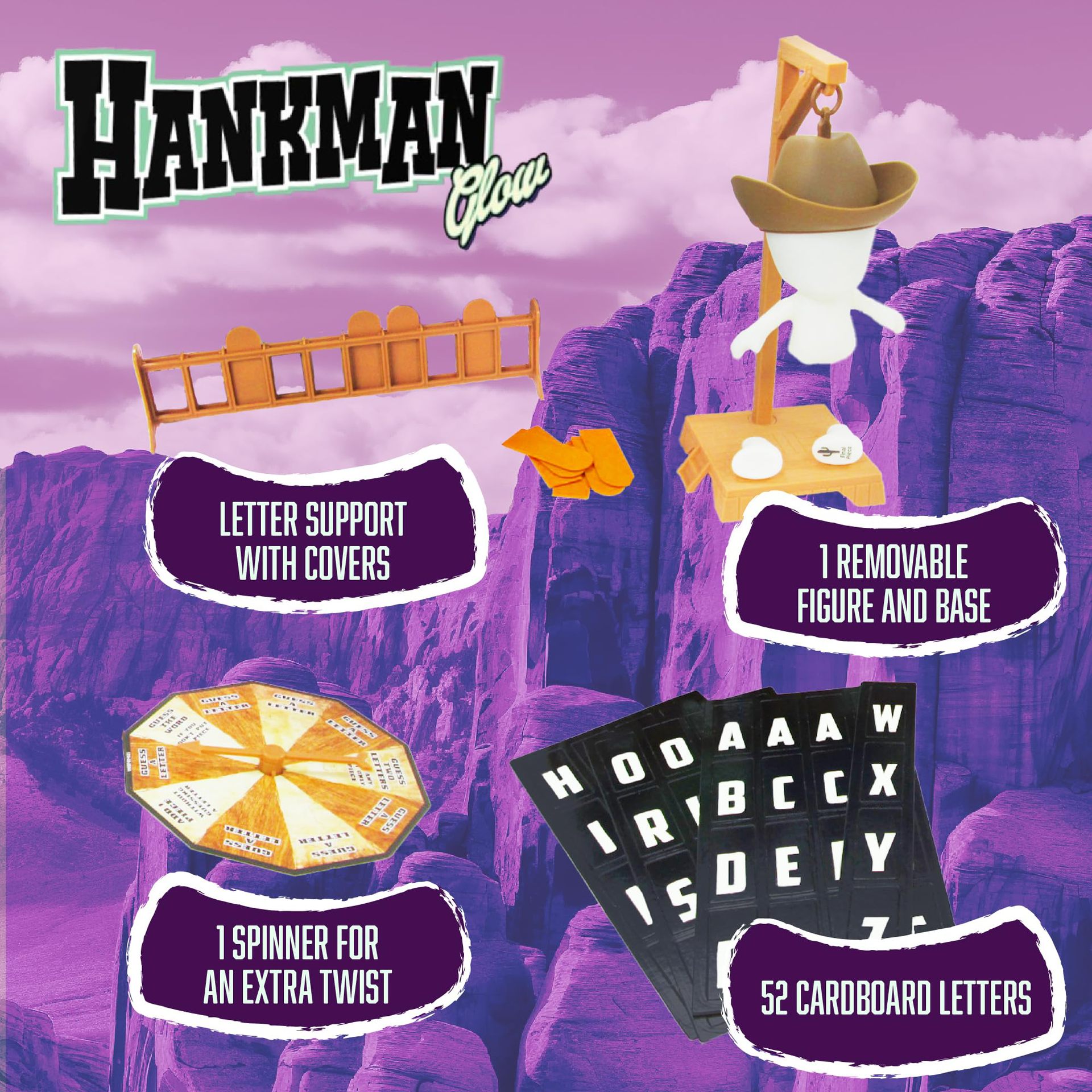 GLOW-IN-THE-DARK EXCITEMENT! The glowing pieces add a thrilling dimension to classic hangman, making it fun for play at any time of day or night. Light up family game nights with Hankman Glow!