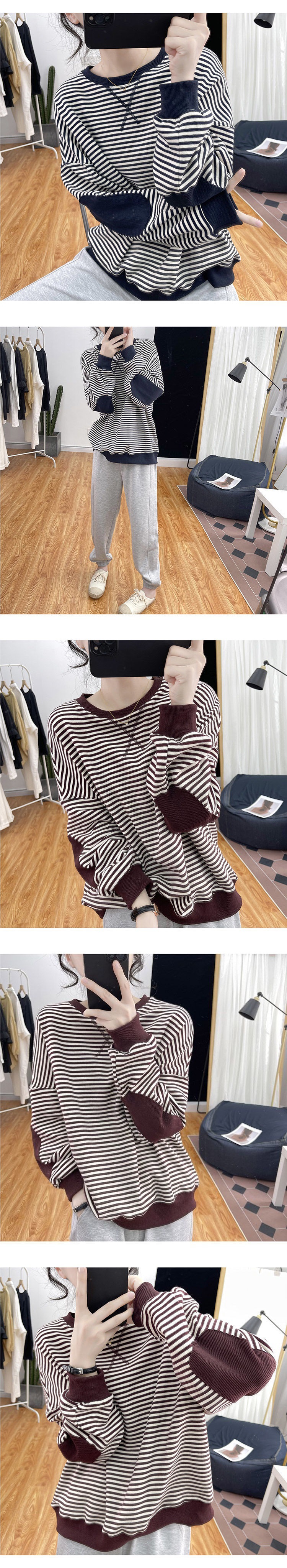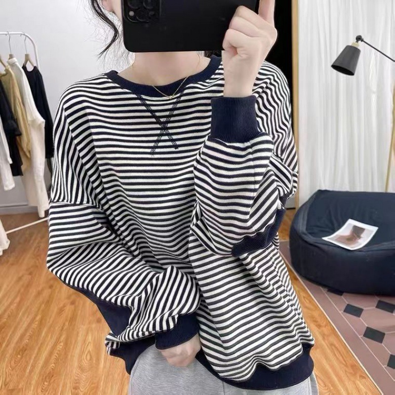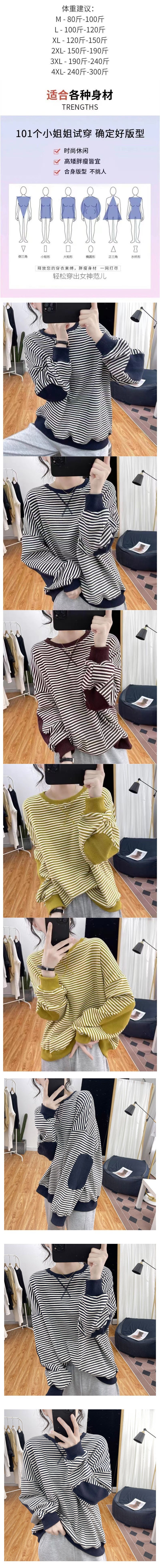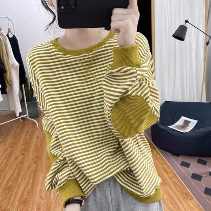 플러스 사이즈 나이를 줄이는 여성용 스웨트 코트 봄과 가을 한국 스타일 느슨한 슬리밍 통통녀 풀오버 긴 소매 줄무늬 크림 Howl스토어 가기