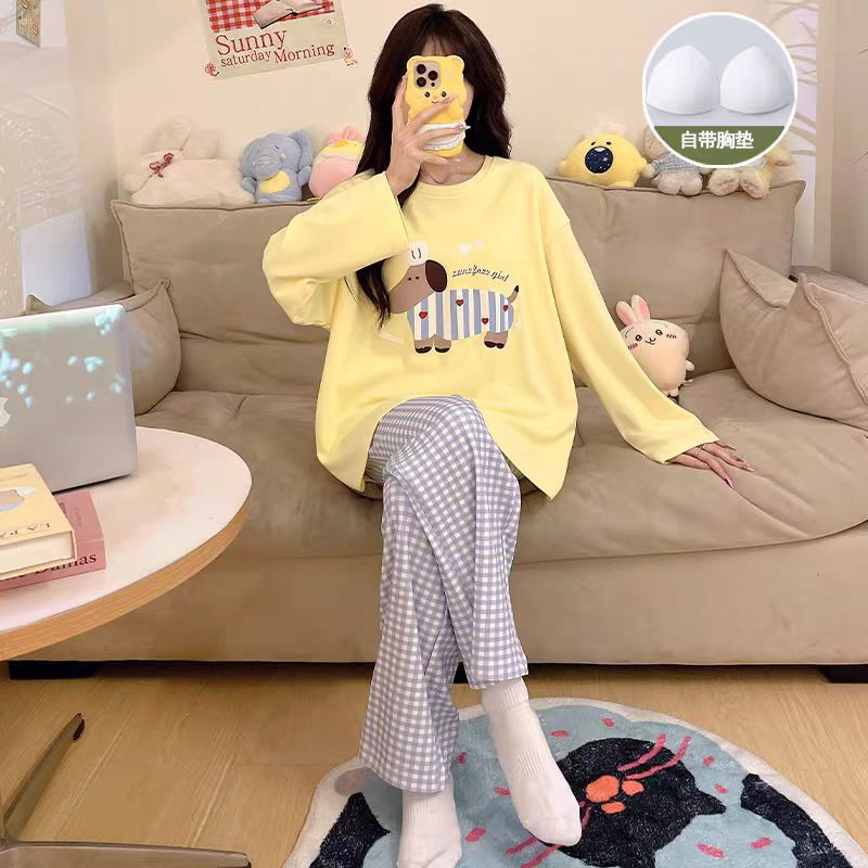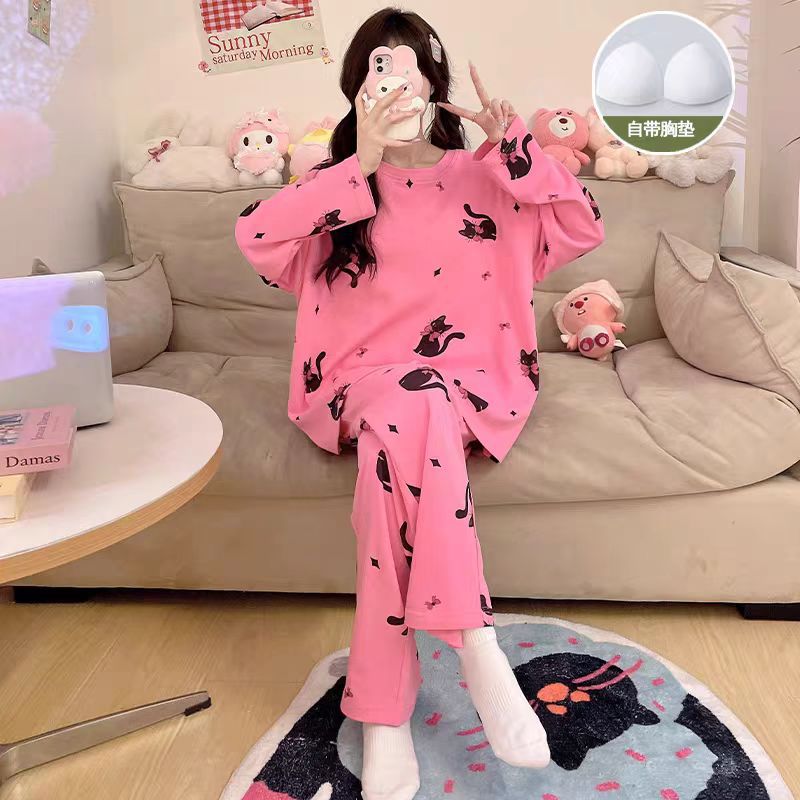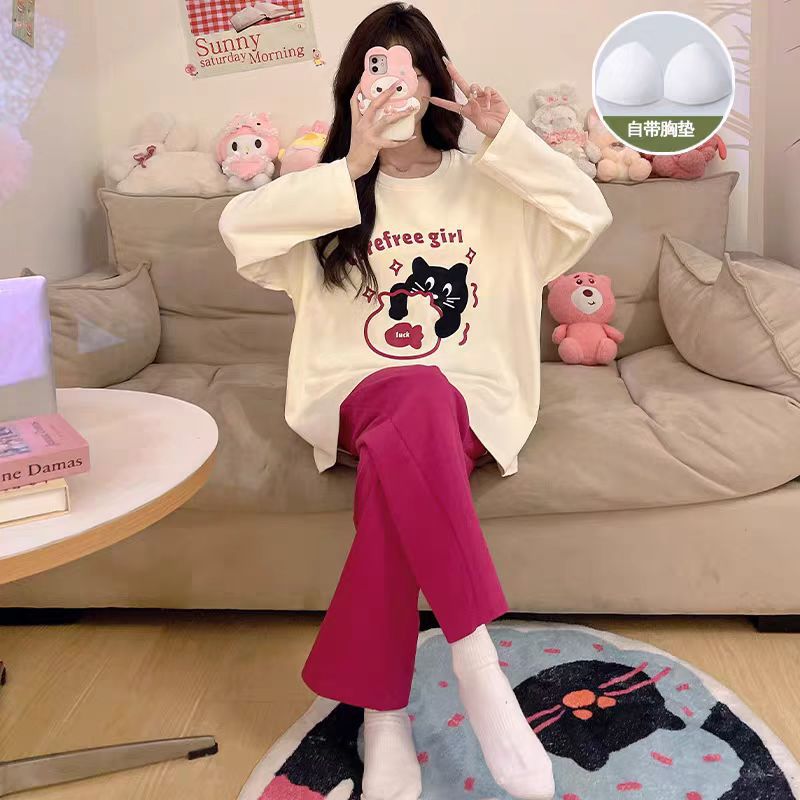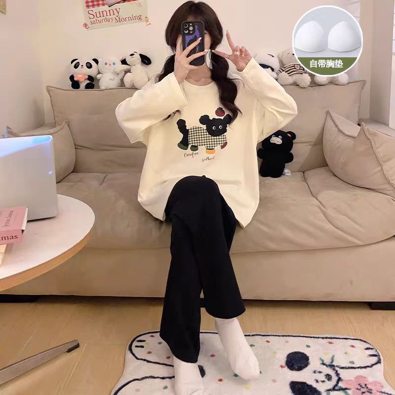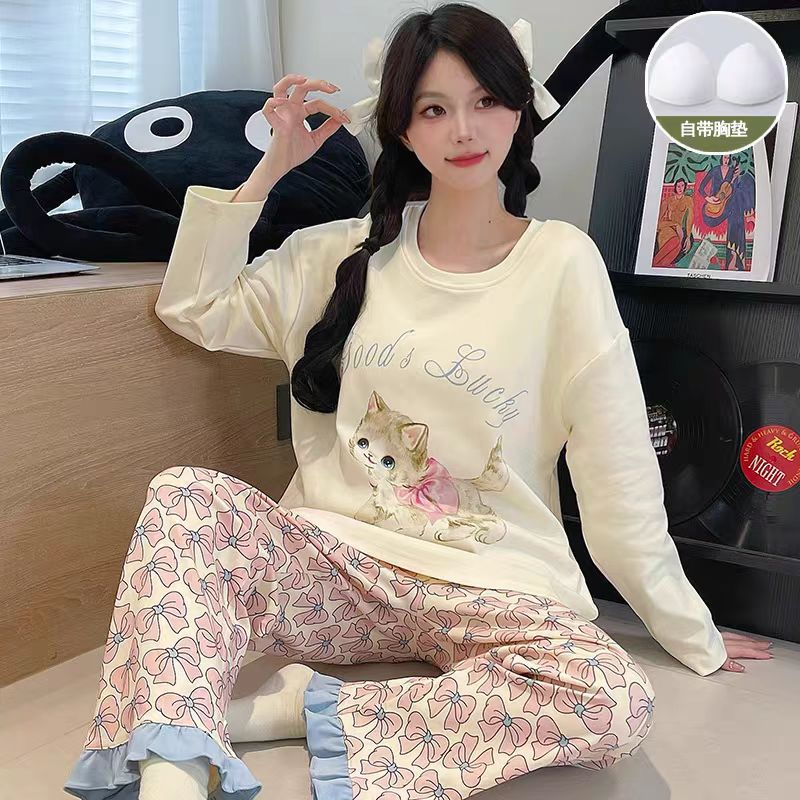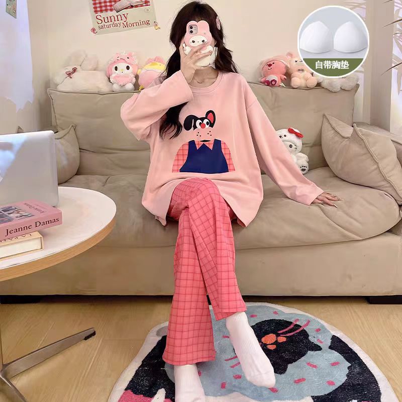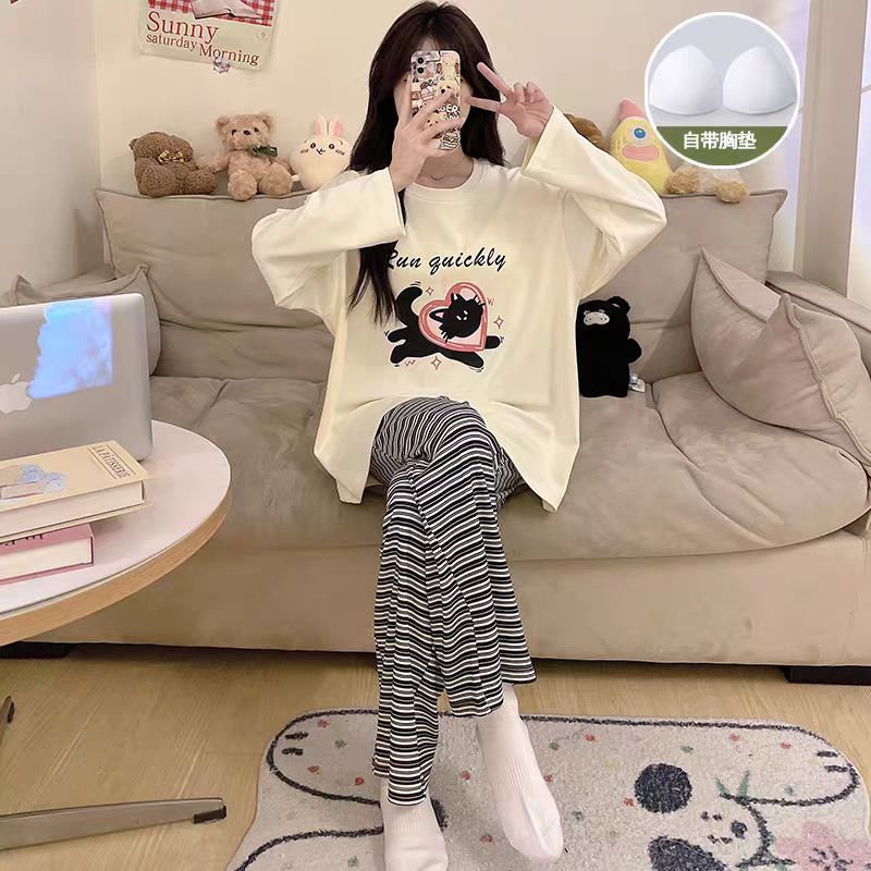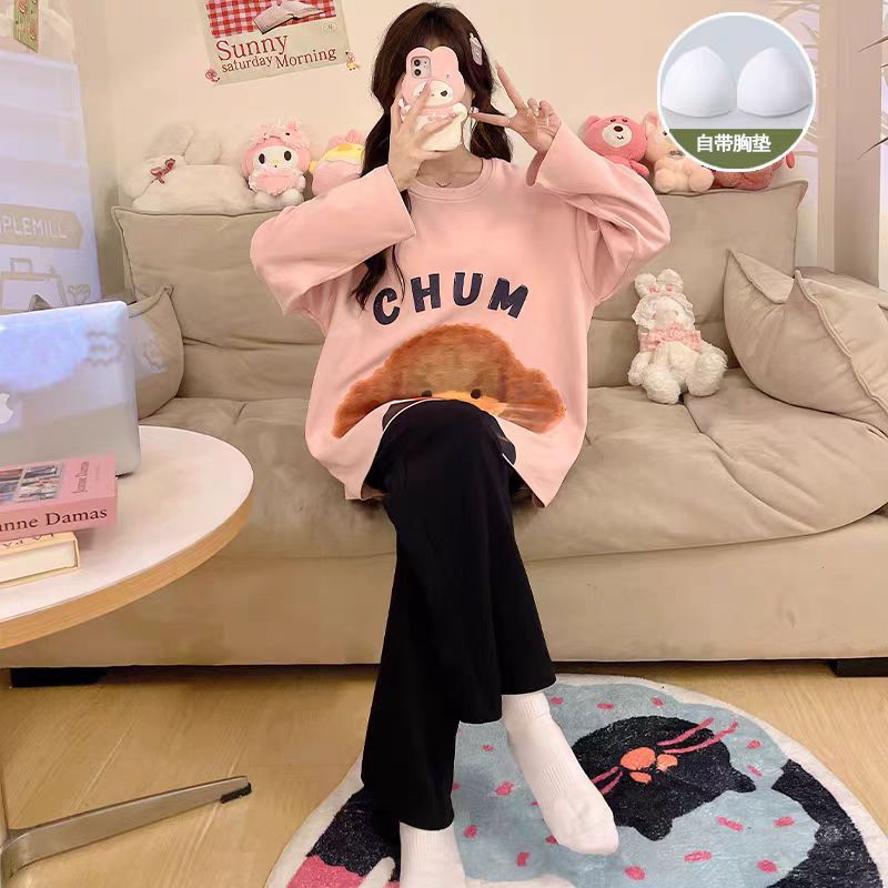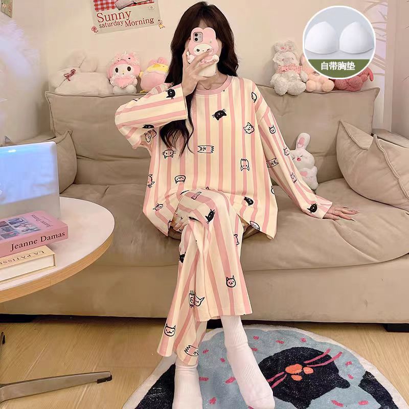 소스 공장 긴 소매 바지 봄과 가을 잠옷 여성 세트 코튼 캐주얼 플러스 사이즈 가슴 패드 느슨한 집스토어 가기
