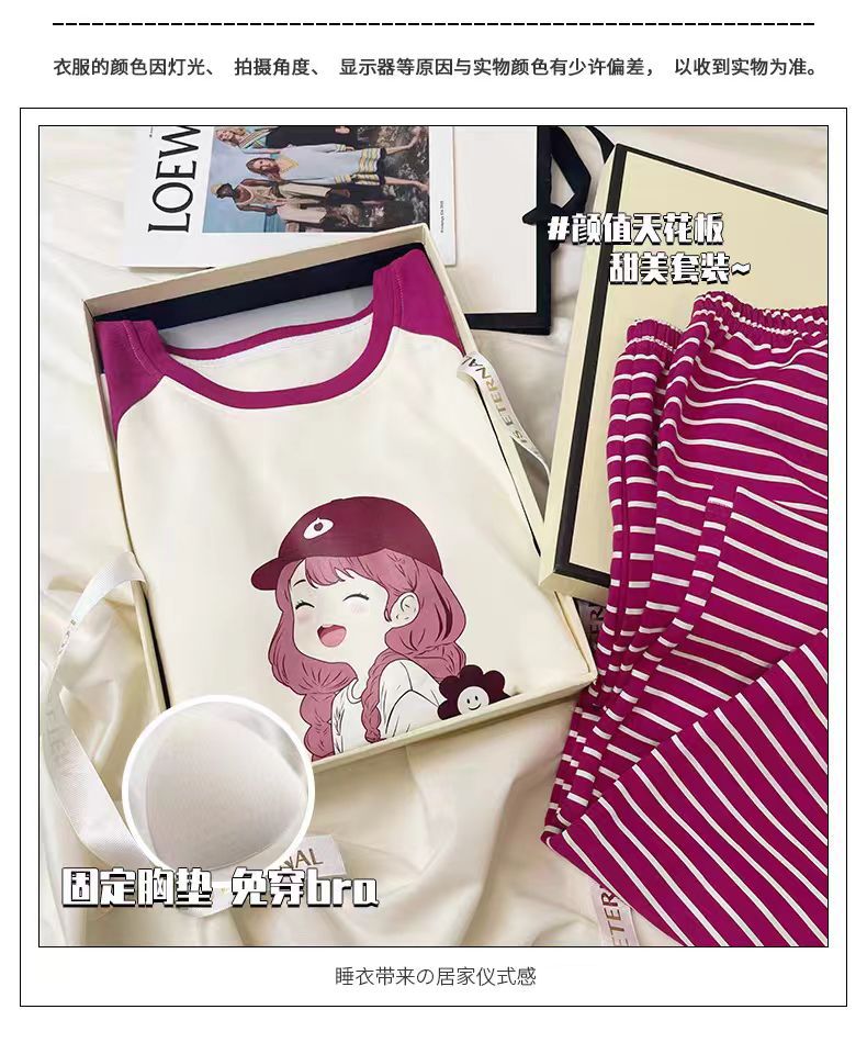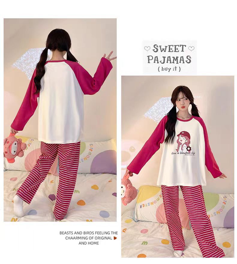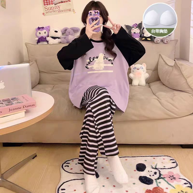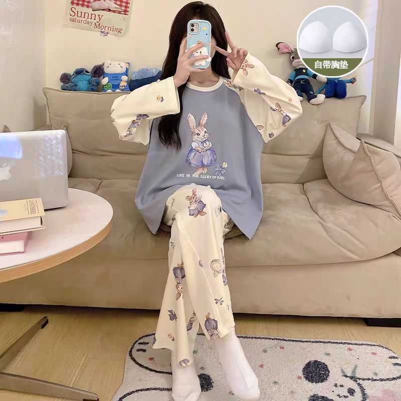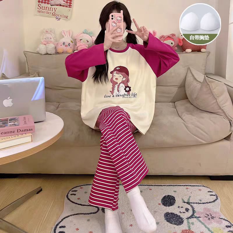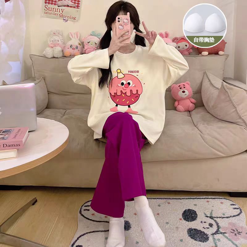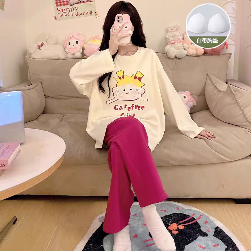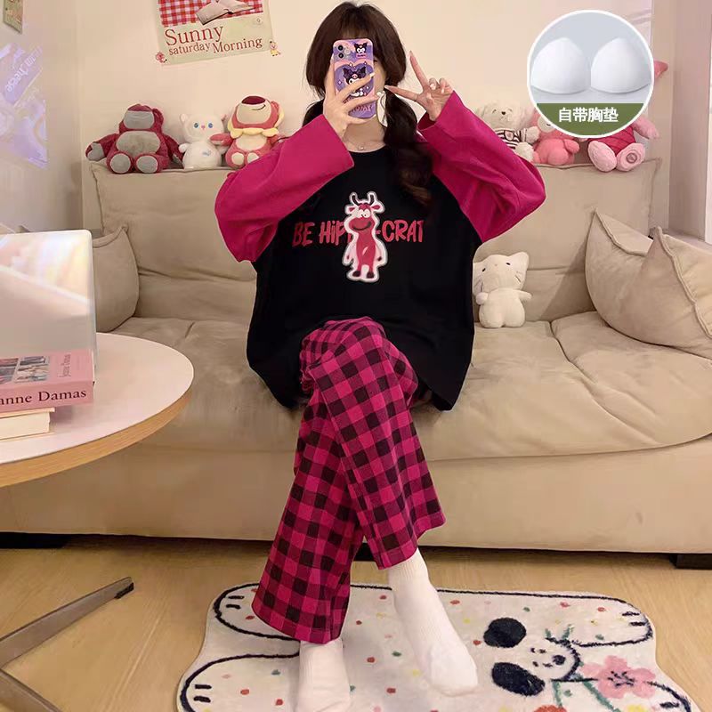 소스 공장 긴 소매 바지 봄과 가을 잠옷 여성 세트 코튼 캐주얼 플러스 사이즈 가슴 패드 느슨한 집스토어 가기