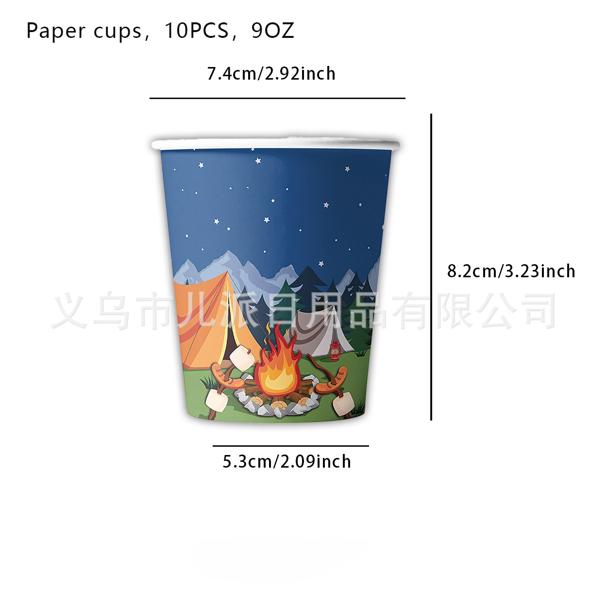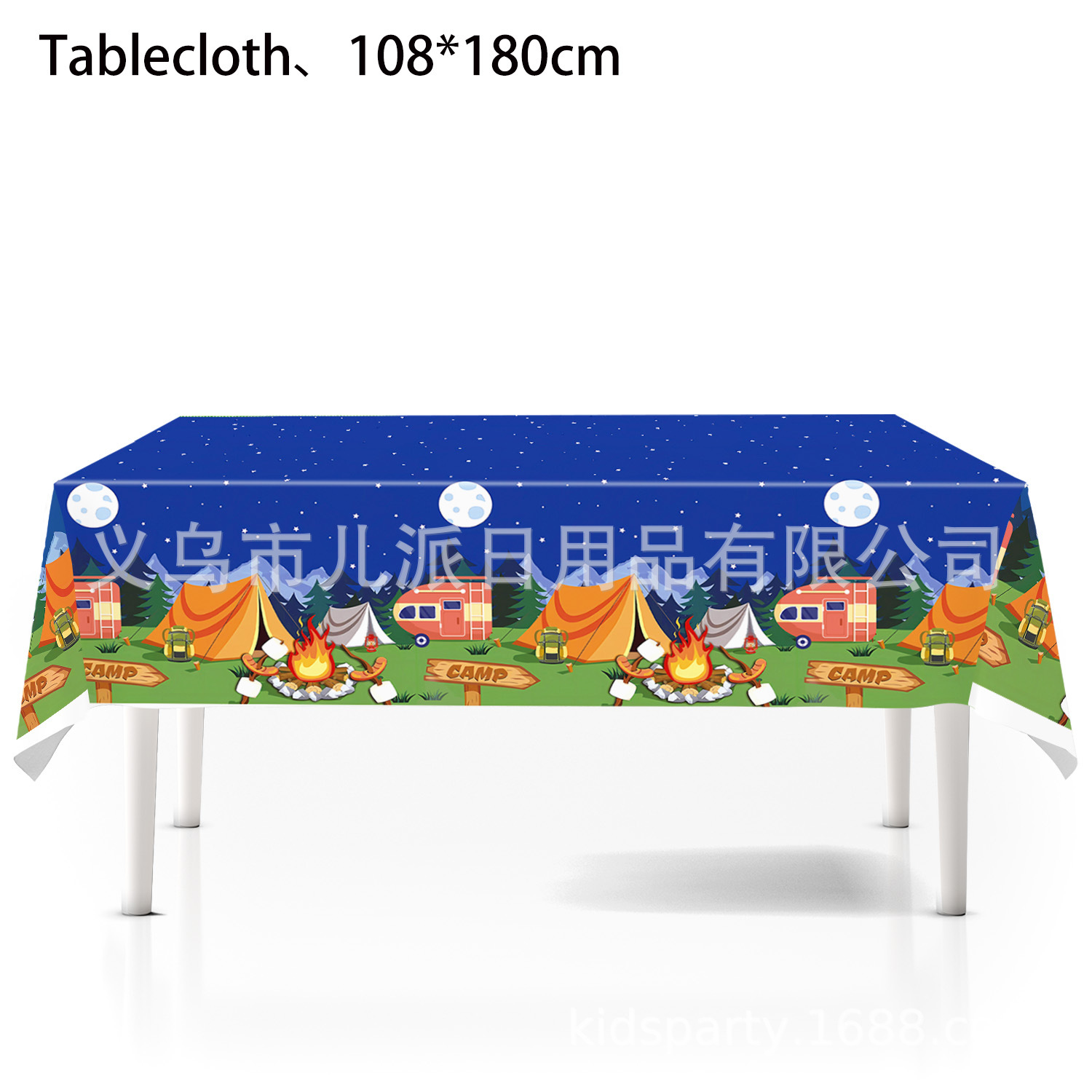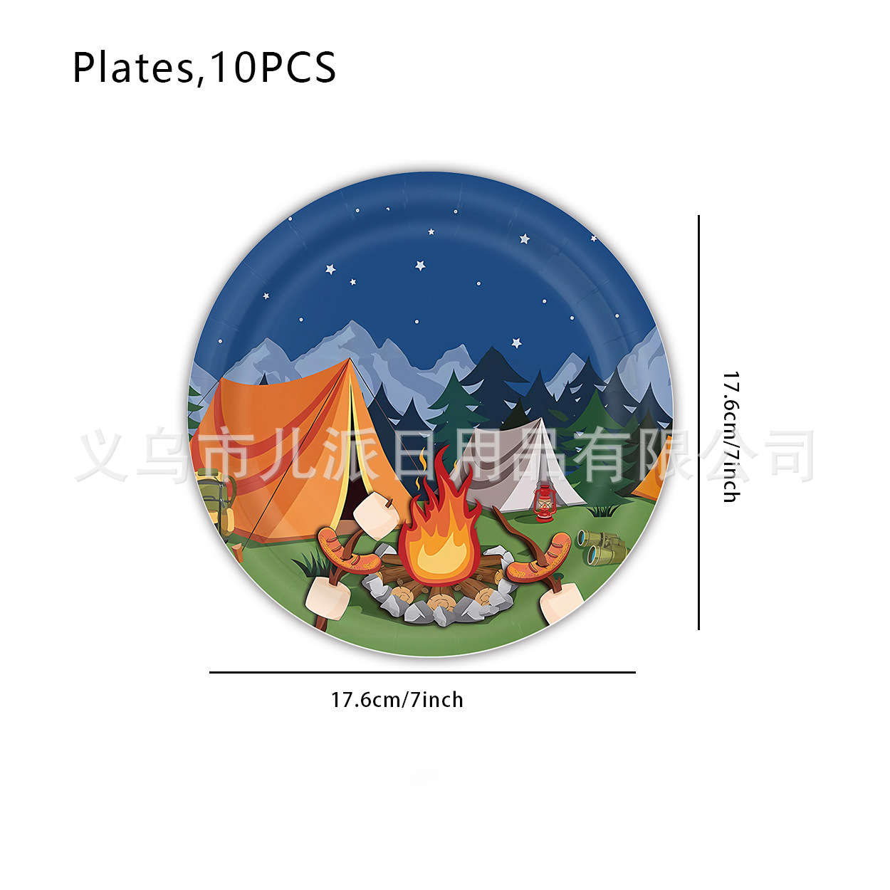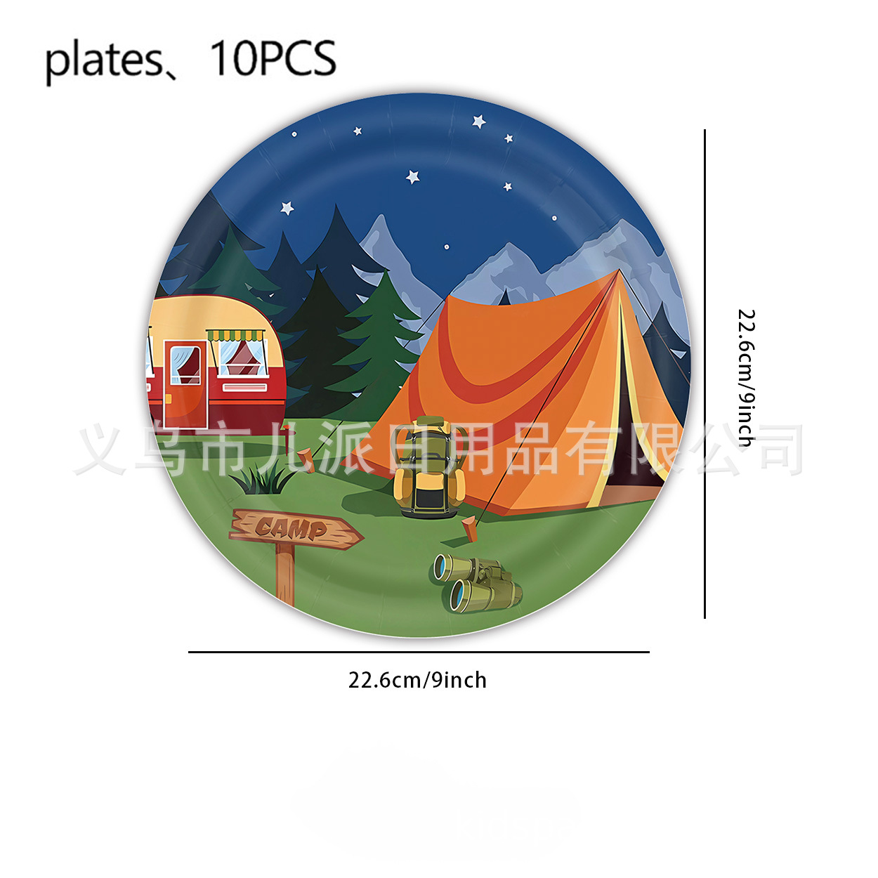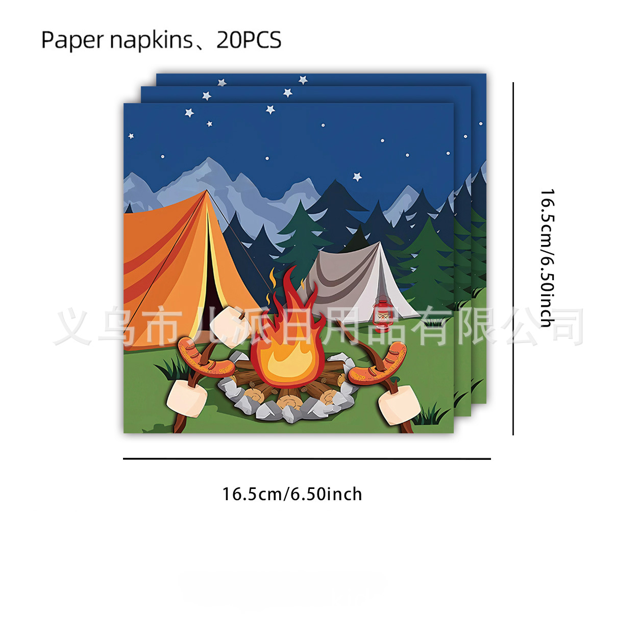 새로운 캠핑 테마 생일 파티 장식 일회용 식기 종이 접시 종이 컵 종이 타월 식탁보 칼, 포크 및 스푼스토어 가기