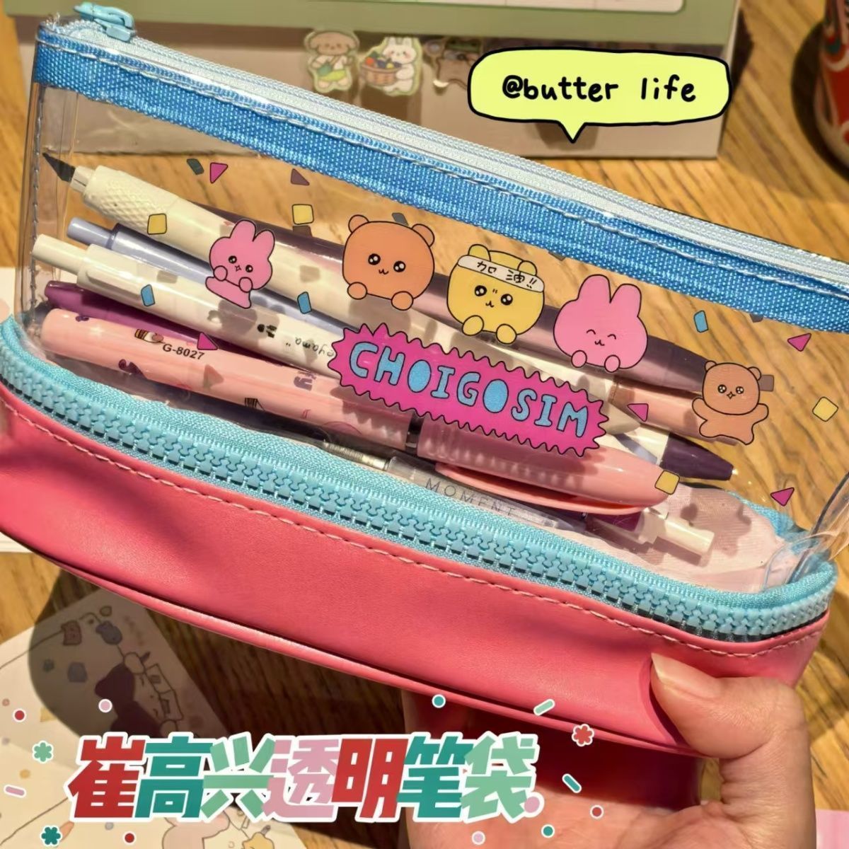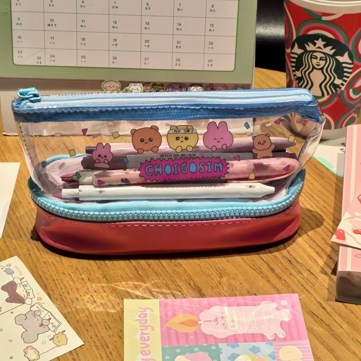 새로운 Cui 행복 시리즈 투명 통증 가방 연필 케이스 더블 레이어 다기능 대용량 문구 상자 저장 가방 소녀