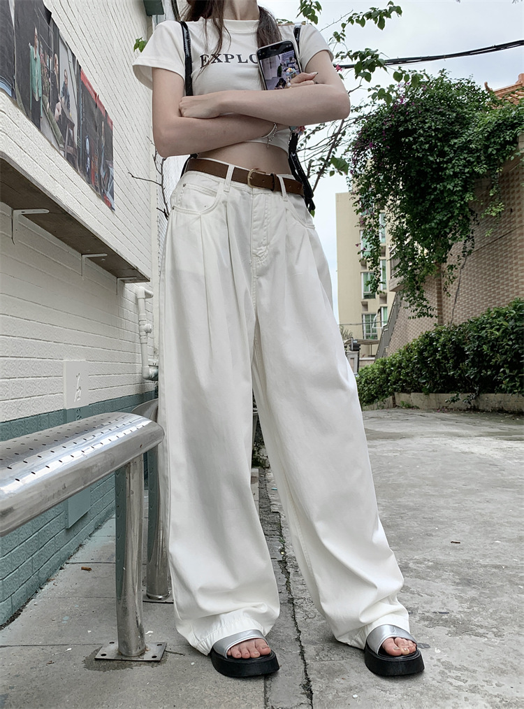 白色软牛仔长裤女装秋季新款低腰宽松直筒裤垂感阔腿拖地休闲裤子