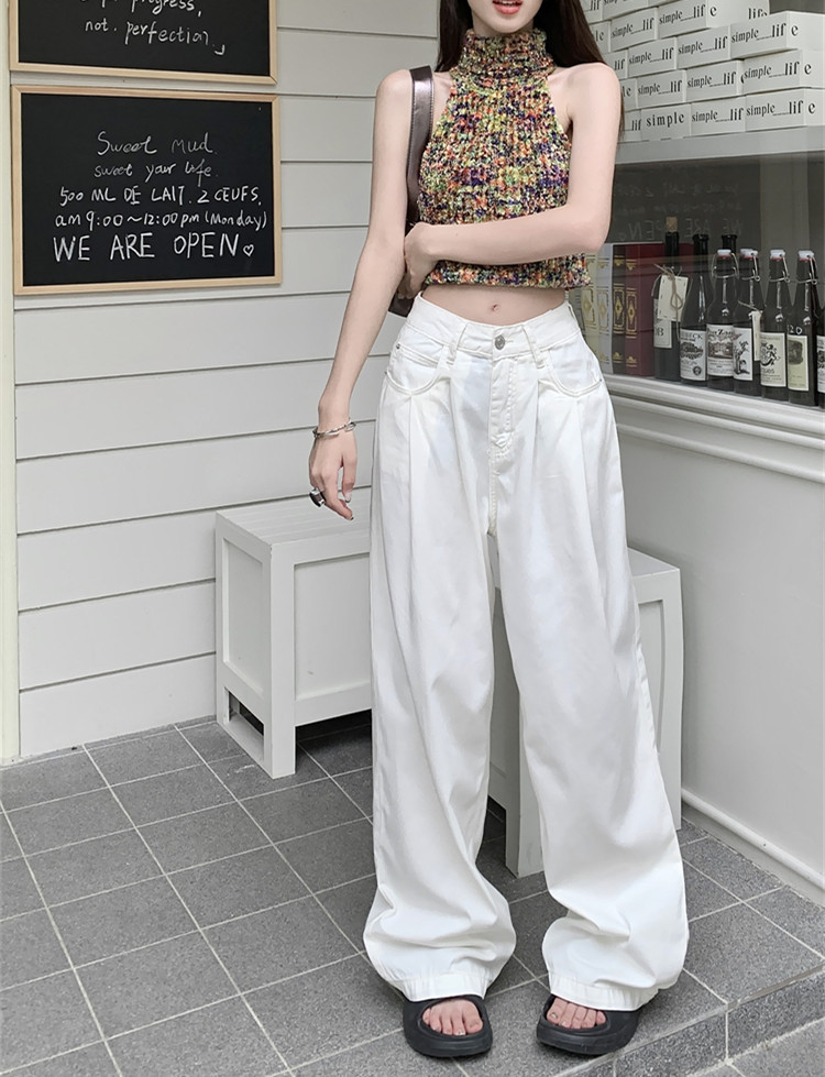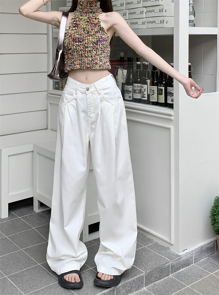 화이트 소프트 데님 바지 여성 가을 새로운 낮은 허리 느슨한 직선 다리 바지 딥 넓은 다리 바지