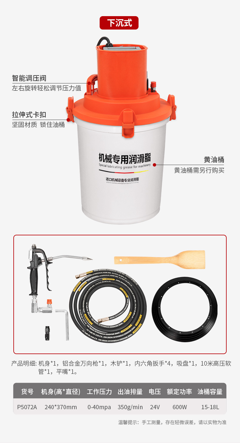 • 40L 고압 버전 + 4m 고압 오일 파이프 (15KG/18KG 오일 드럼에 적용 가능)