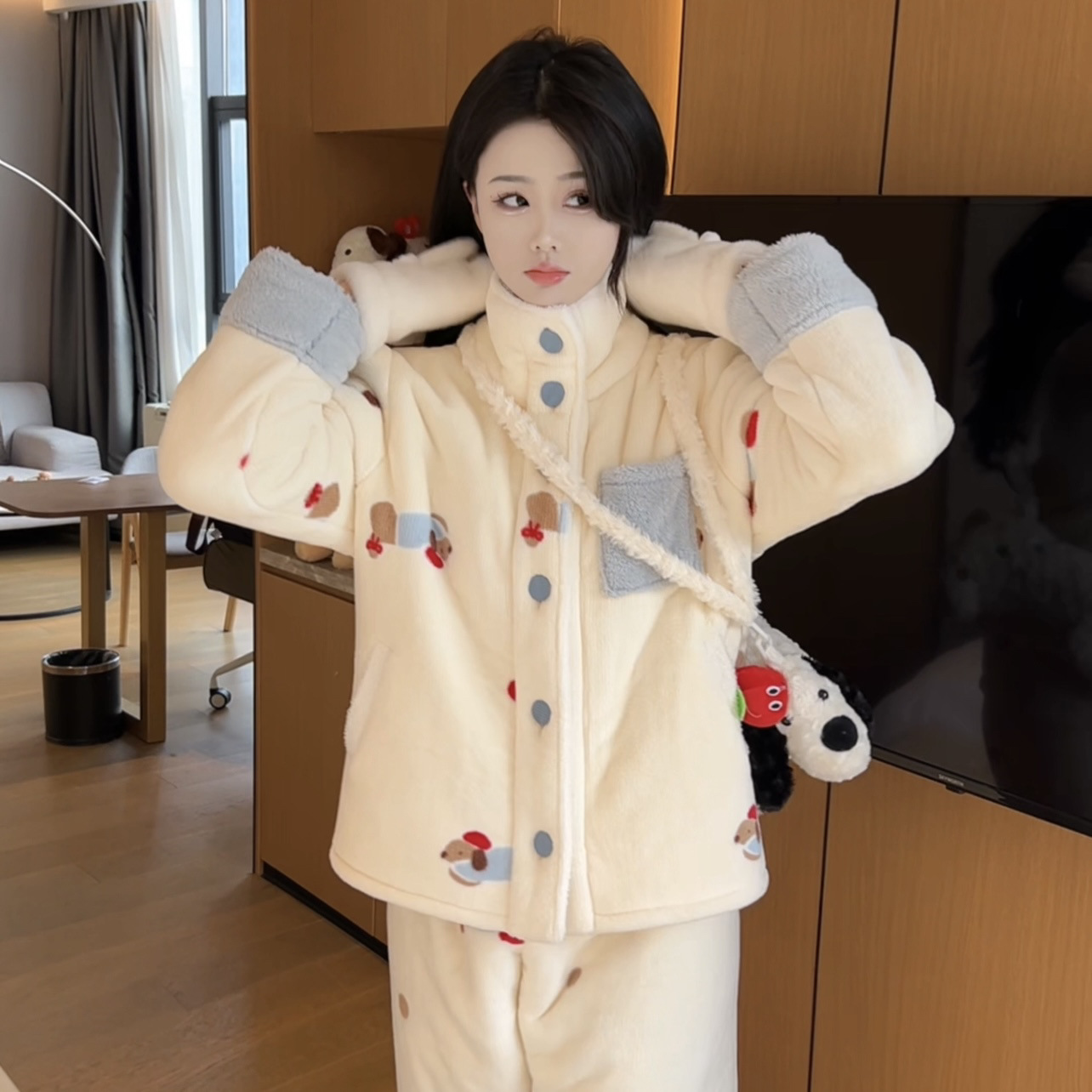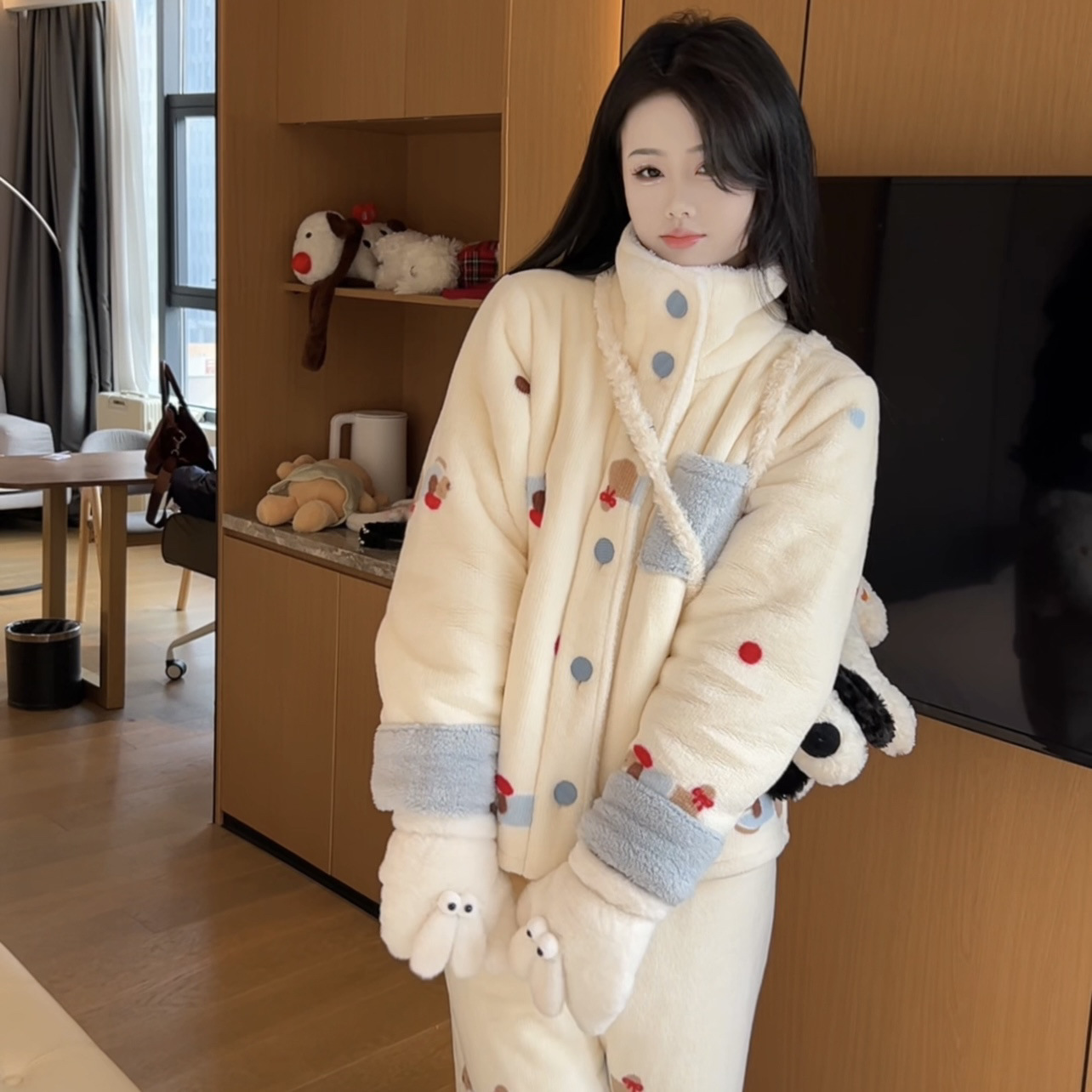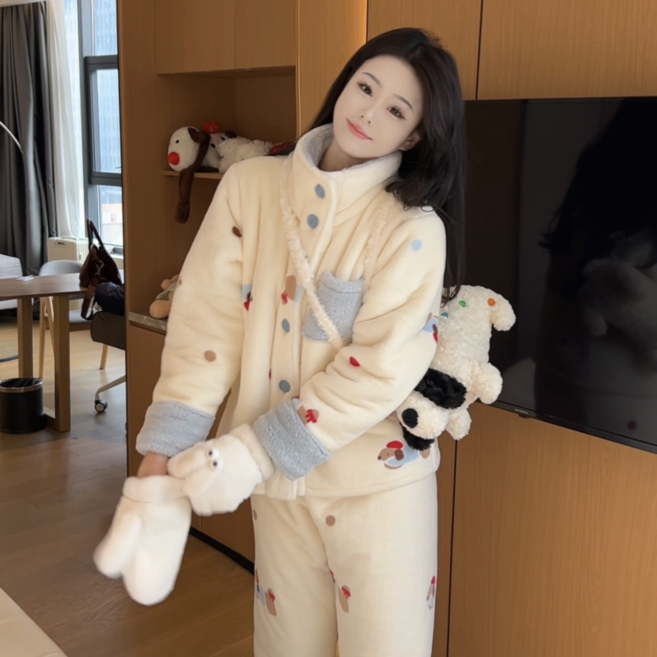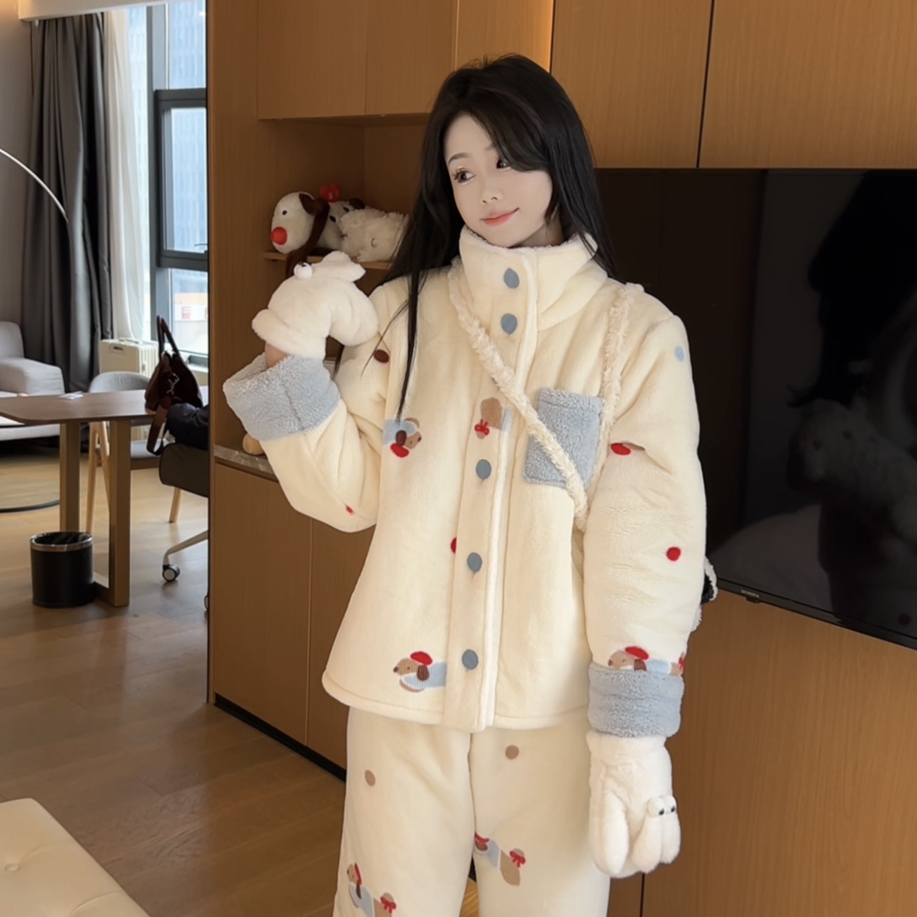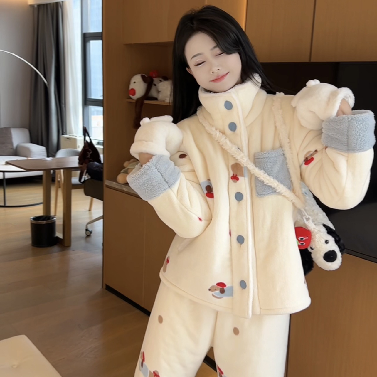 겨울 기모 3 층 두꺼운 따뜻한 귀여운 우아한 슬림 잠옷 홈 의류 여성용 캐주얼 아웃웨어 소프트 플러시스토어 가기