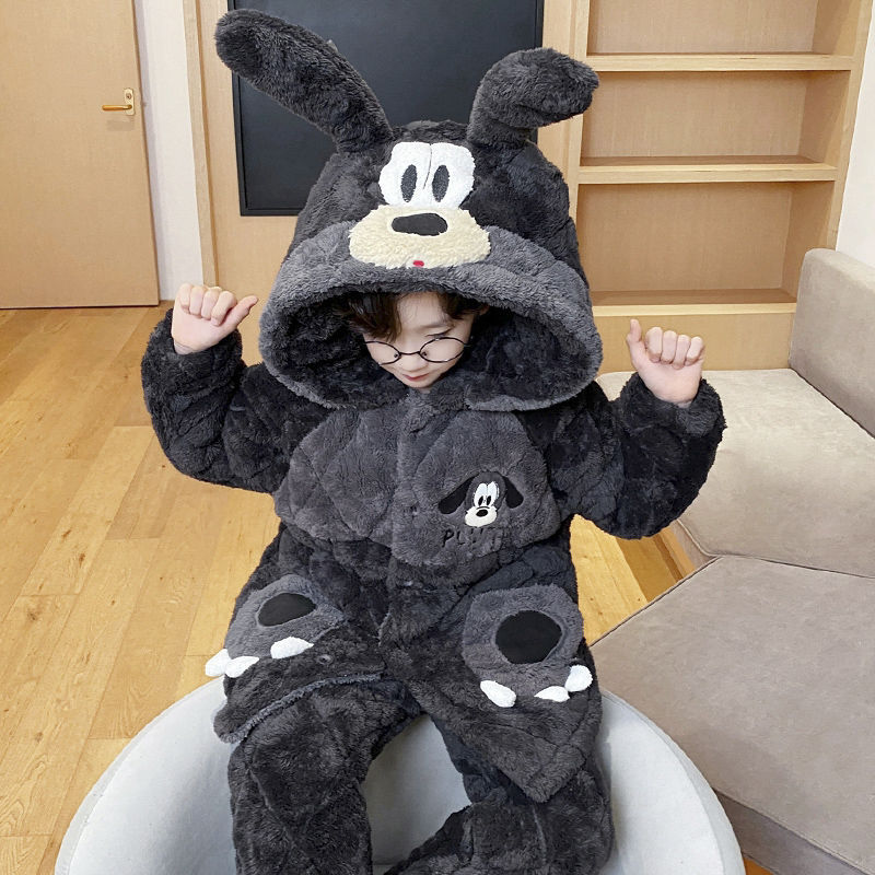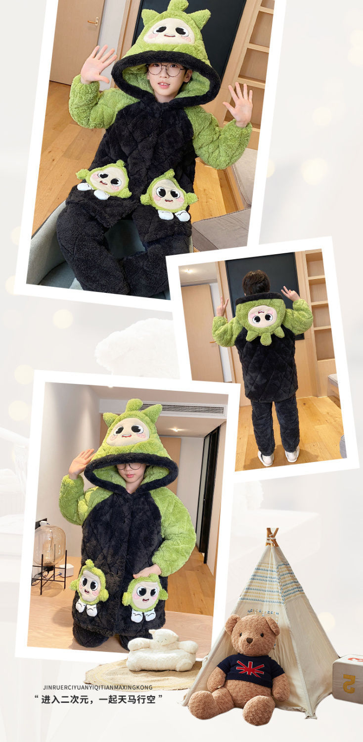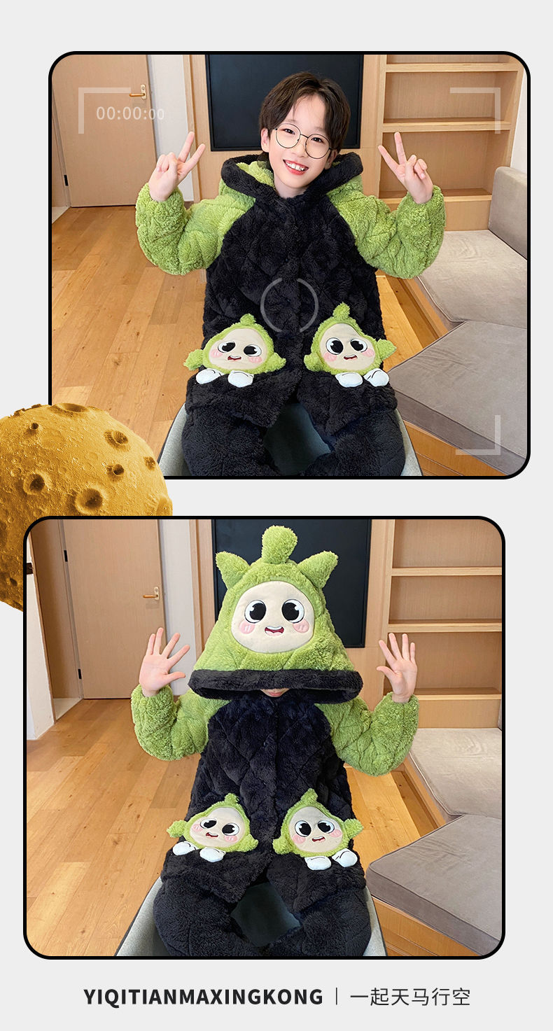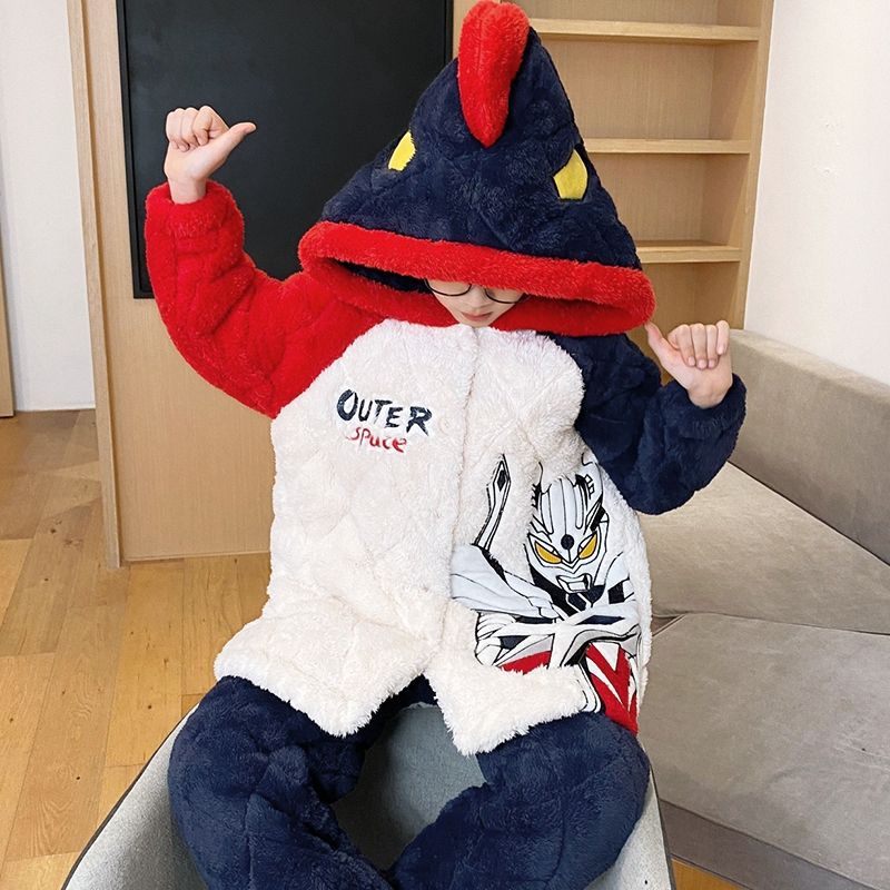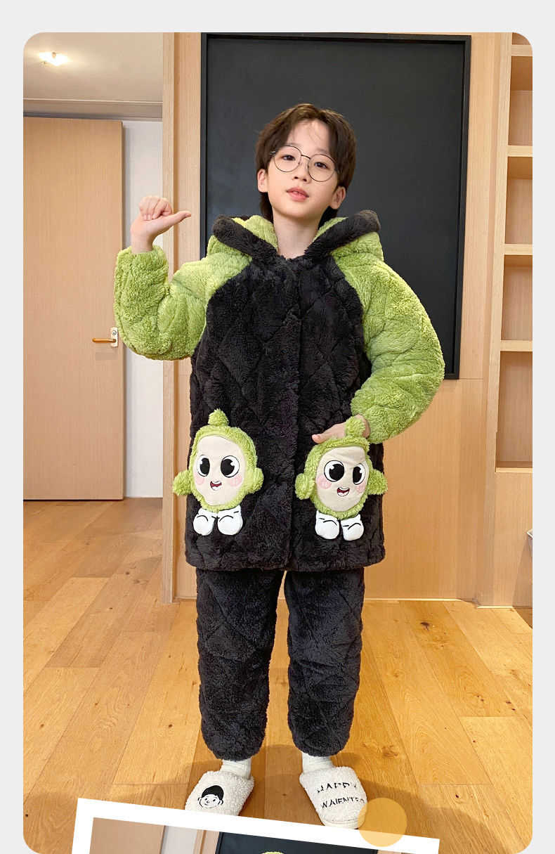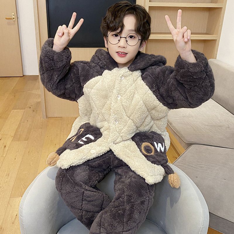 소년을위한 달걀 어린이 잠옷 겨울 두꺼운 3 층 퀼트 산호 양털 새 스타일 홈 옷 큰 어린이와 소년을위한 세트