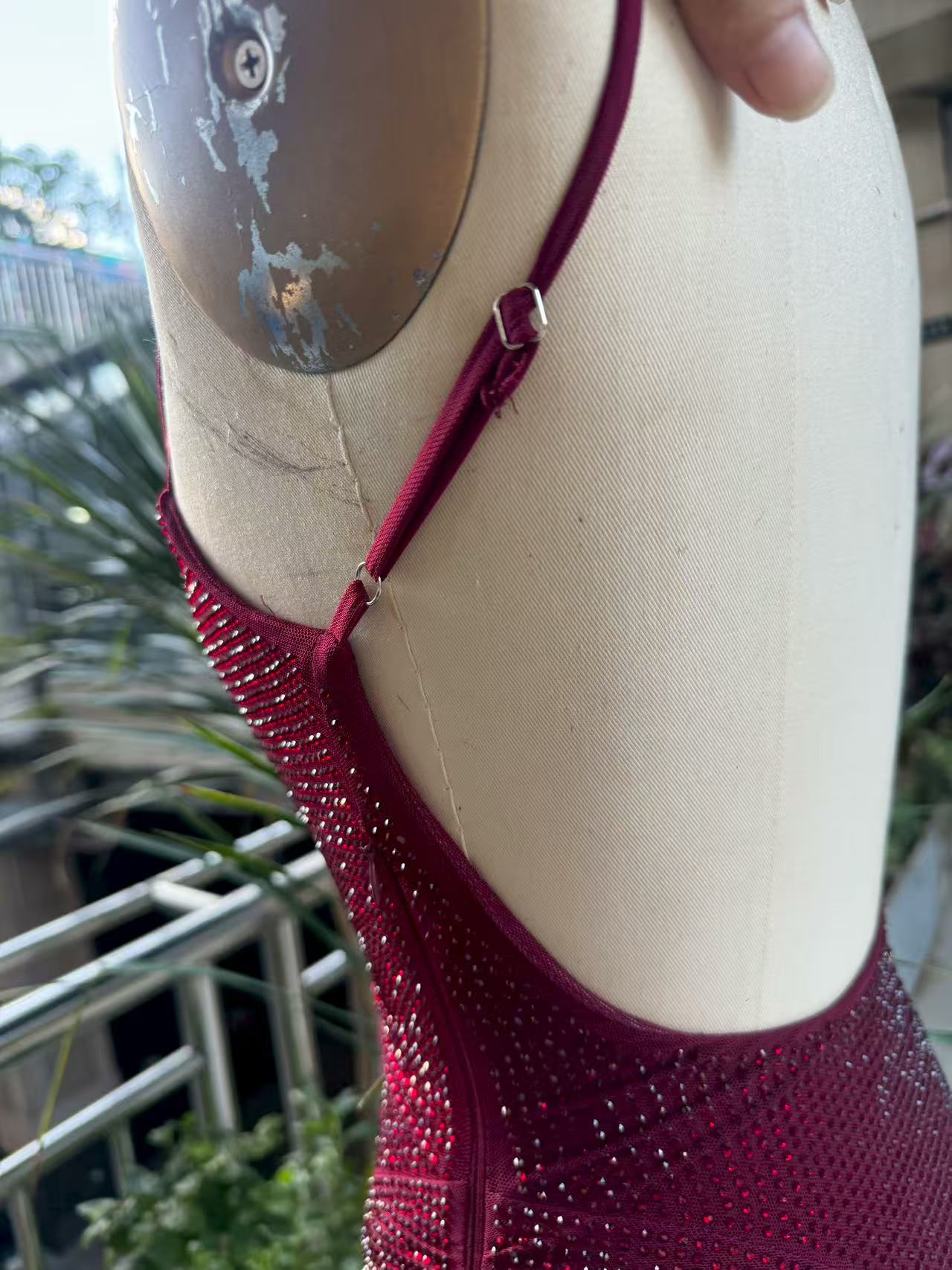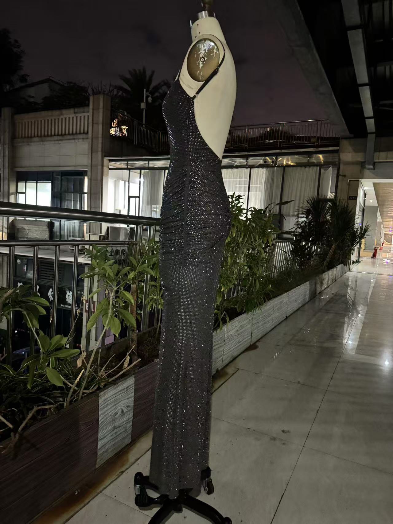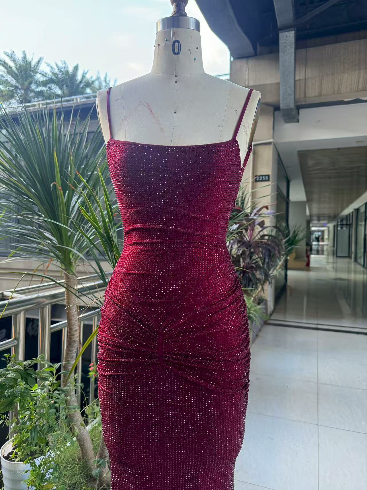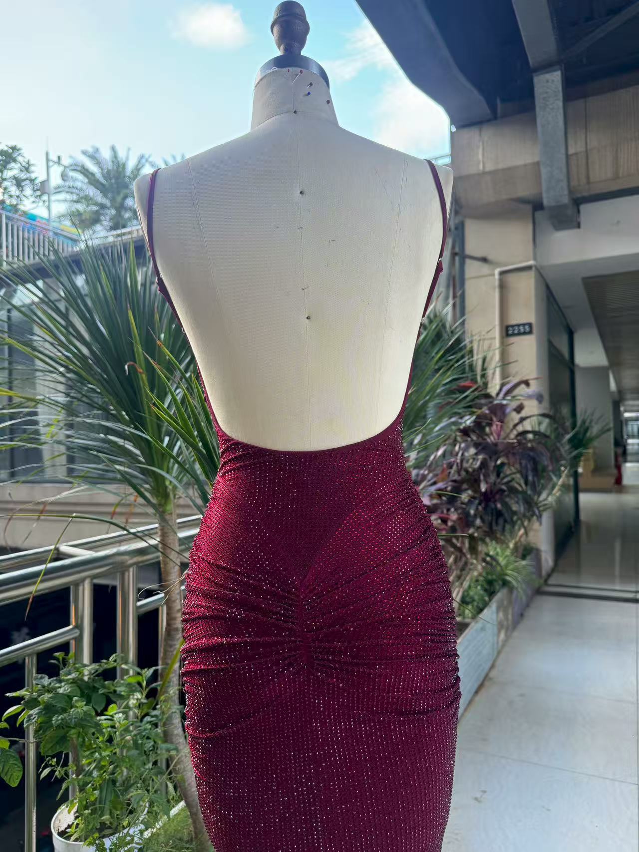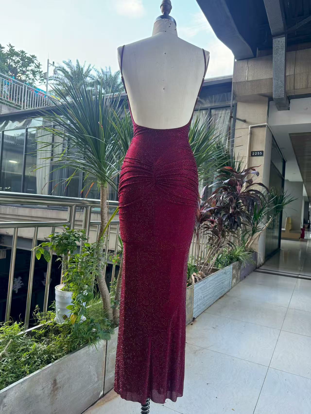 프랑스 스트랩 라인스톤 백리스 플리츠 섹시 슬림 핏 사교계 우아한 원피스 원피스 파티 여성용 롱 원피스스토어 가기