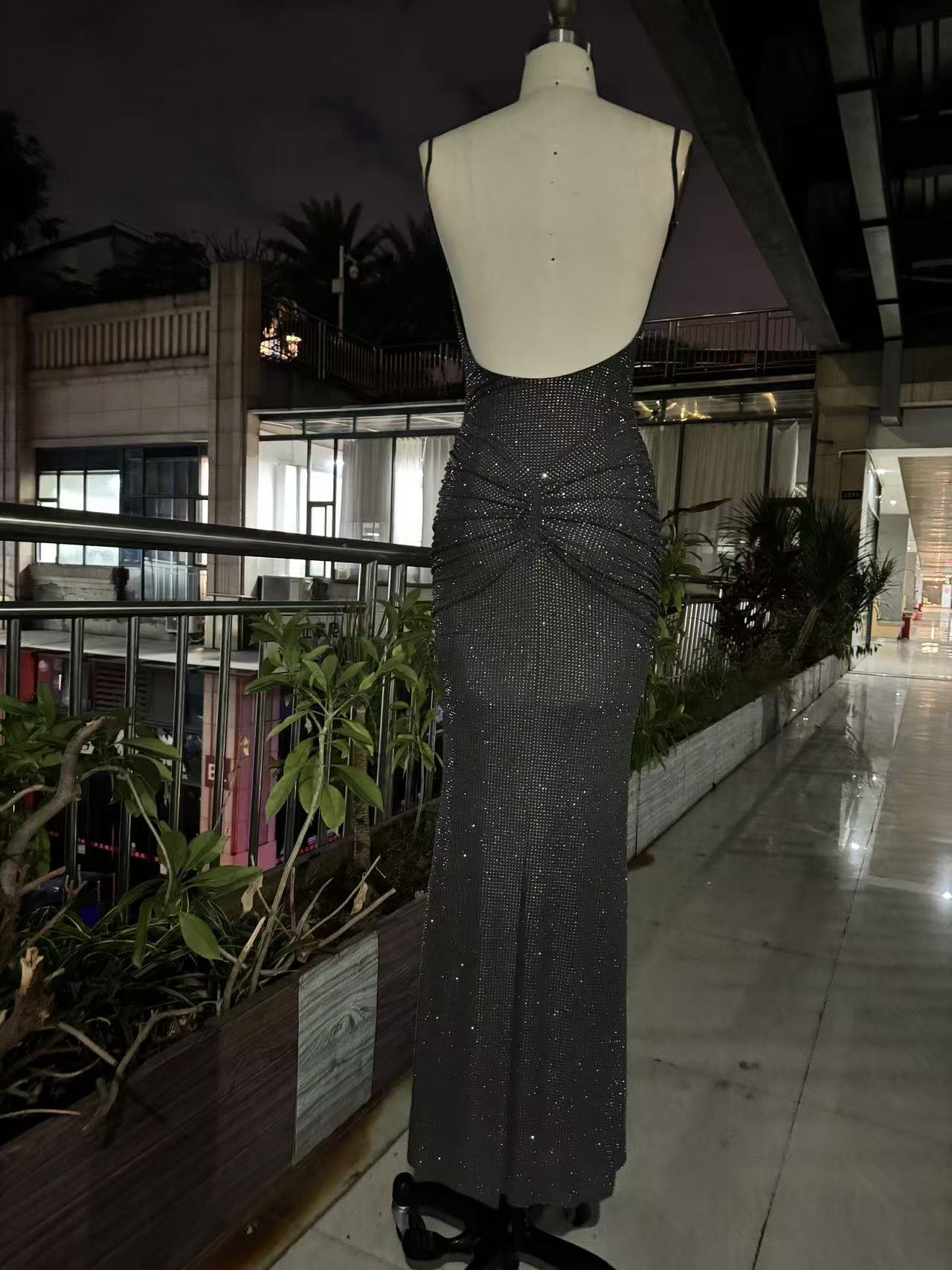 프랑스 스트랩 라인스톤 백리스 플리츠 섹시 슬림 핏 사교계 우아한 원피스 원피스 파티 여성용 롱 원피스