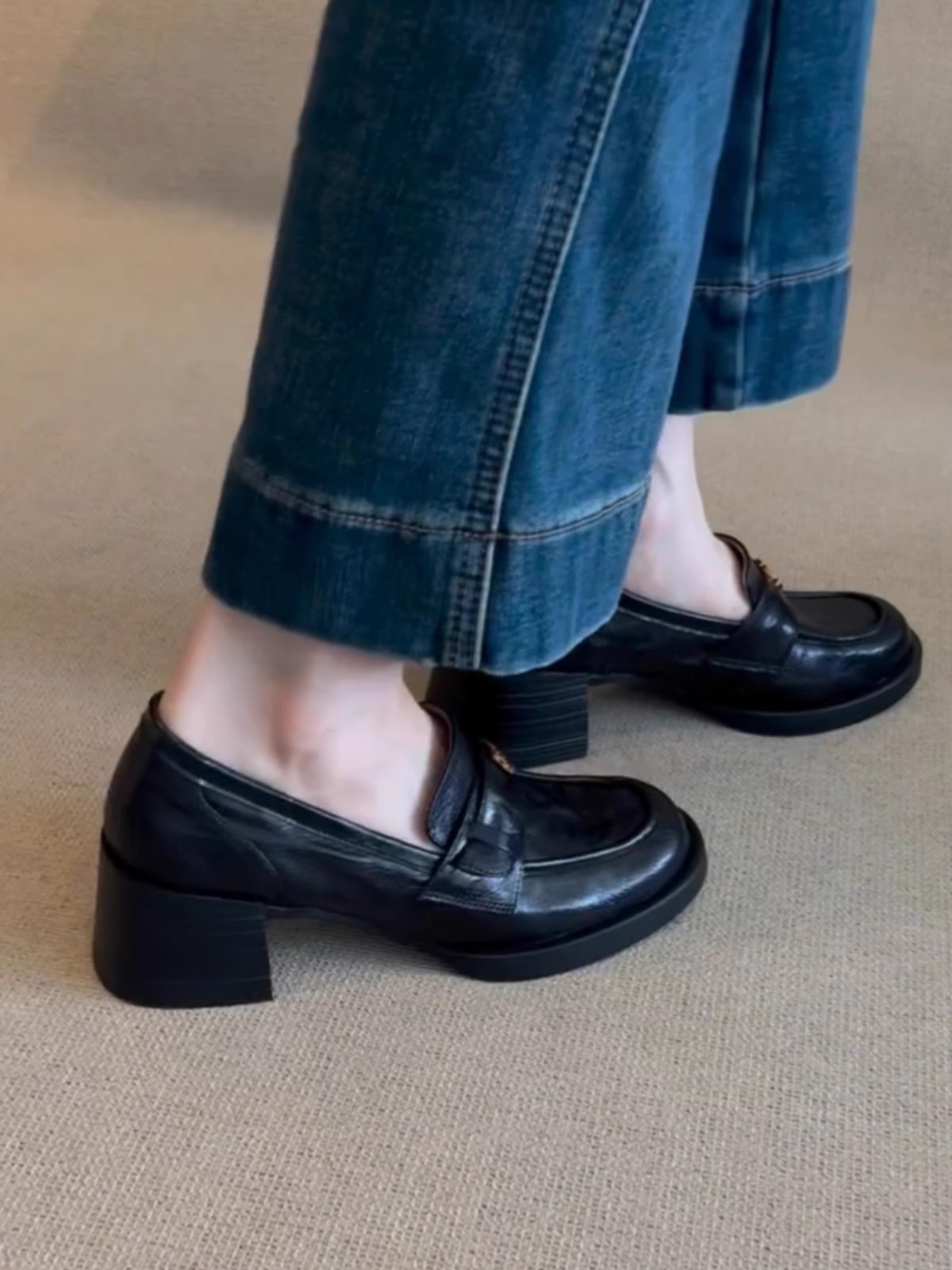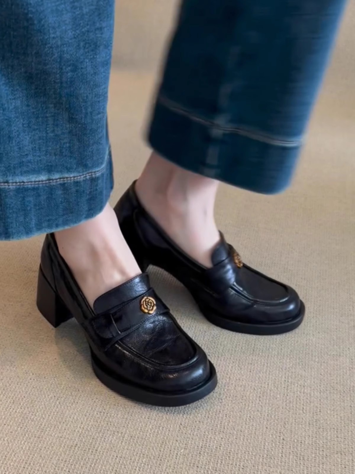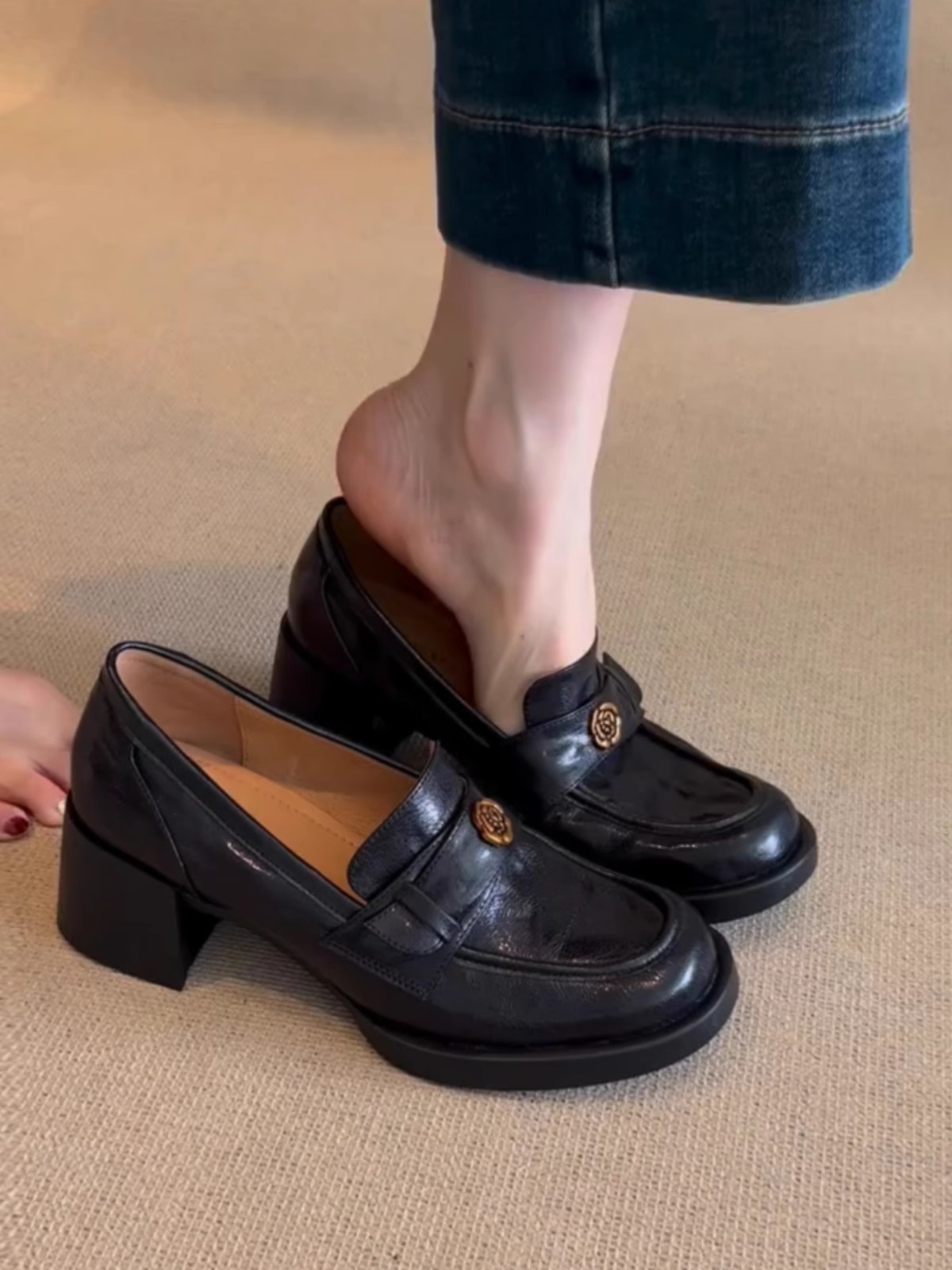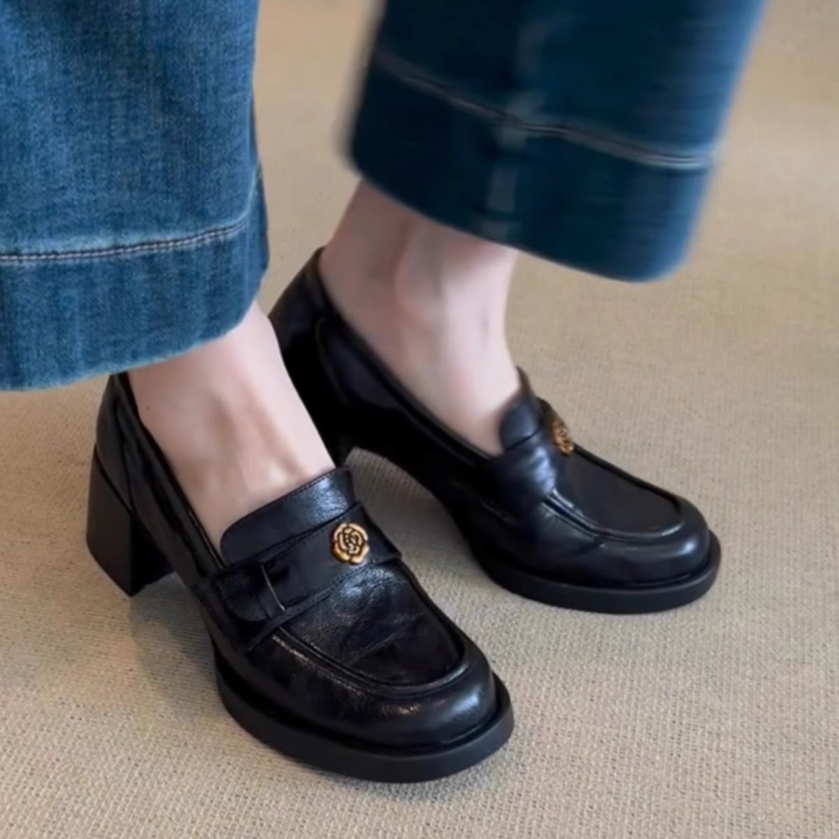 양가죽 버전 ~ 정품 가죽 동백 블랙 하이힐 로퍼 여성의 2025 새로운 작은 가죽 신발 두꺼운 뒤꿈치 기질 신발스토어 가기