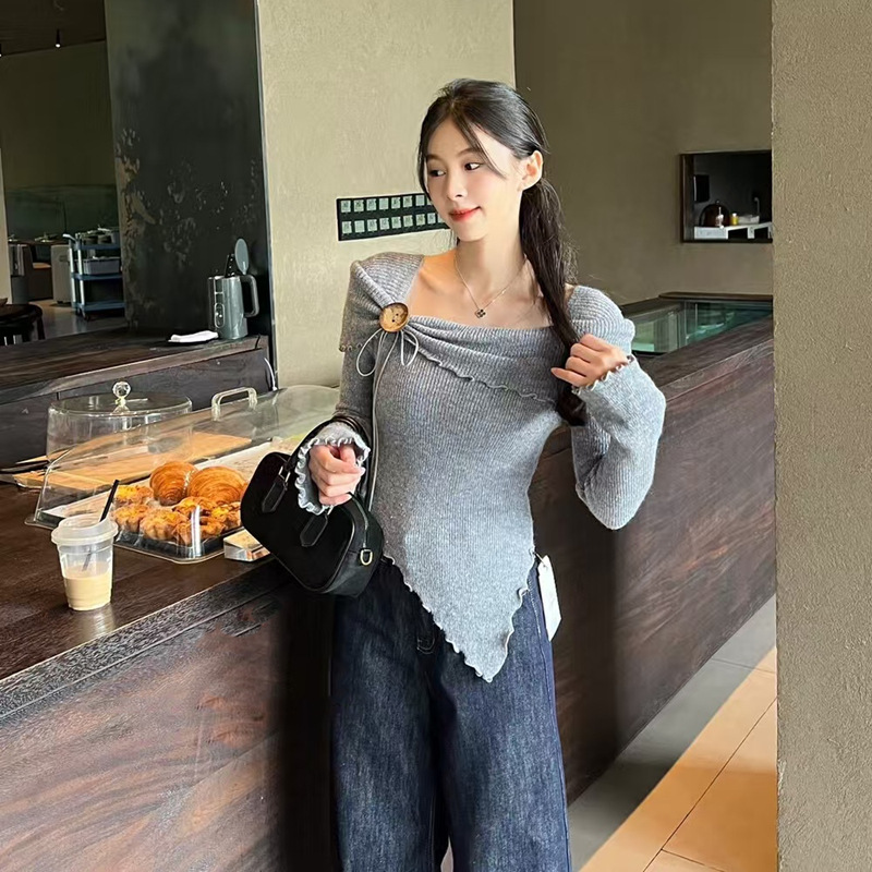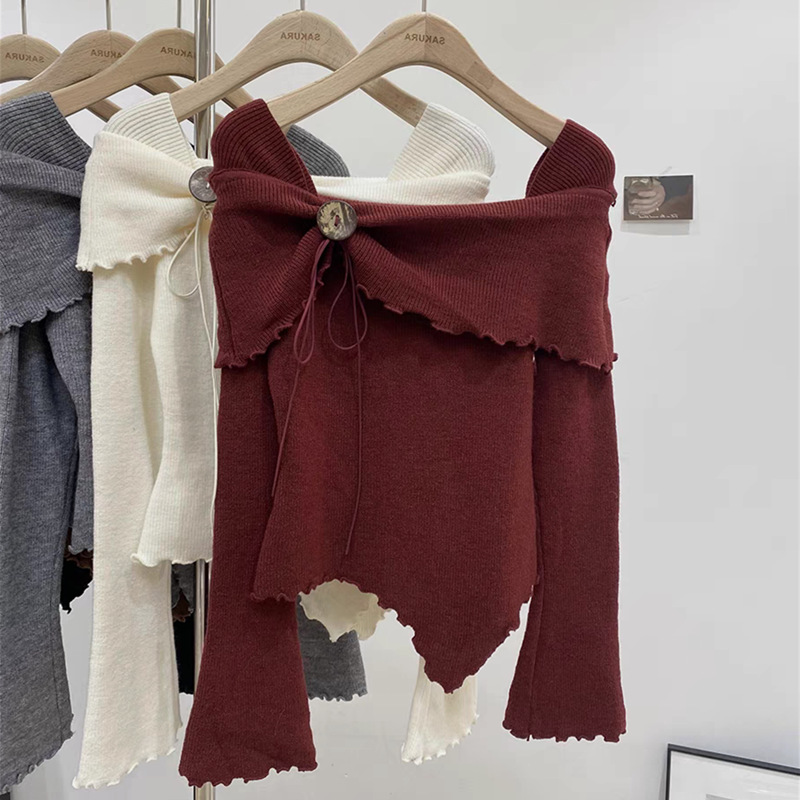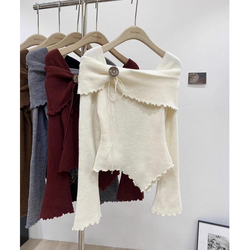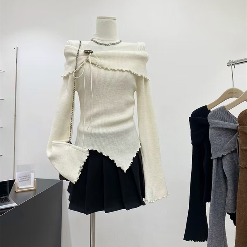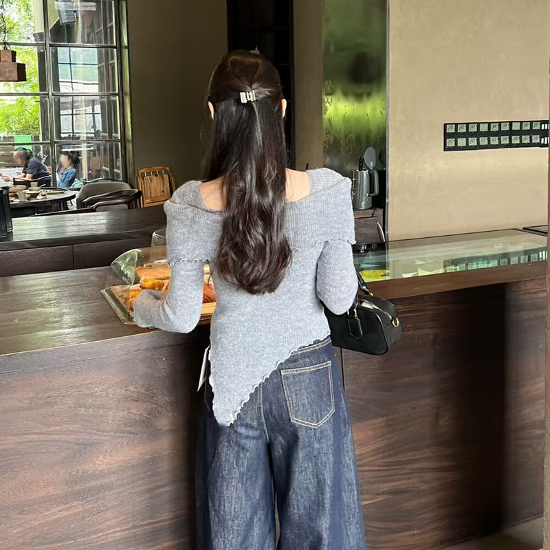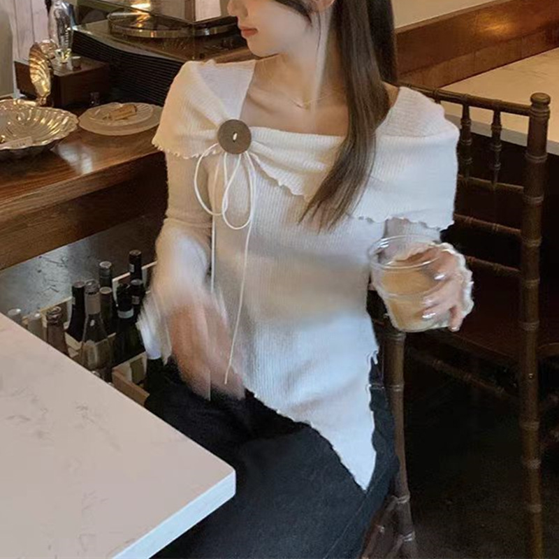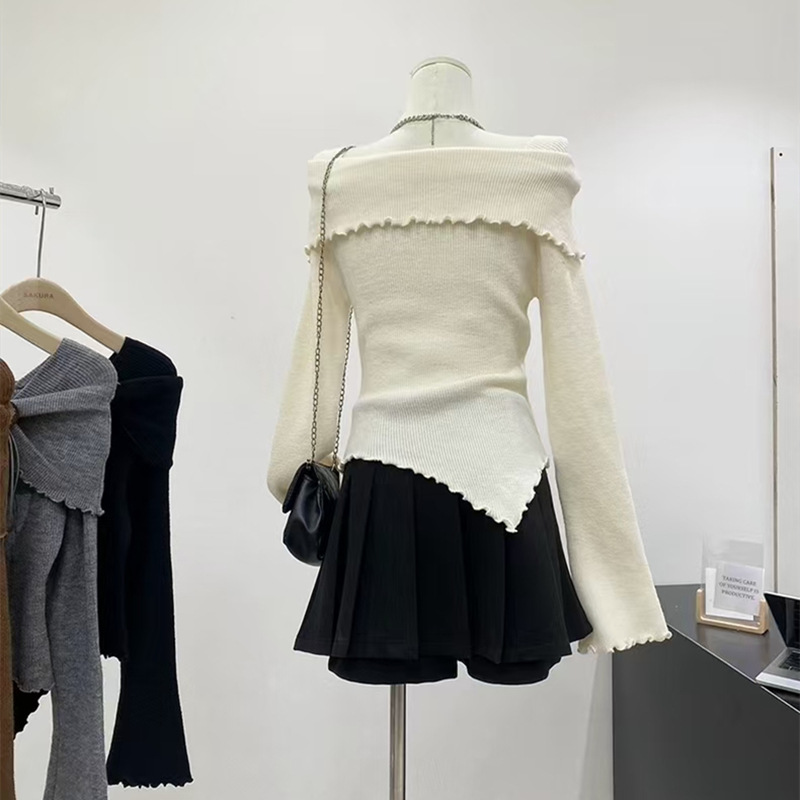 프랑스 스타일 우아한 불규칙한 틈새 스웨터 여성의 가을과 겨울 새로운 광장 칼라 긴 소매 어깨 셔츠 탑