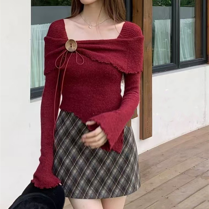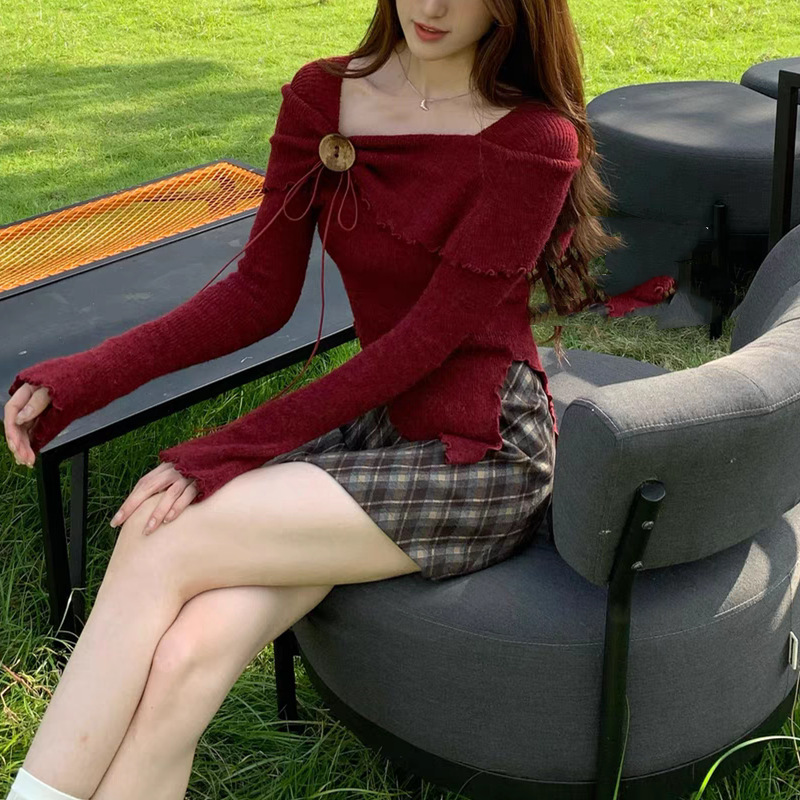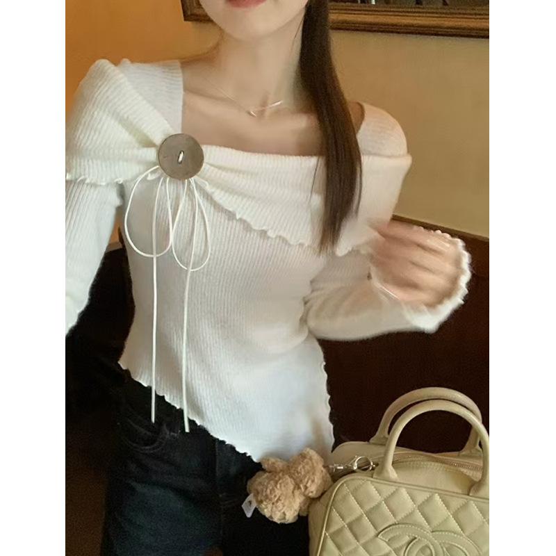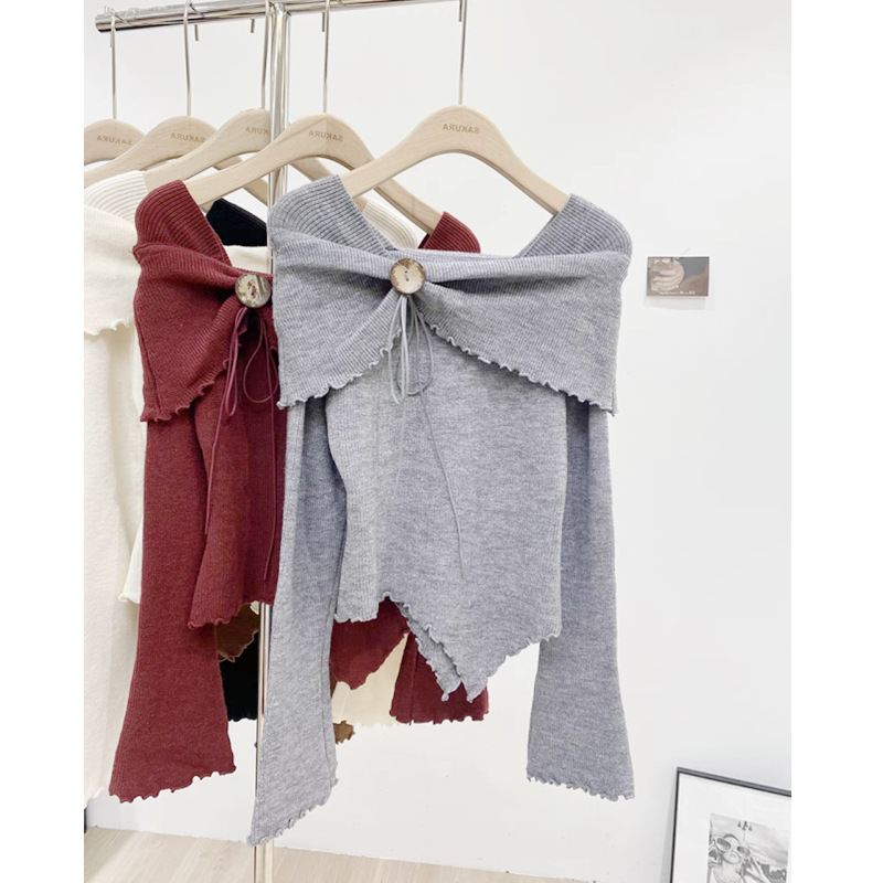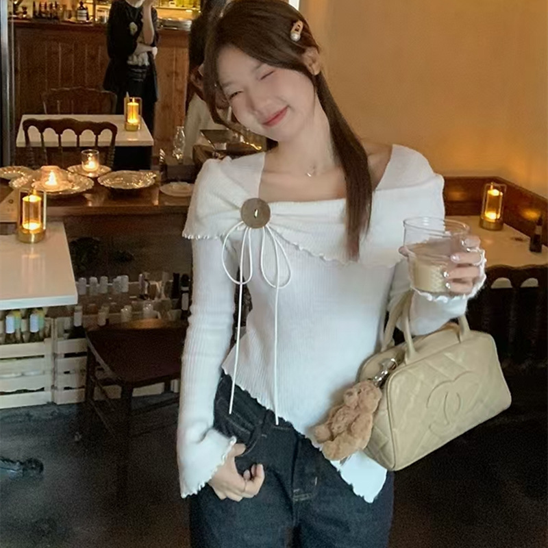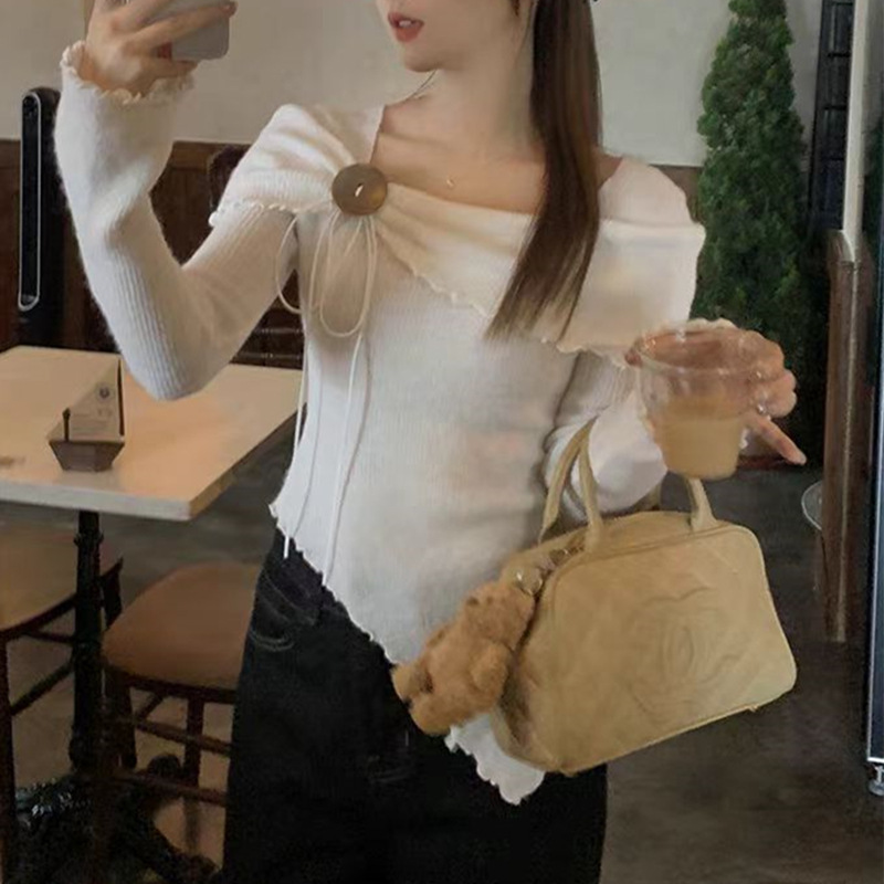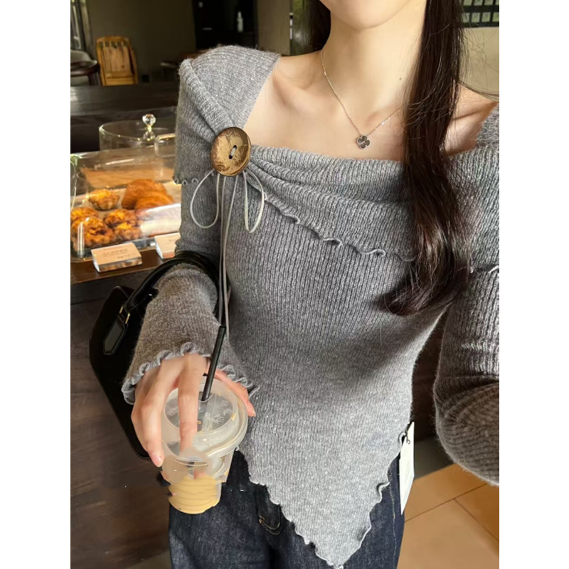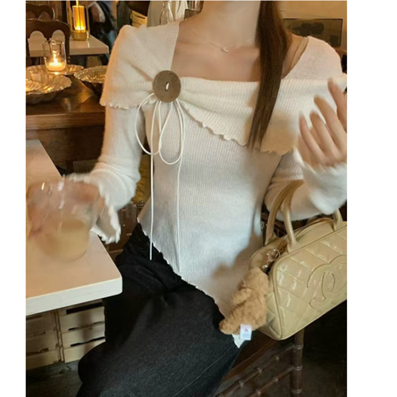 프랑스 스타일 우아한 불규칙한 틈새 스웨터 여성의 가을과 겨울 새로운 광장 칼라 긴 소매 어깨 셔츠 탑
