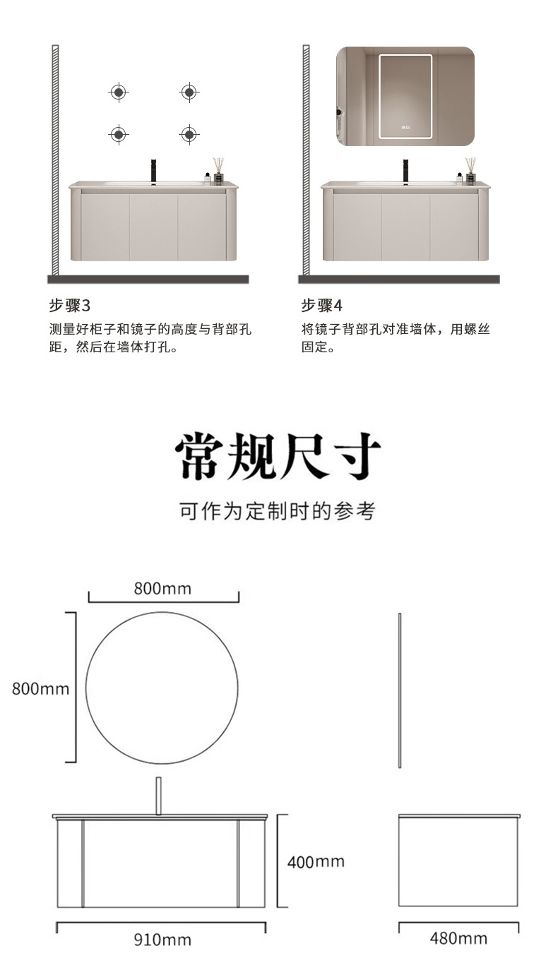 • 크림 화이트 91CM 세라믹 일체형 세면대 + 수납용 둥근 거울 캐비닛
