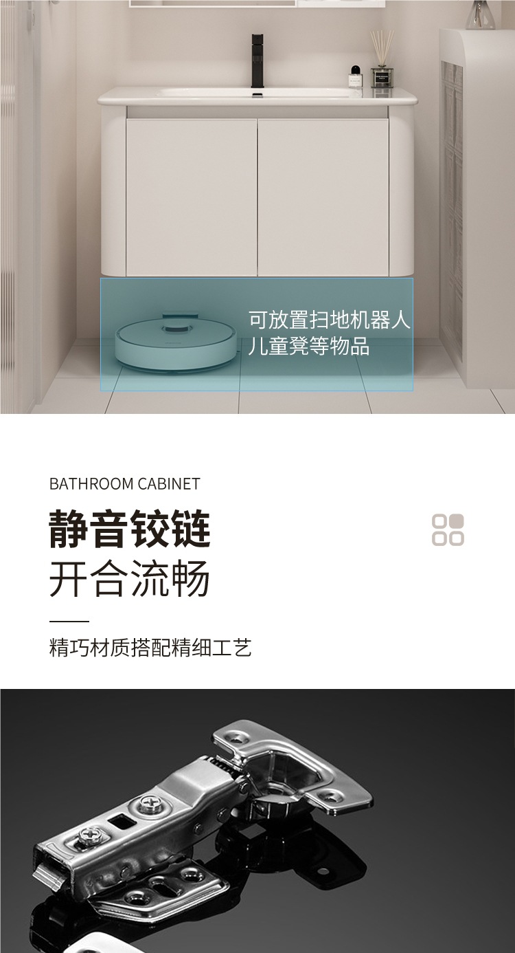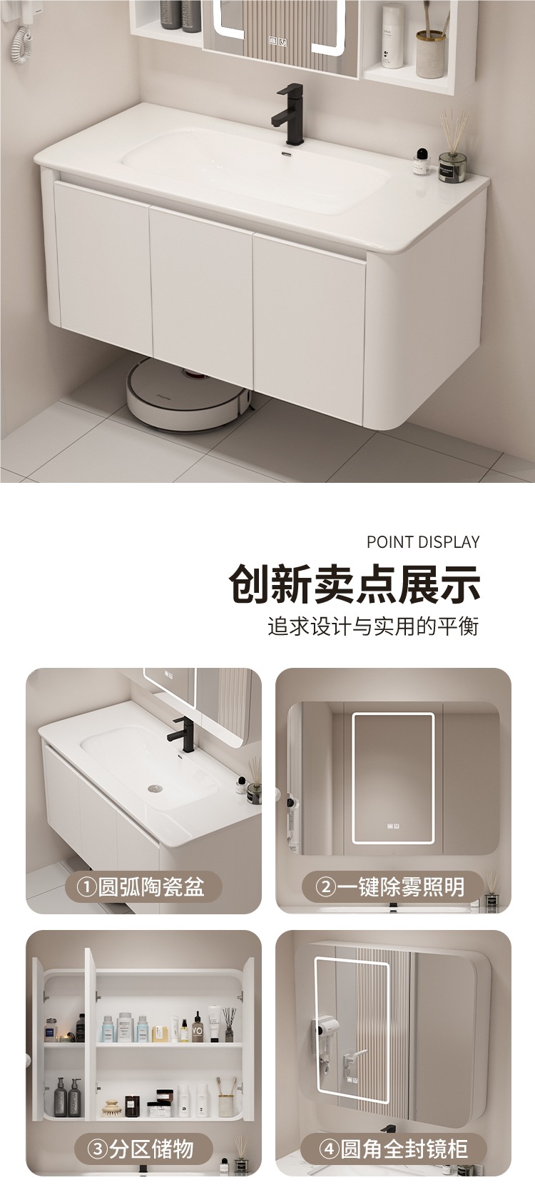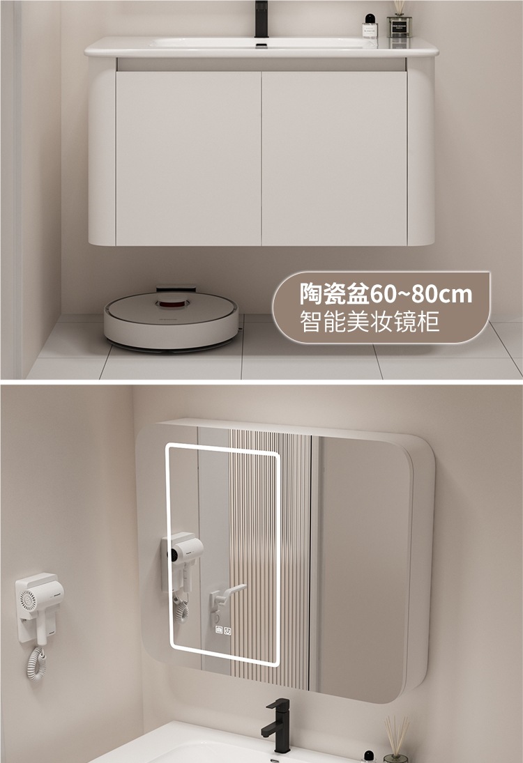 • 크림 화이트 81CM 세라믹 일체형 세면대 + 스마트 라운드 코너 거울 캐비닛