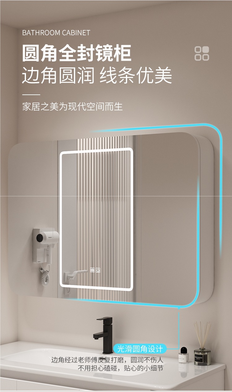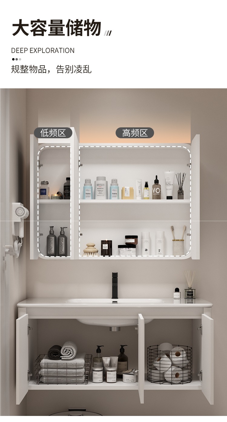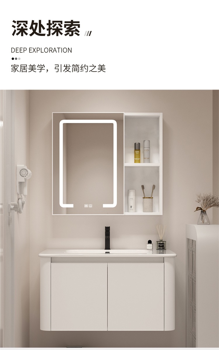 • 크림 화이트 91CM 세라믹 일체형 세면대 + 스마트 라운드 코너 거울 캐비닛