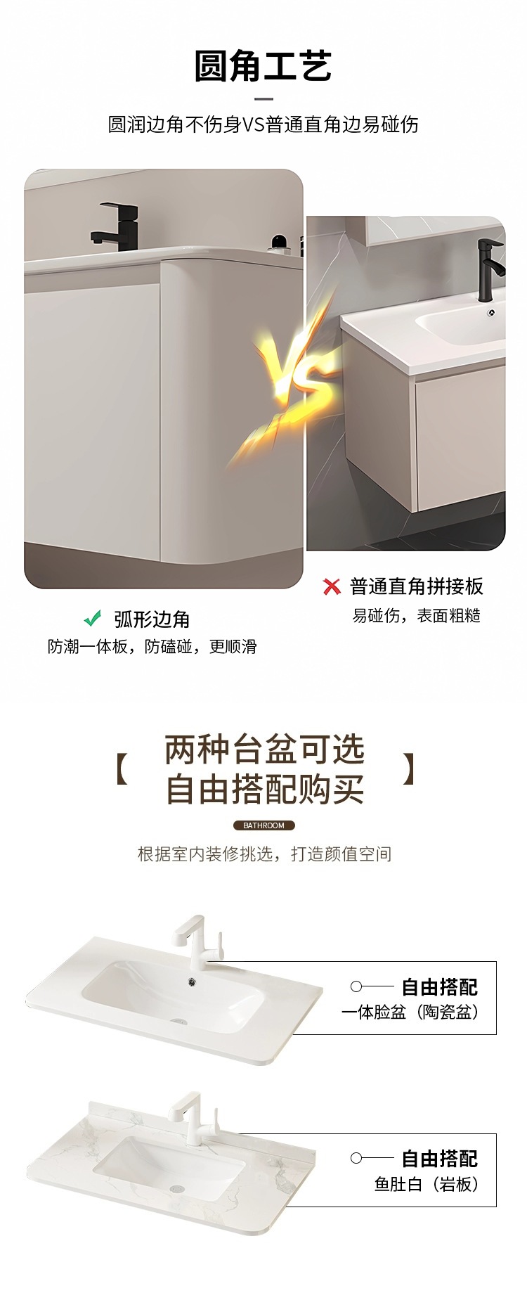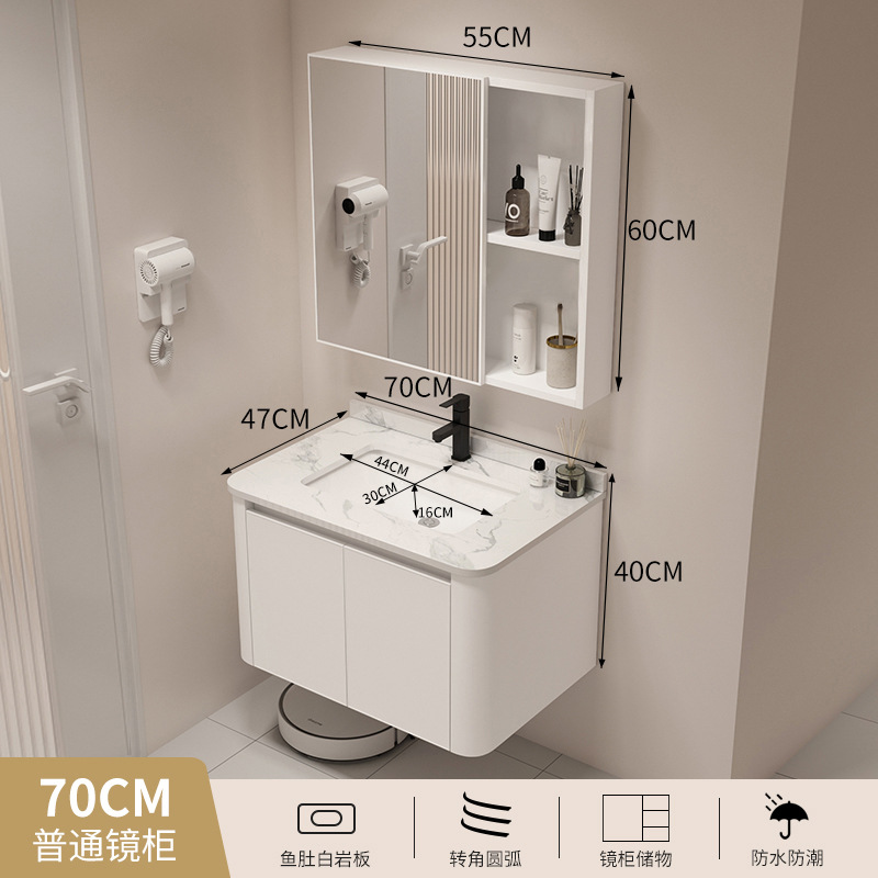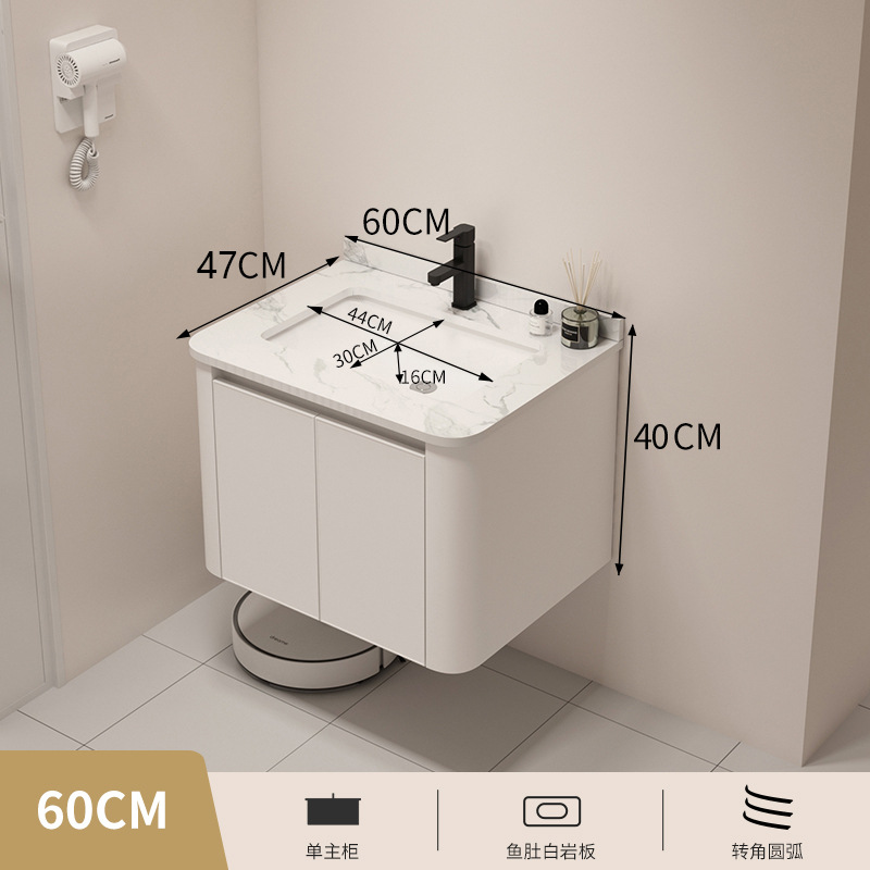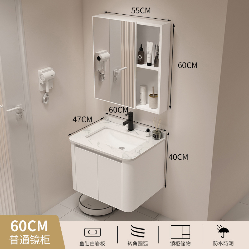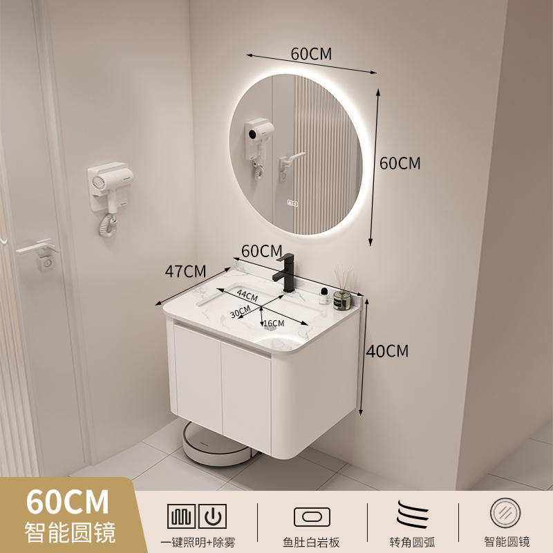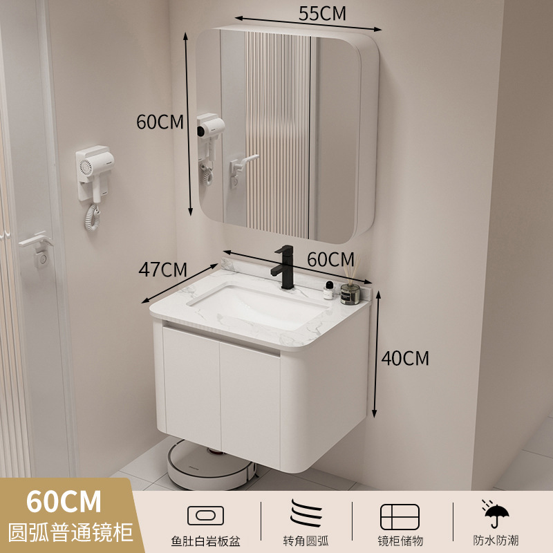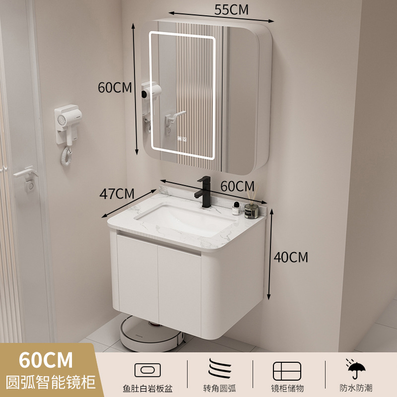 • 크림 화이트 60CM 피쉬 벨리 화이트 슬레이트 세면대 + 스마트 라운드 코너 거울 캐비닛