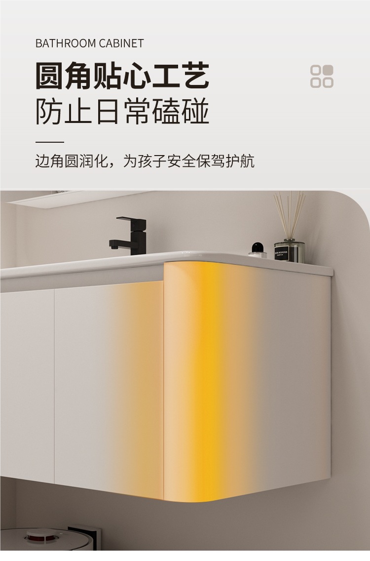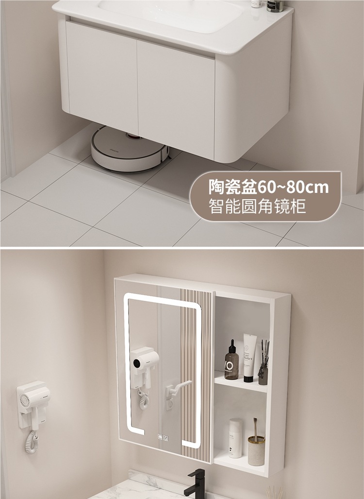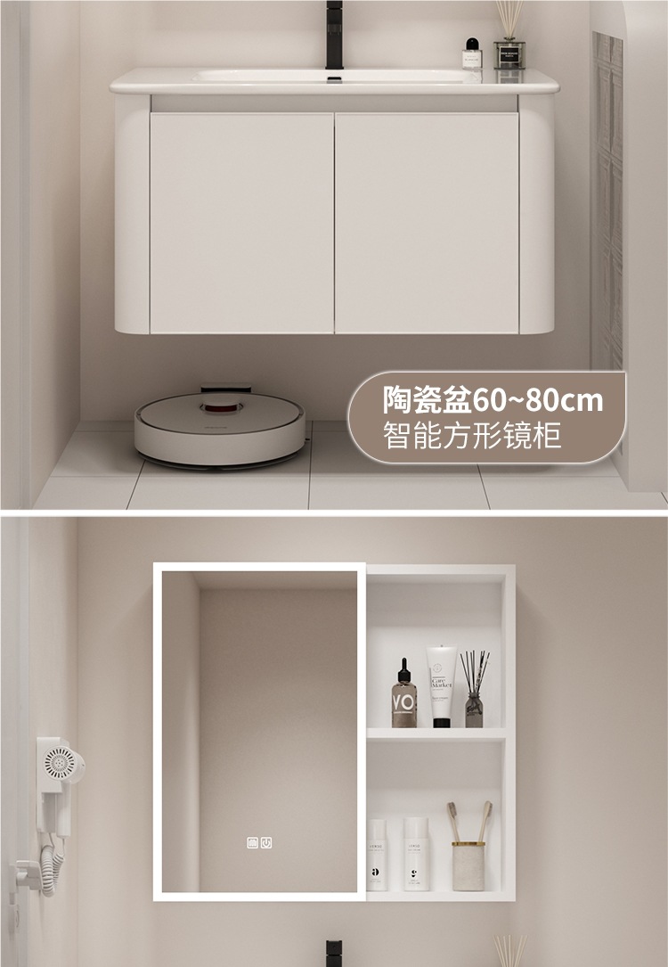 • 크림 화이트 61CM 세라믹 일체형 세면대 + 스마트 라운드 코너 거울 캐비닛