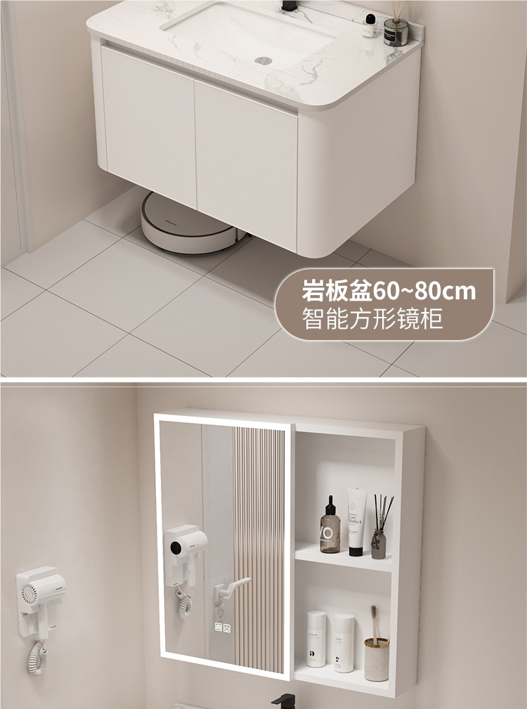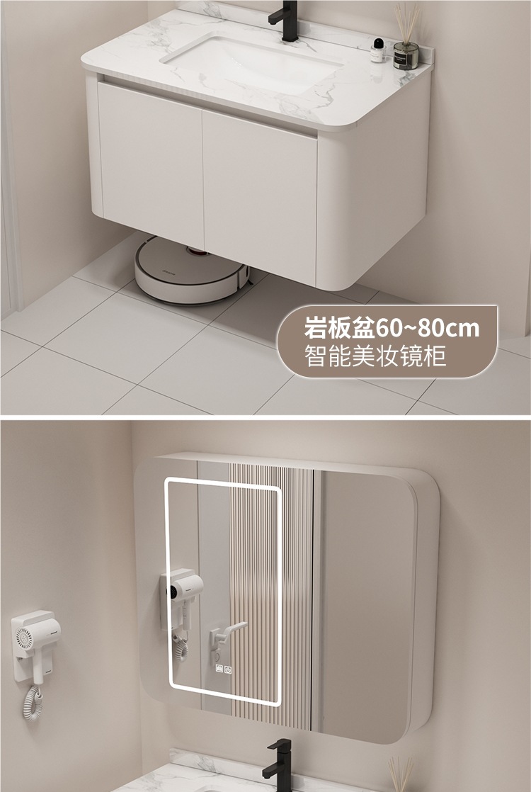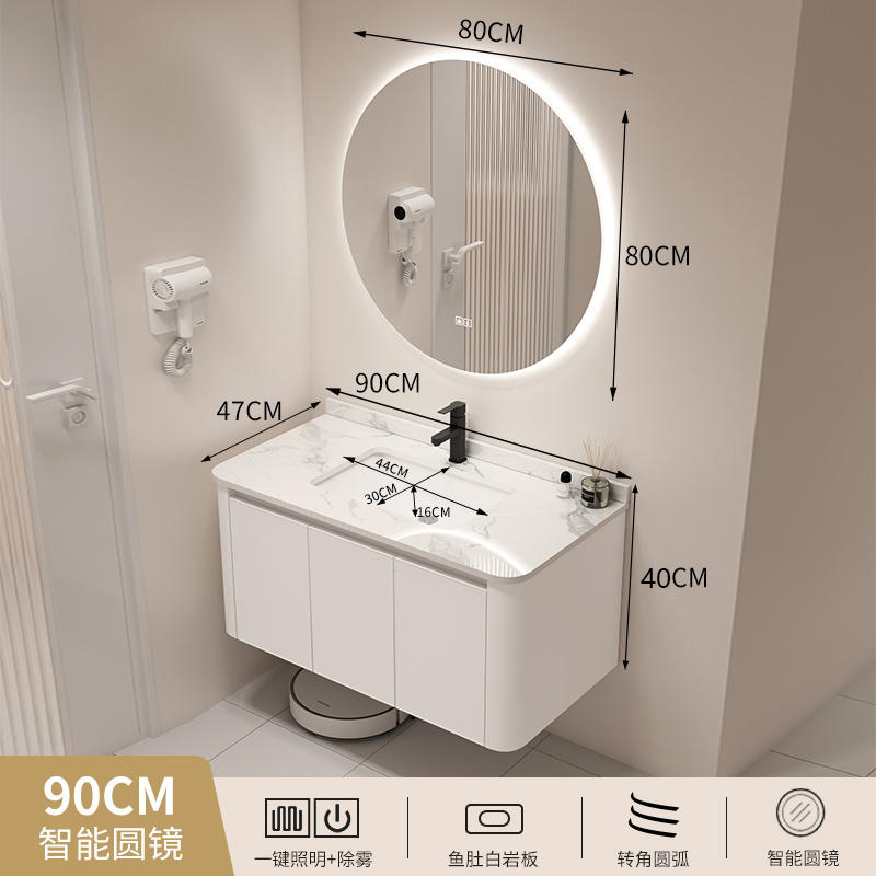 • 크림 화이트 80CM 피쉬 벨리 화이트 슬레이트 세면대 + 스마트 라운드 코너 거울 캐비닛