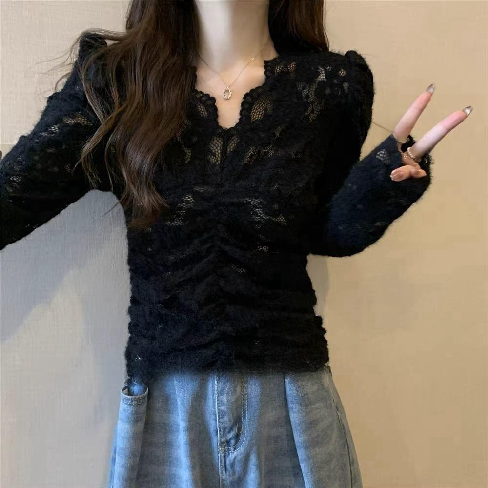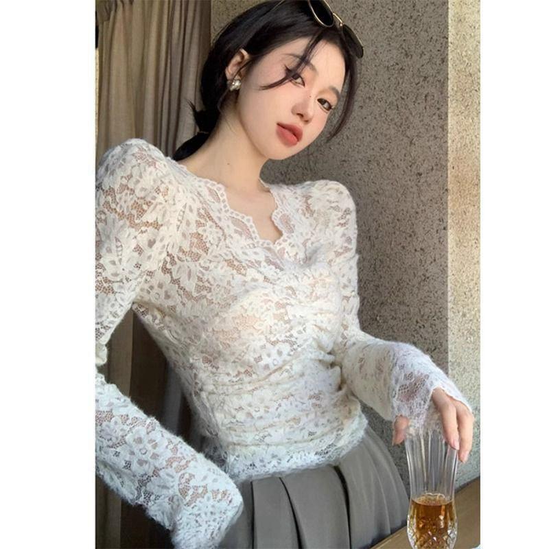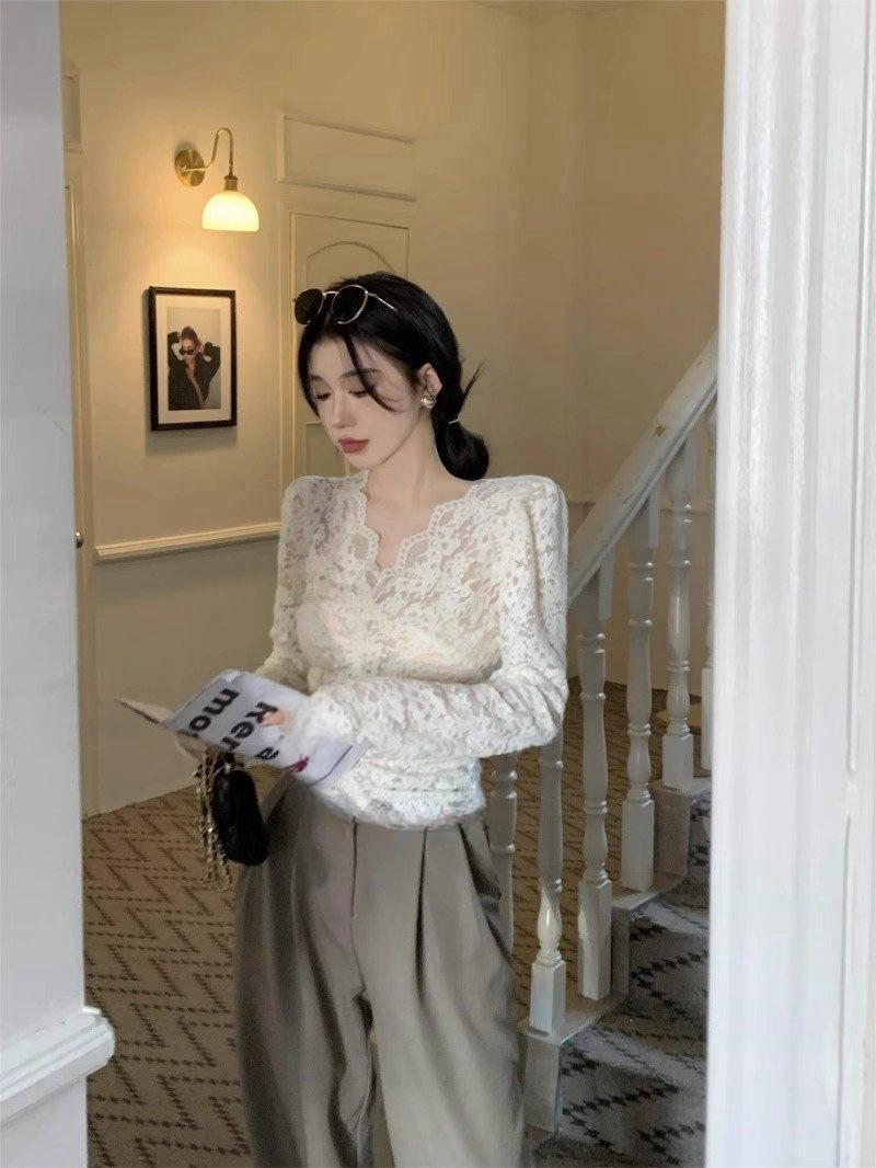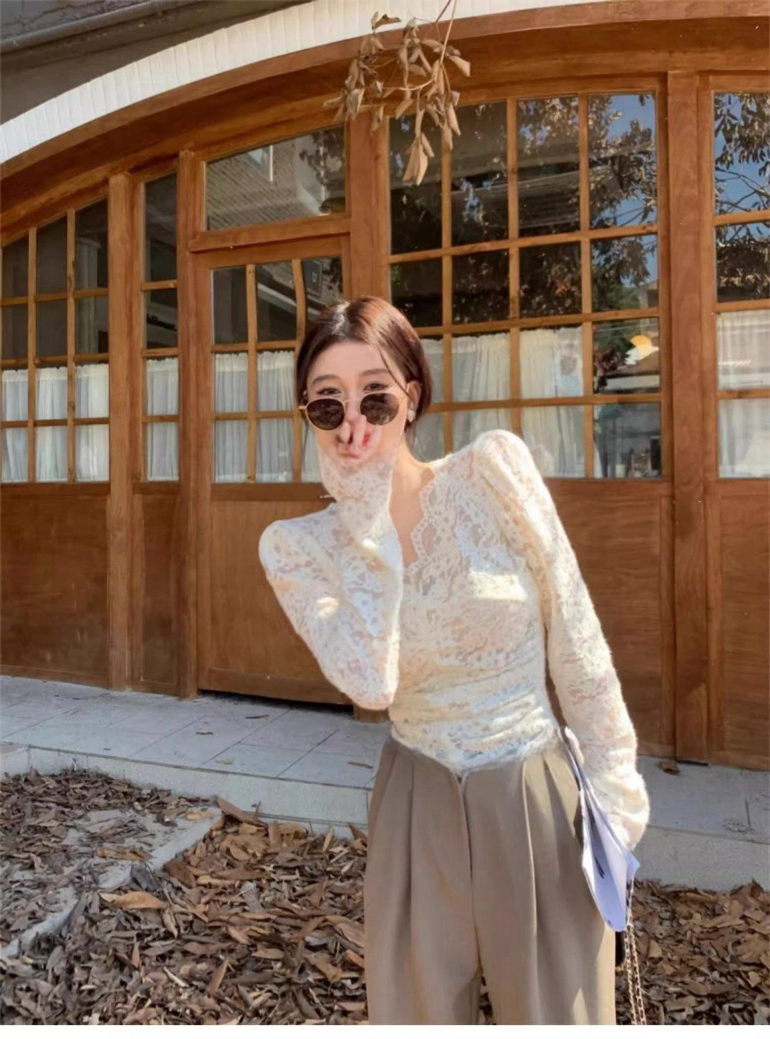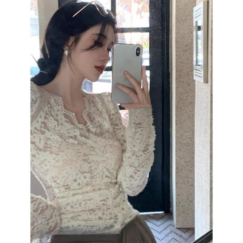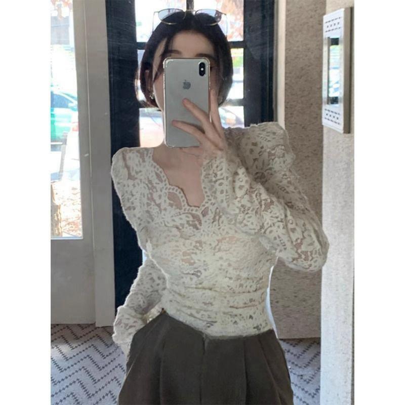 살구색 V 넥 레이스 바닥 셔츠 여성의 2024 가을과 겨울 새로운 프랑스 스타일 슬림 짧은 긴 소매 탑스토어 가기
