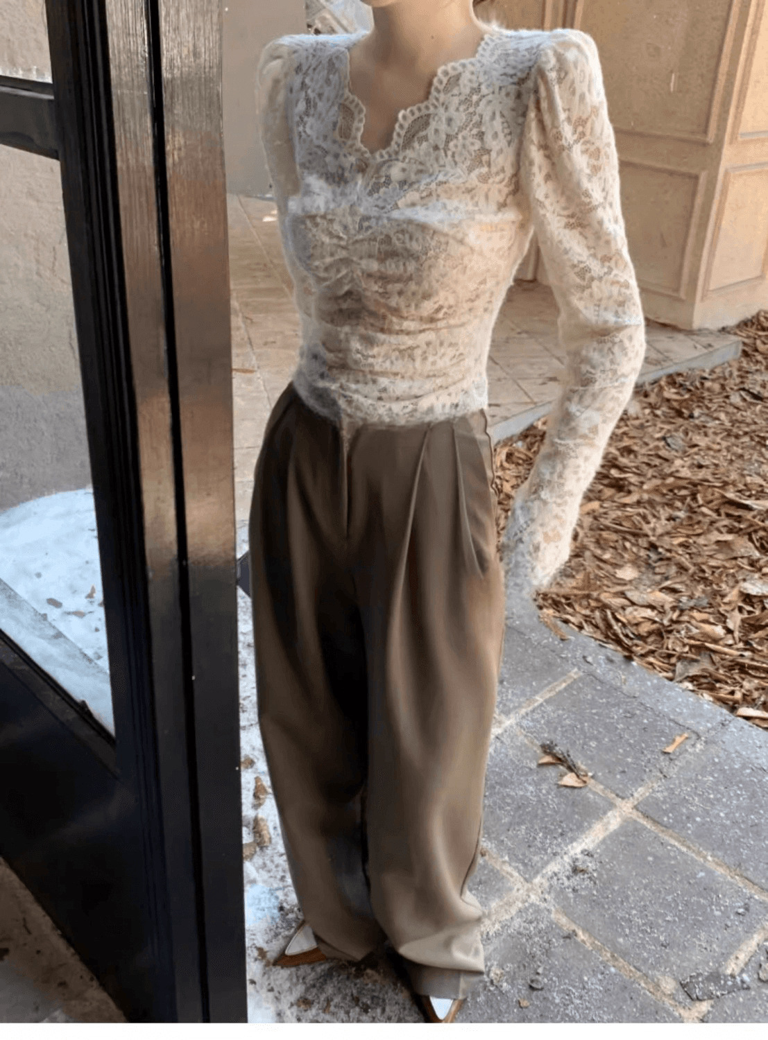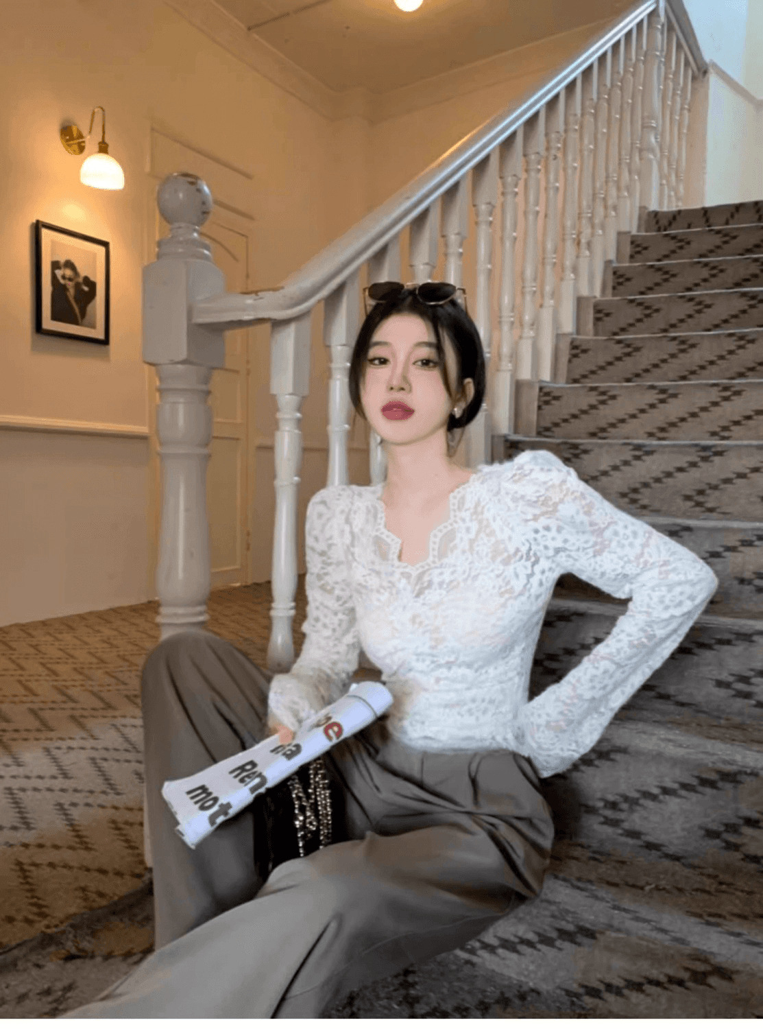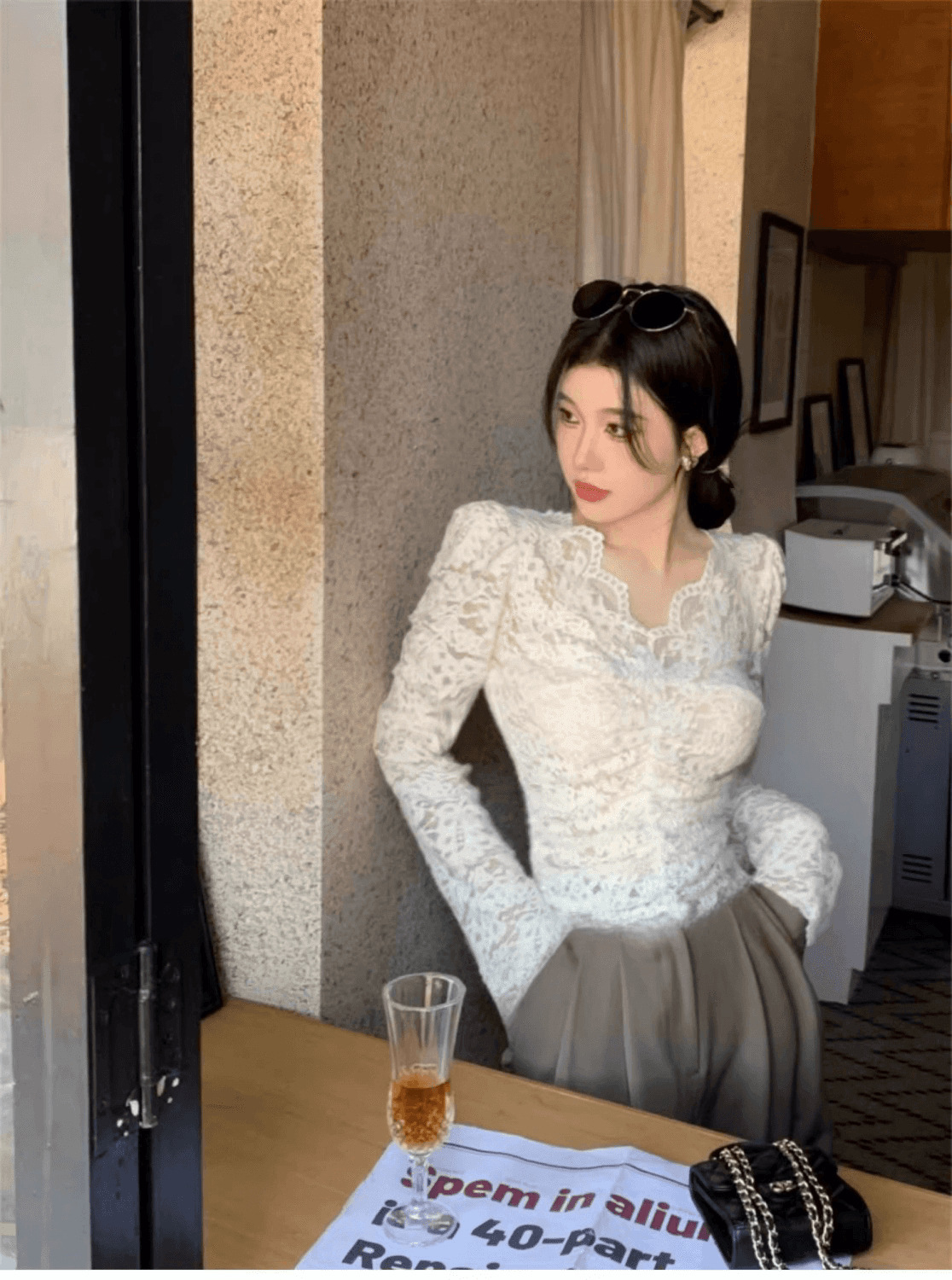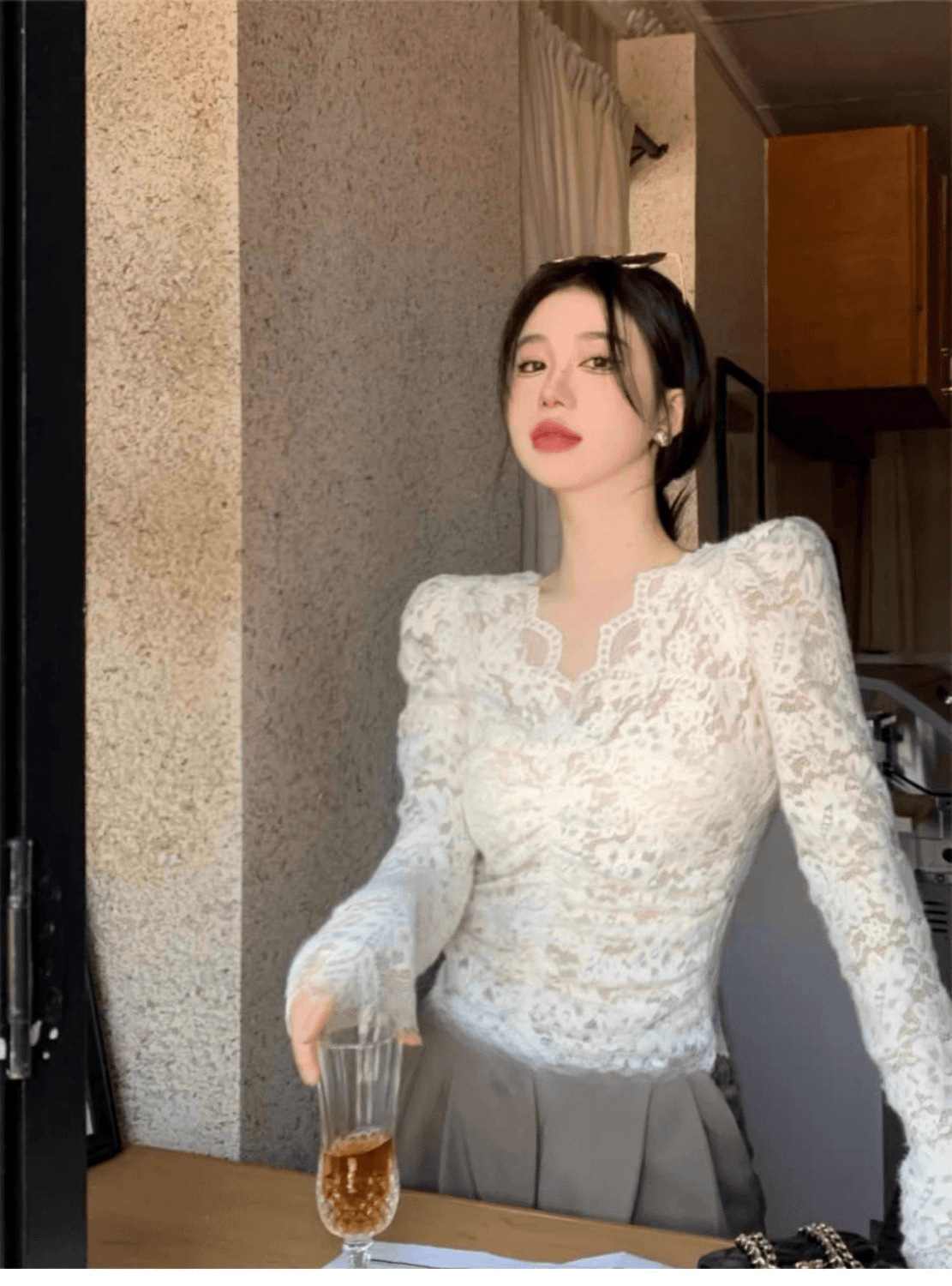 살구색 V 넥 레이스 바닥 셔츠 여성의 2024 가을과 겨울 새로운 프랑스 스타일 슬림 짧은 긴 소매 탑스토어 가기