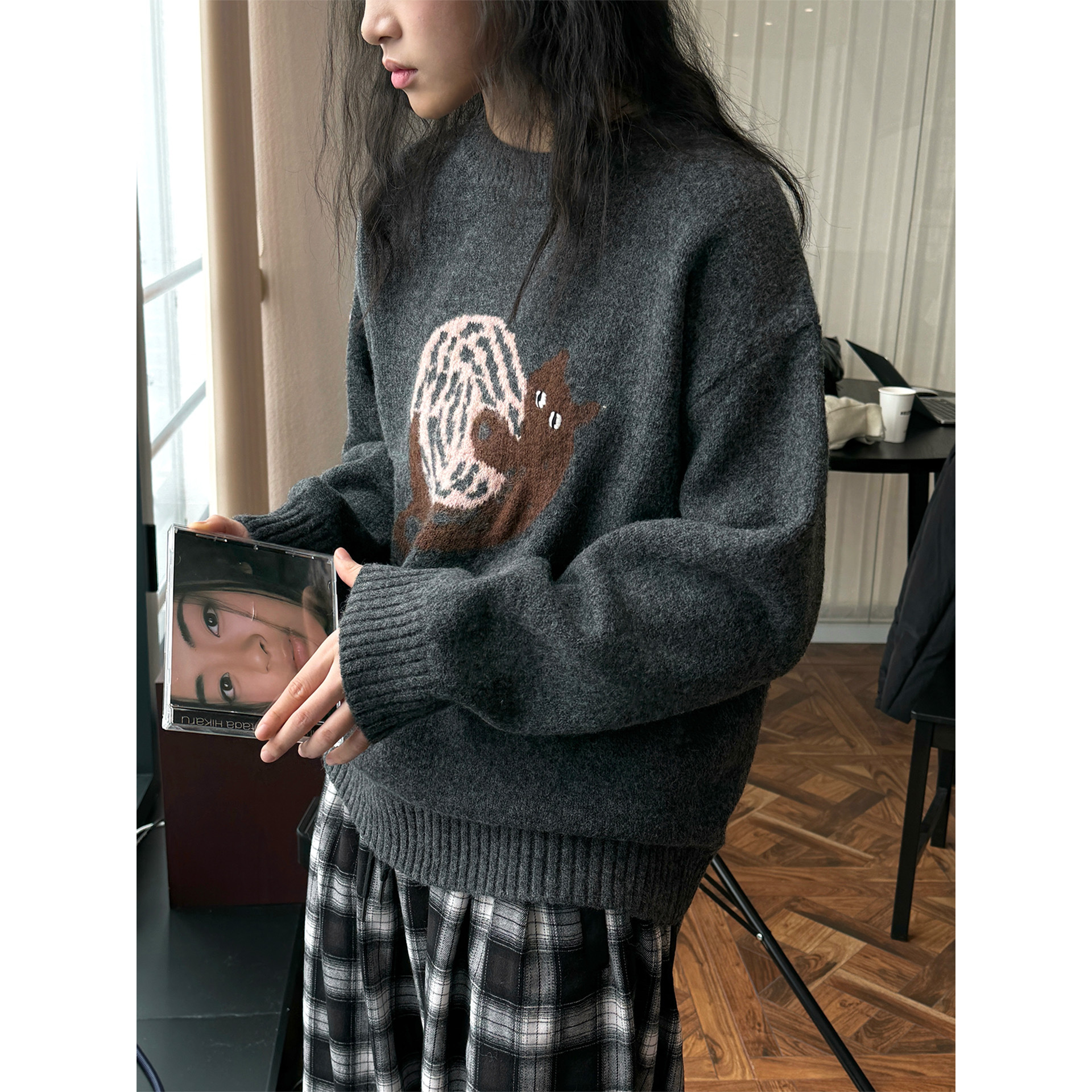 루푸 이른 봄 새로운 한국 스타일 디자인 센스 에이지 감소 인쇄 양모 스웨터, 고급 질감 및 느슨한 슬리밍 탑스토어 가기