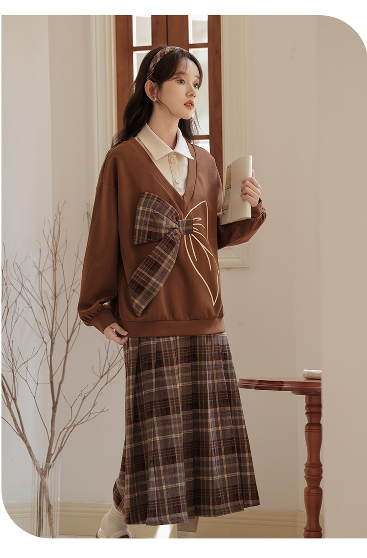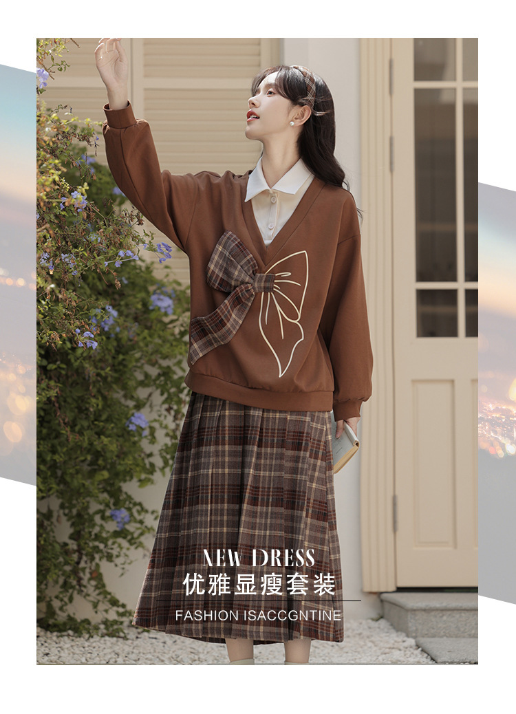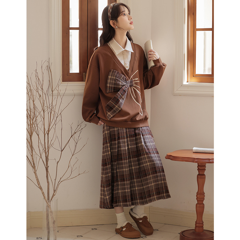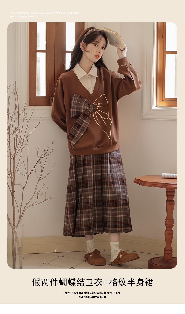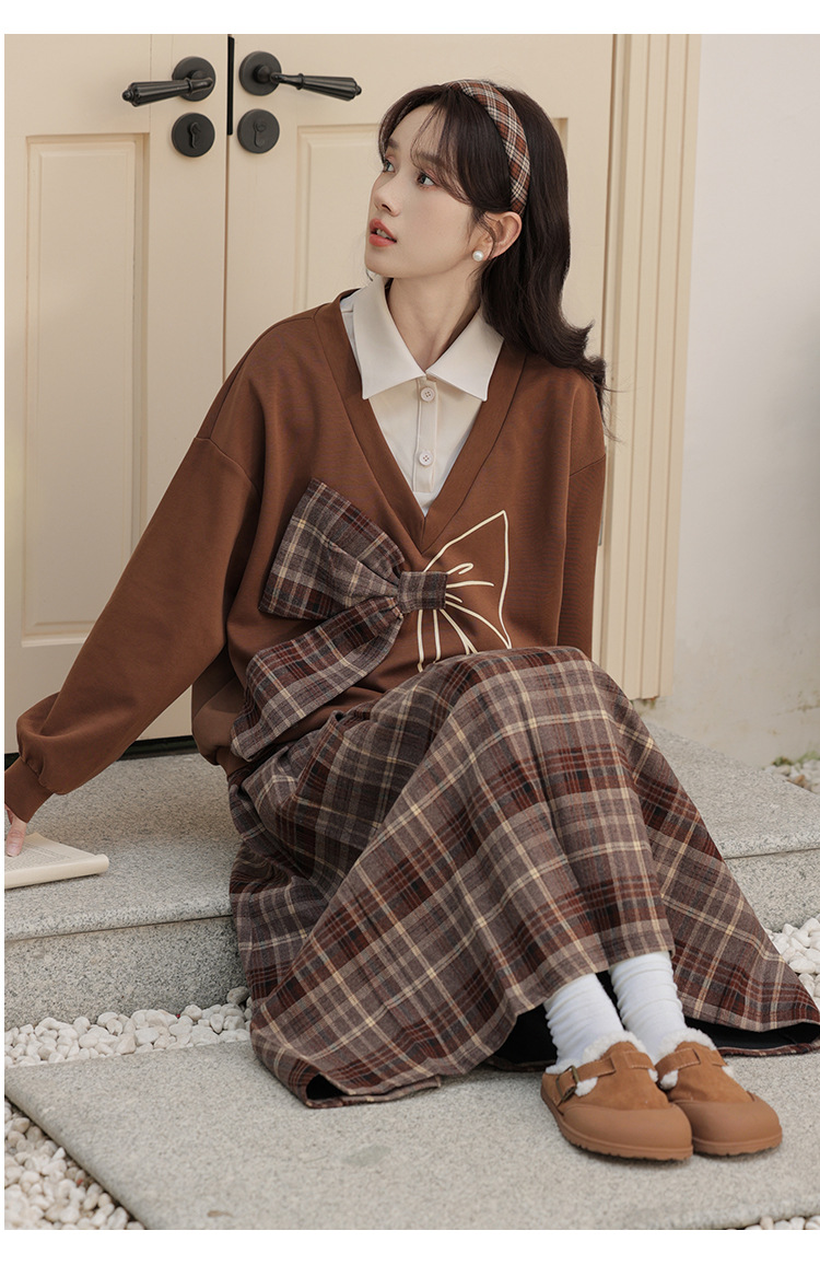 대학 스타일의 한국식 투피스 원피스 세트 여자 2024 년 겨울 새 도착 활 땀 격자 무늬 스커트스토어 가기