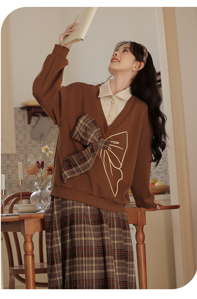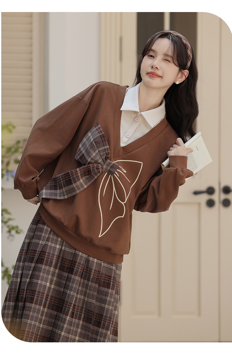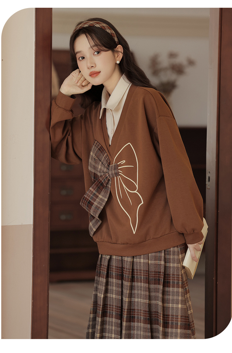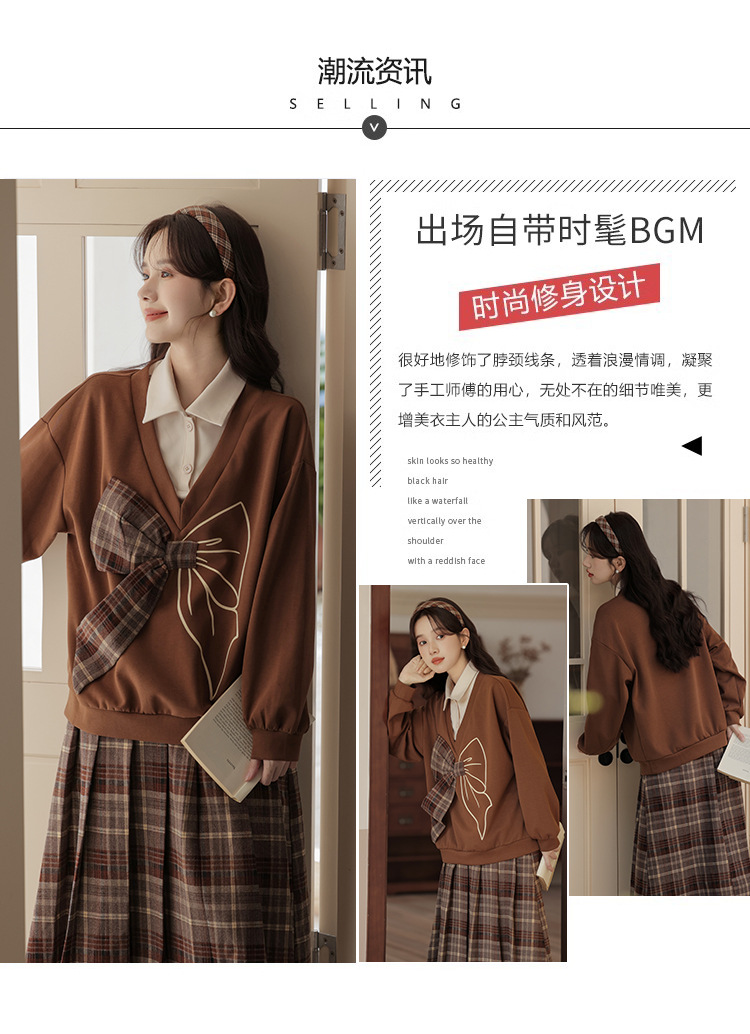 대학 스타일의 한국식 투피스 원피스 세트 여자 2024 년 겨울 새 도착 활 땀 격자 무늬 스커트