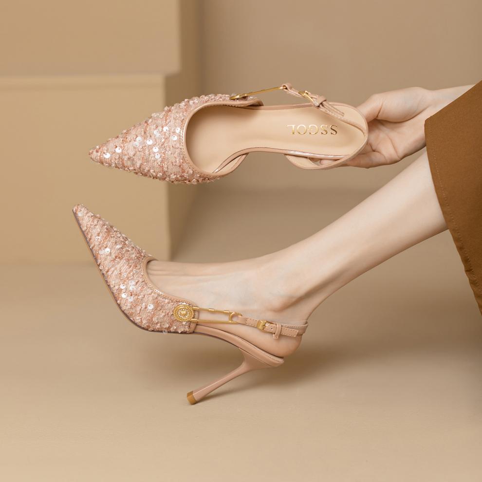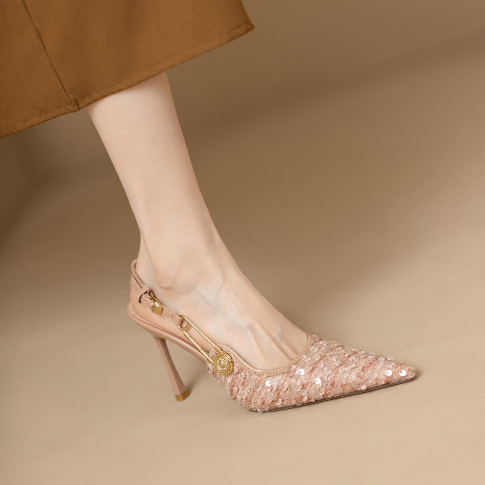 여자 발가락 샌들 2024 새로운 여름 올매치 포인팅 하이힐 우아한 패션 Sequins 프랑스 스타일 작은 Cui Wei