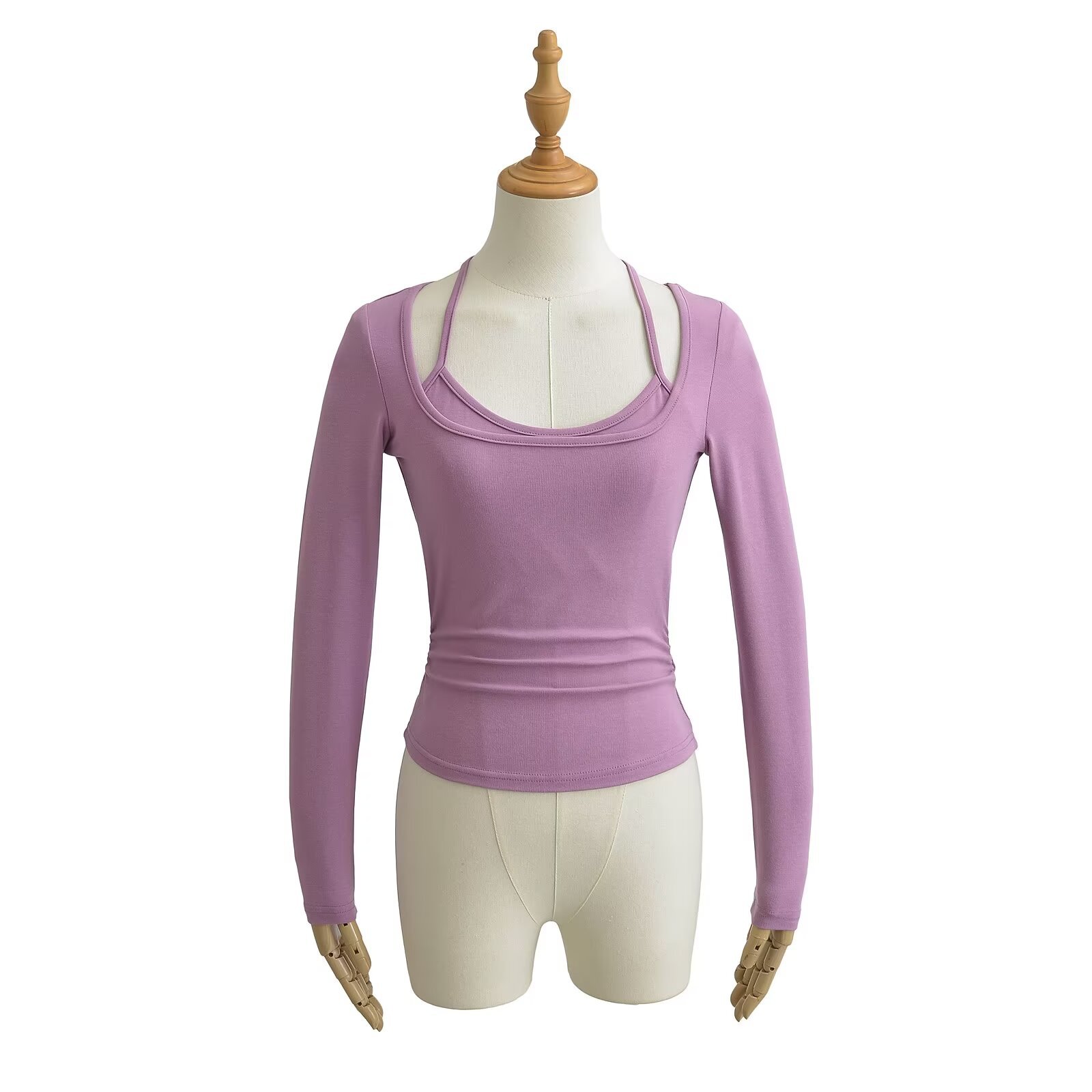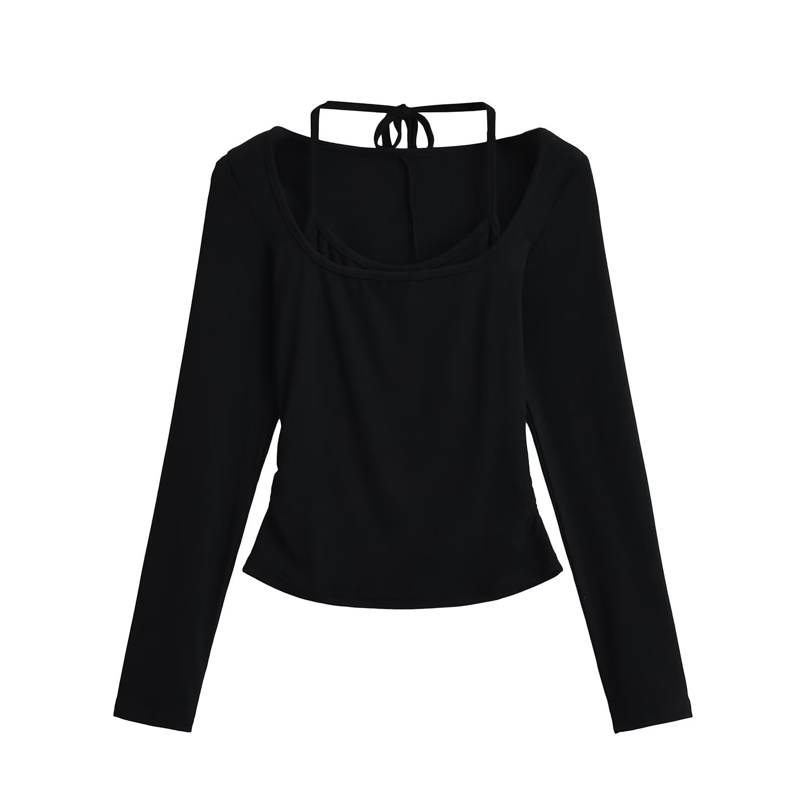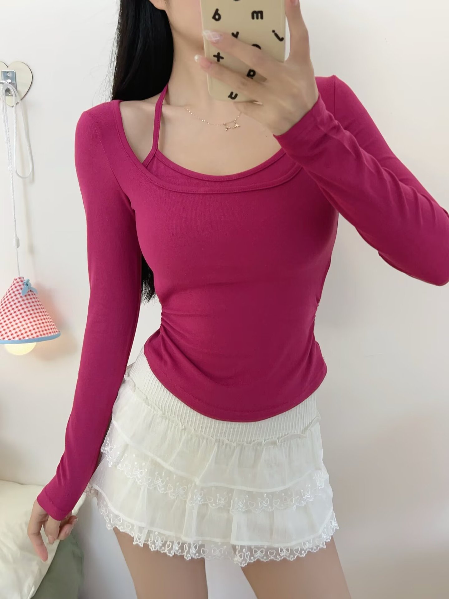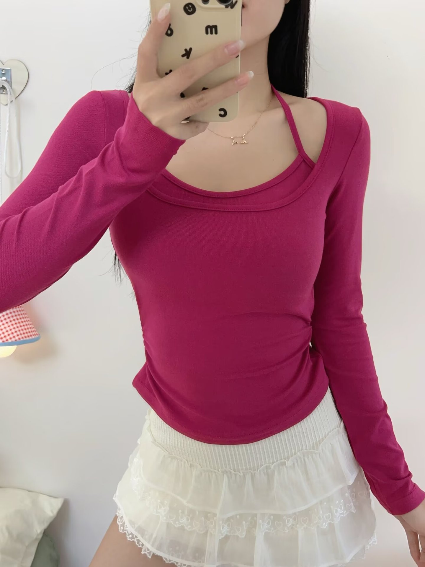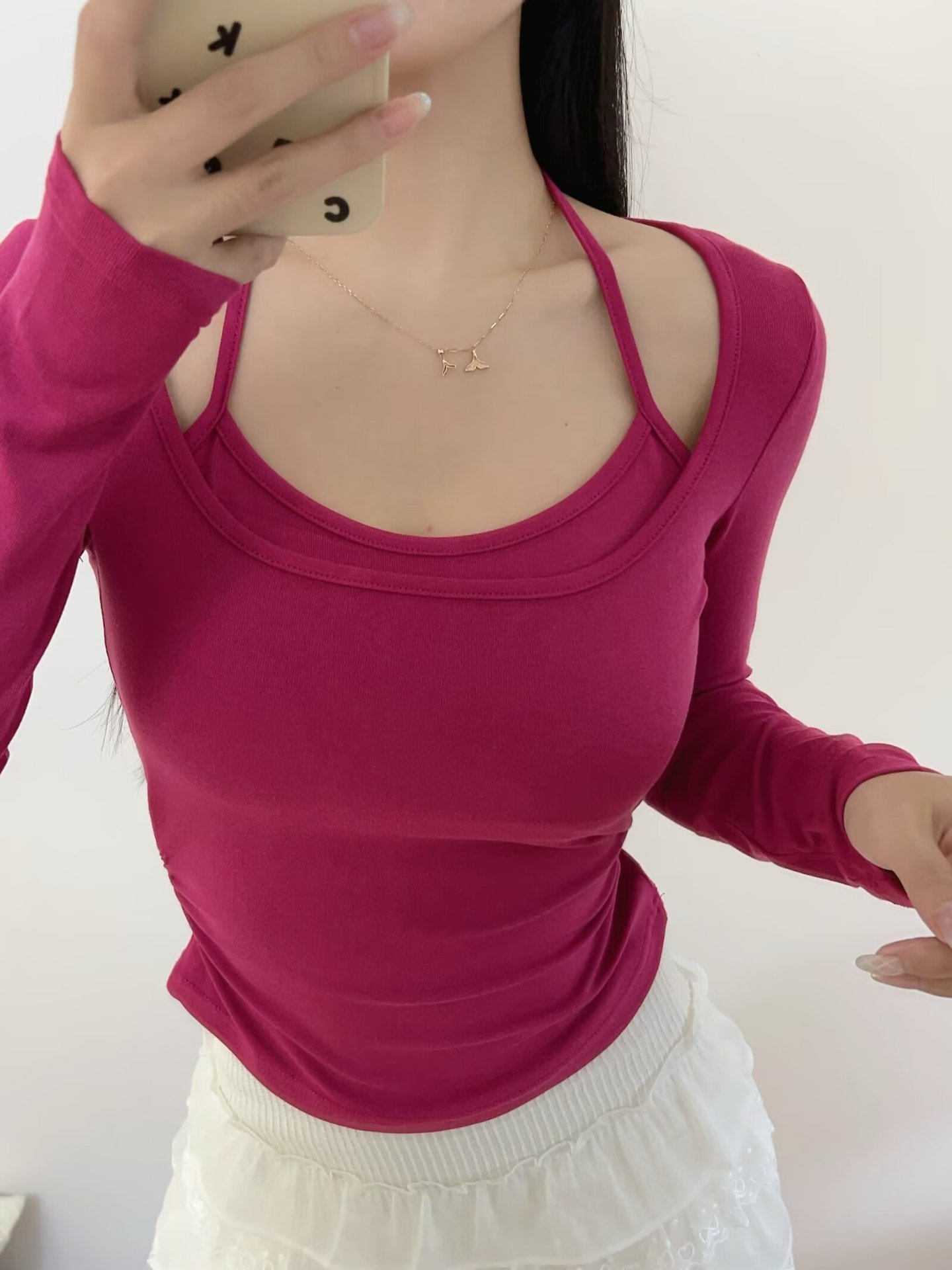 유럽과 미국 스타일 여성의 뜨거운 소녀 스타일 매달려 목 가짜 투피스 긴팔 티셔츠 가을 새로운 슬림 핏 슬리밍베이스 탑