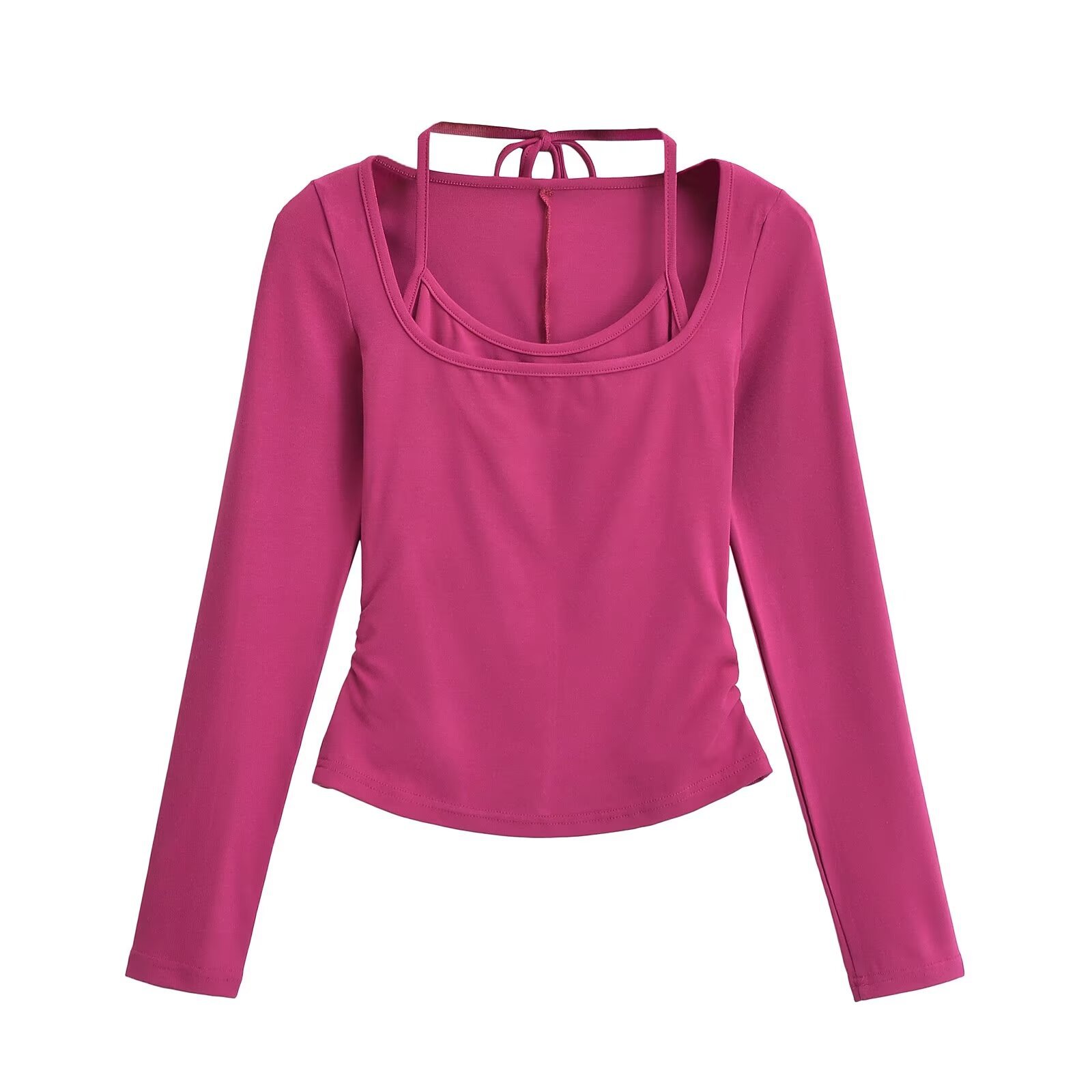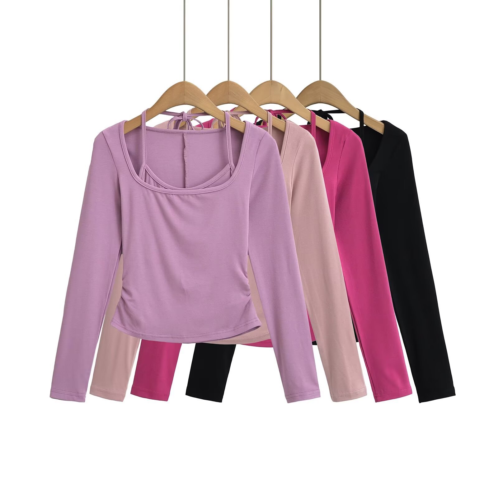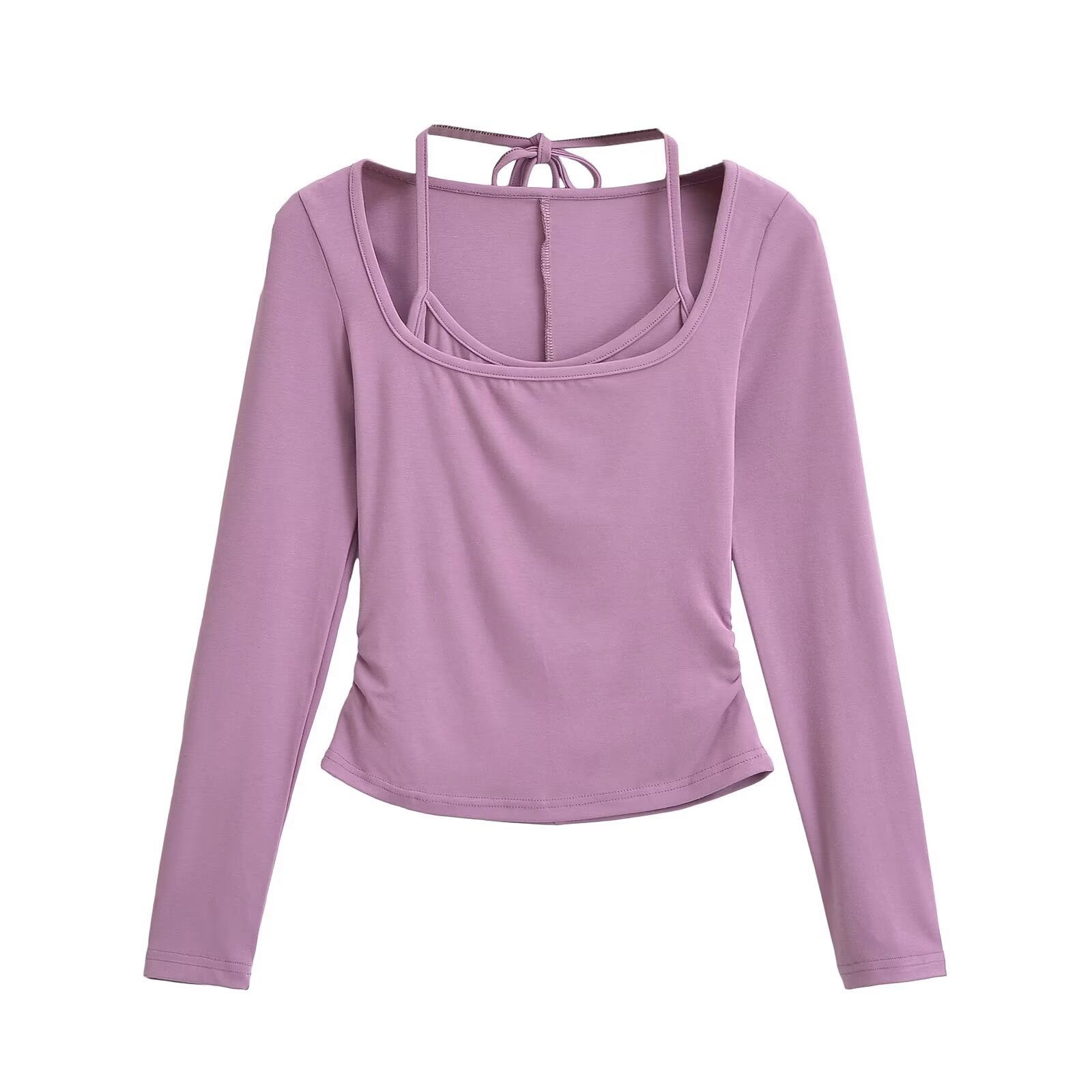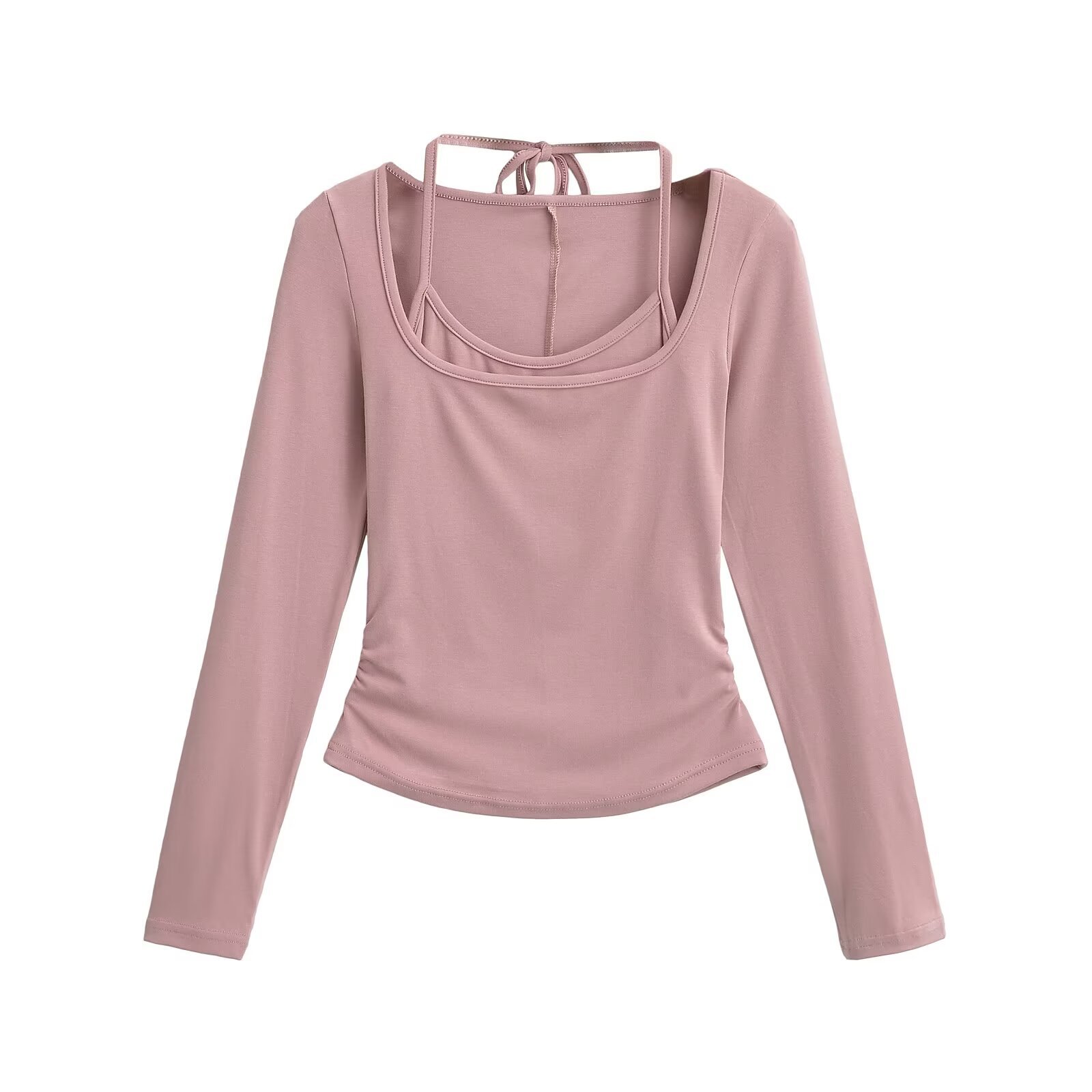 유럽과 미국 스타일 여성의 뜨거운 소녀 스타일 매달려 목 가짜 투피스 긴팔 티셔츠 가을 새로운 슬림 핏 슬리밍베이스 탑