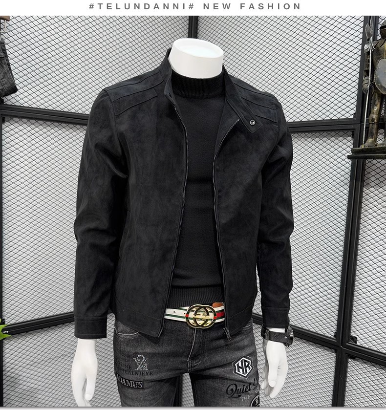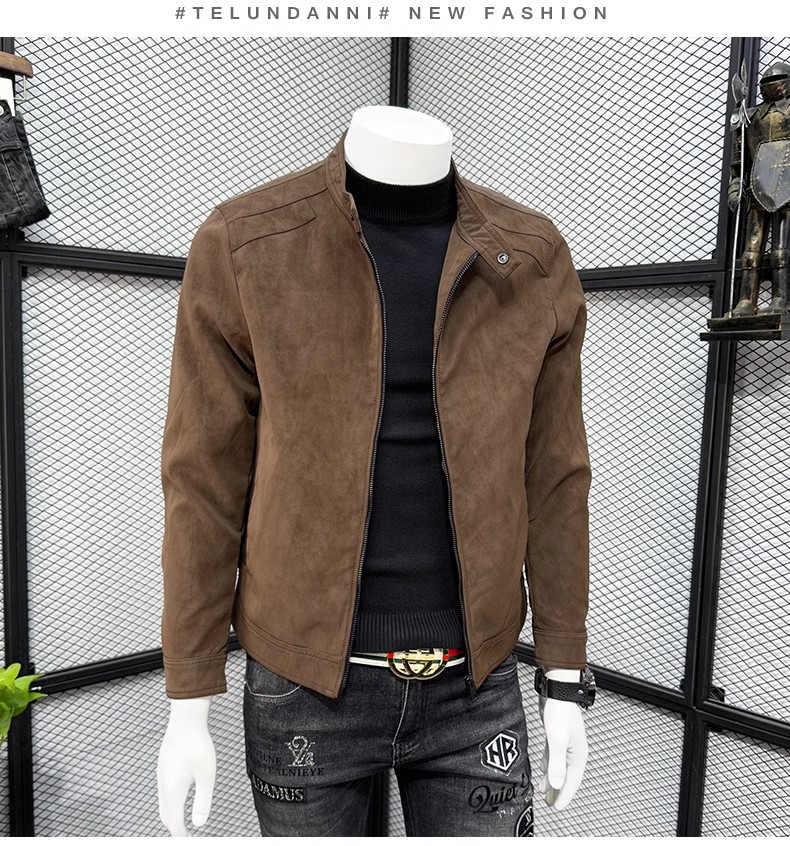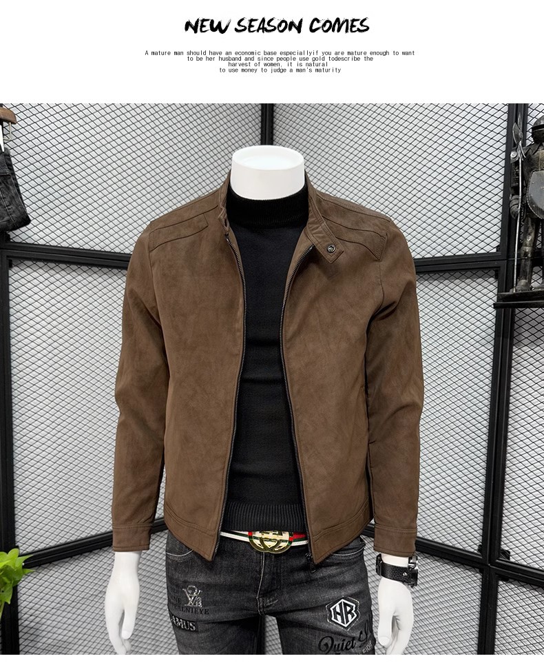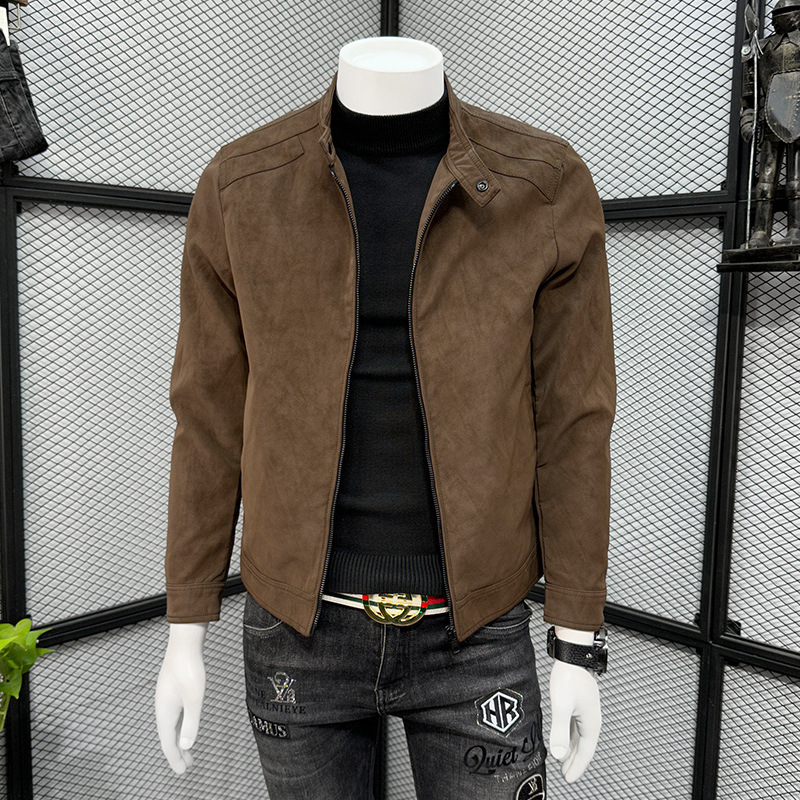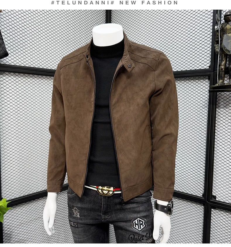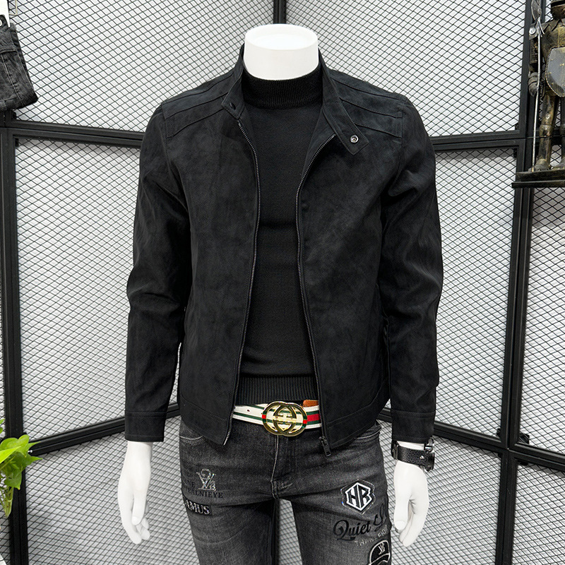 남성 스웨이드 가죽 자켓 봄 가을 한국 스타일 슬림 핏 PU 가죽 자켓 수직 칼라 남성용 간단한 캐주얼 가죽 자켓 남성용 트렌디