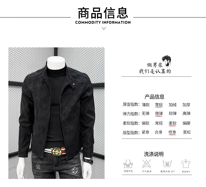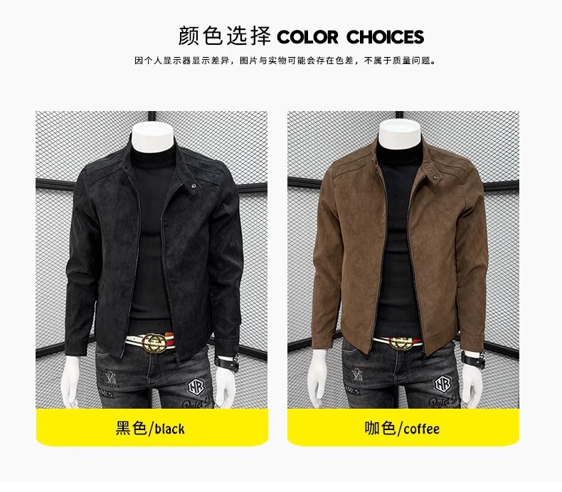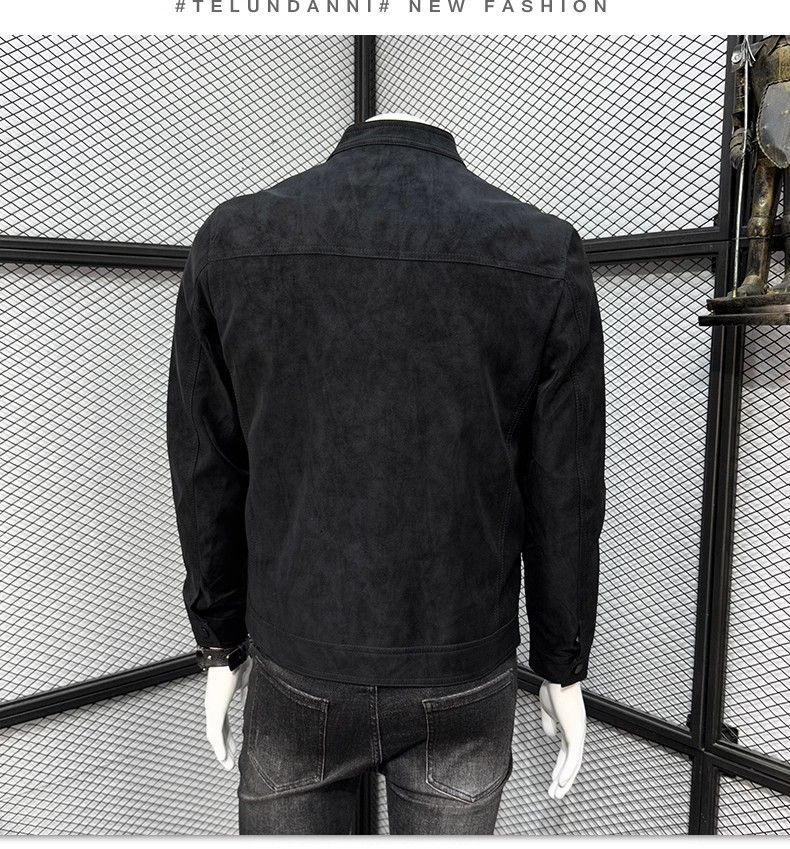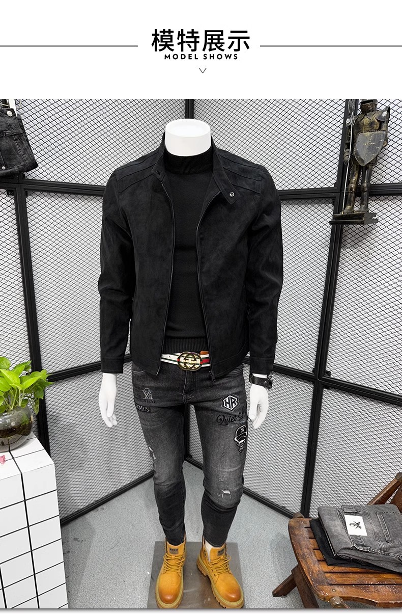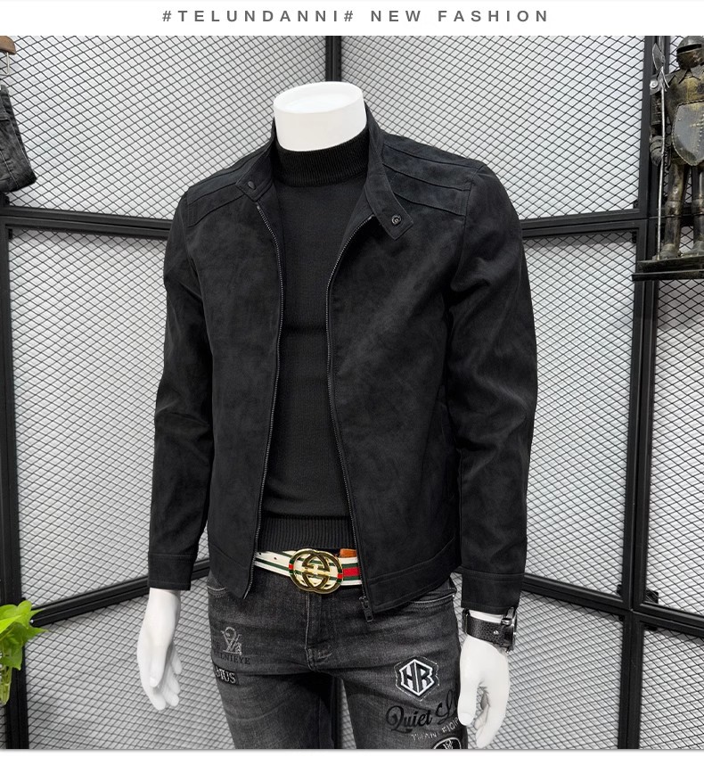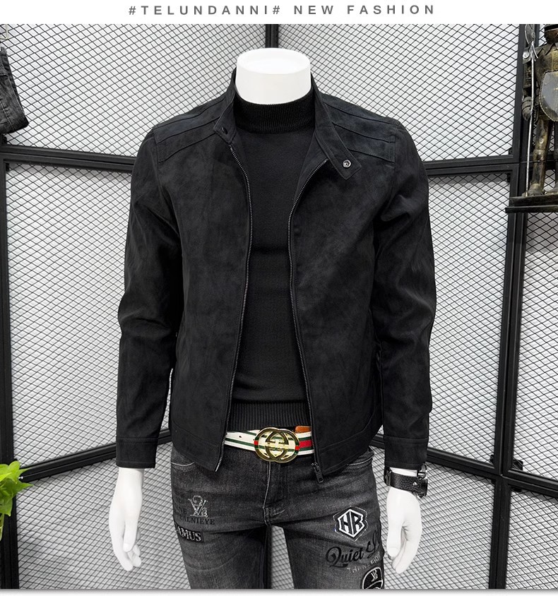 남성 스웨이드 가죽 자켓 봄 가을 한국 스타일 슬림 핏 PU 가죽 자켓 수직 칼라 남성용 간단한 캐주얼 가죽 자켓 남성용 트렌디