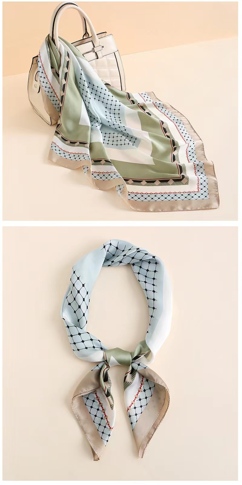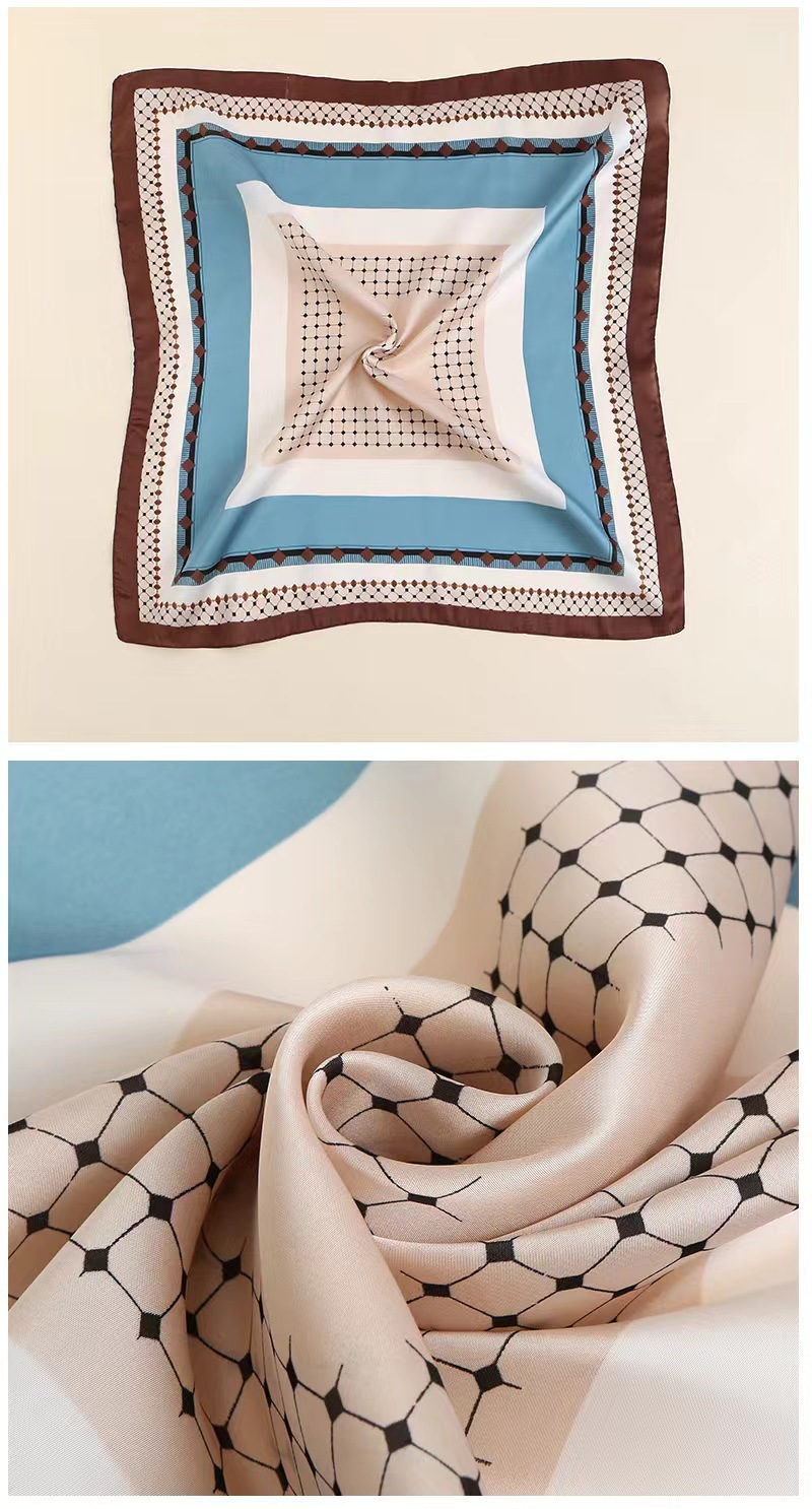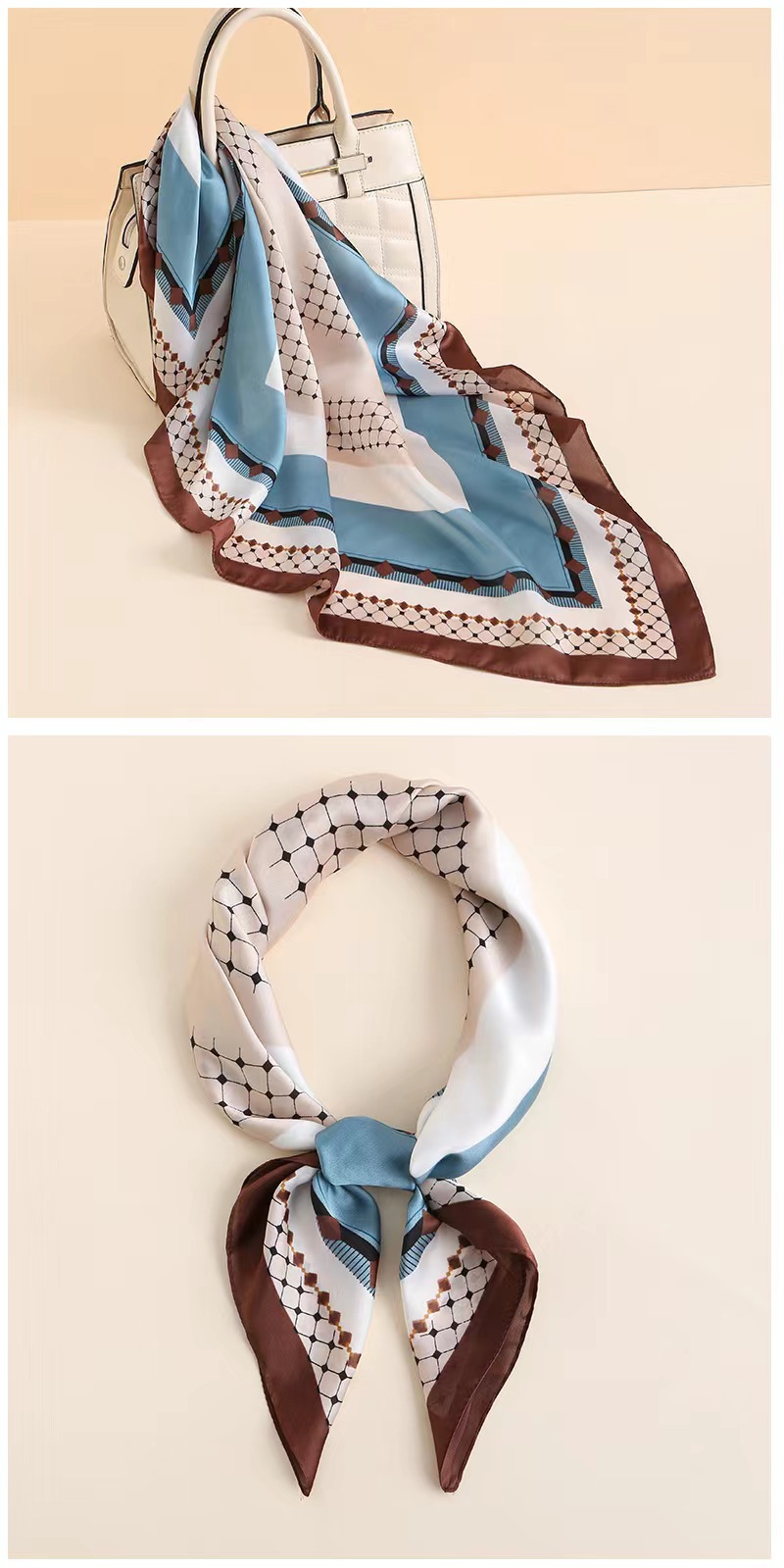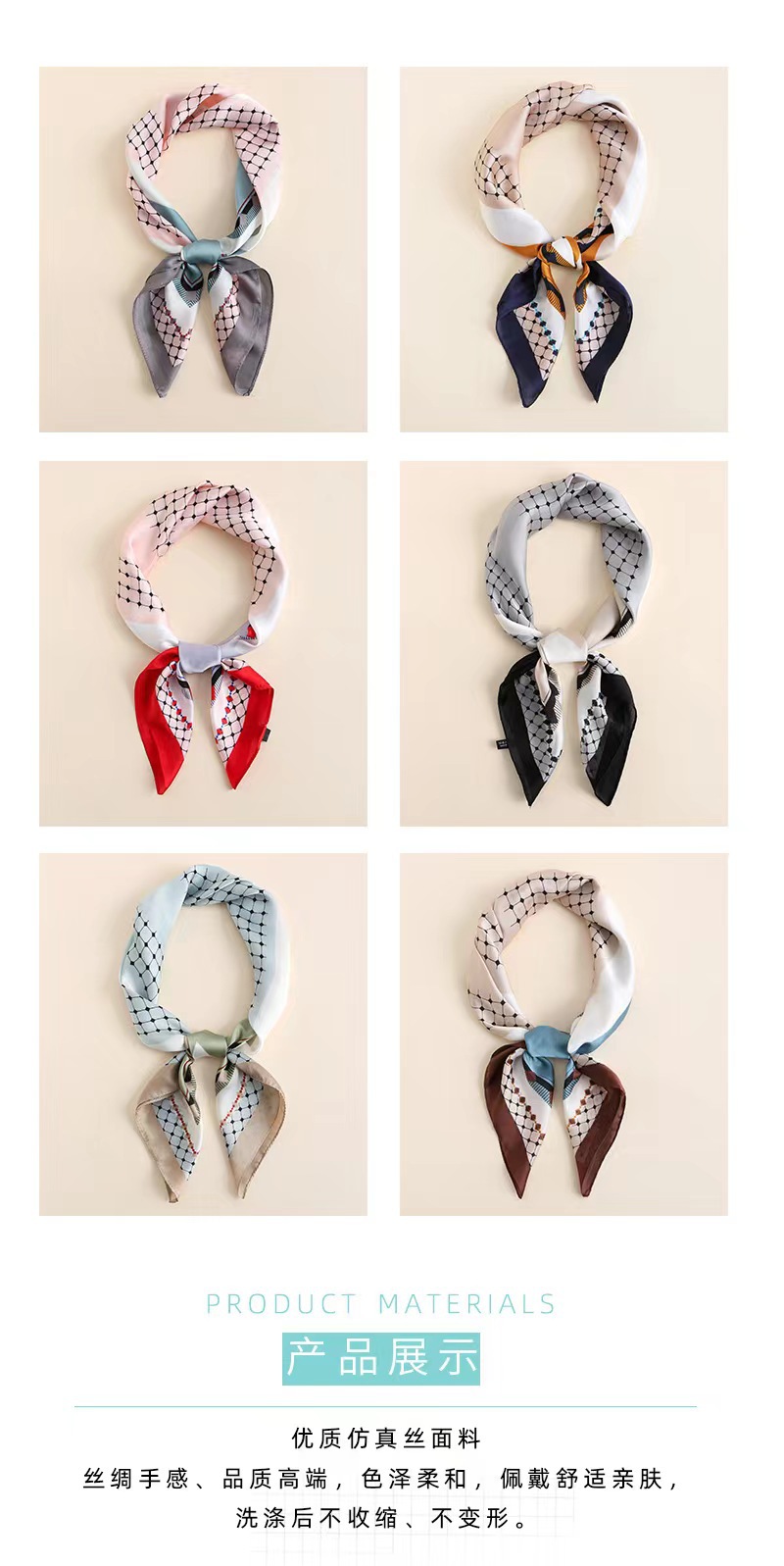 한국 간단한 기하학적 색 블록 새틴 인쇄 스카프 70cm 모방 실크 장식 스카프 다기능 헤어 타이 리본