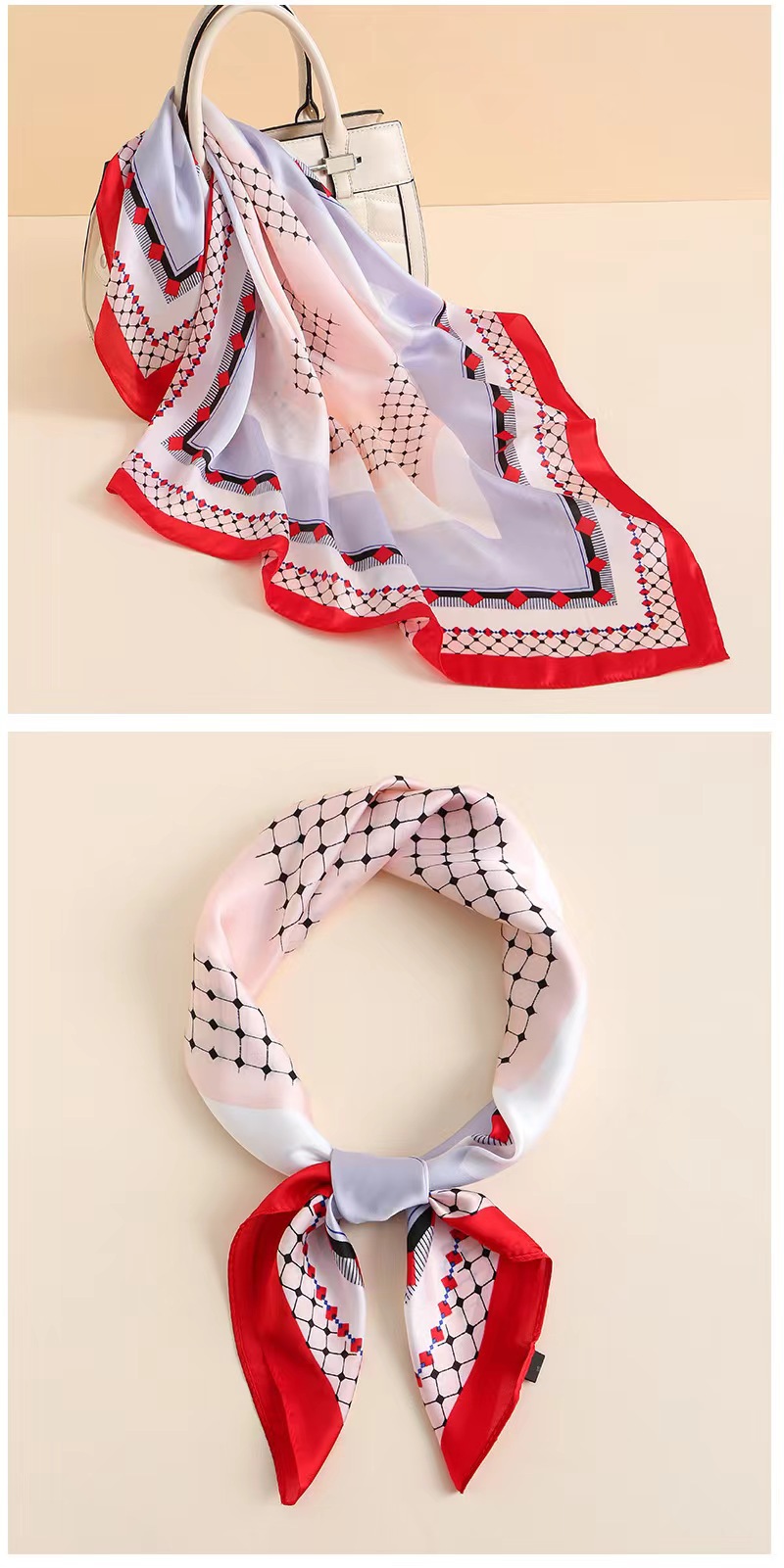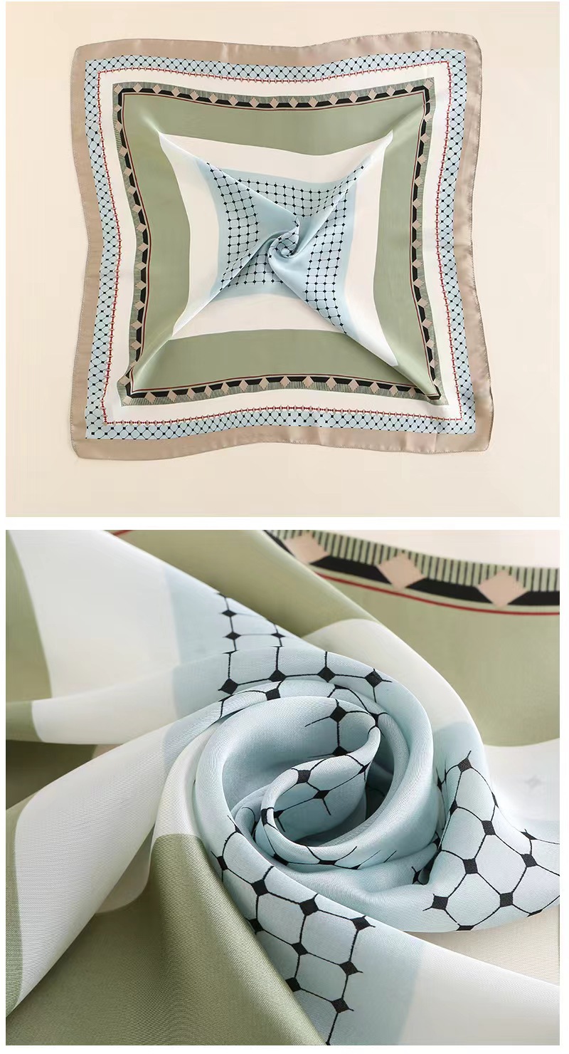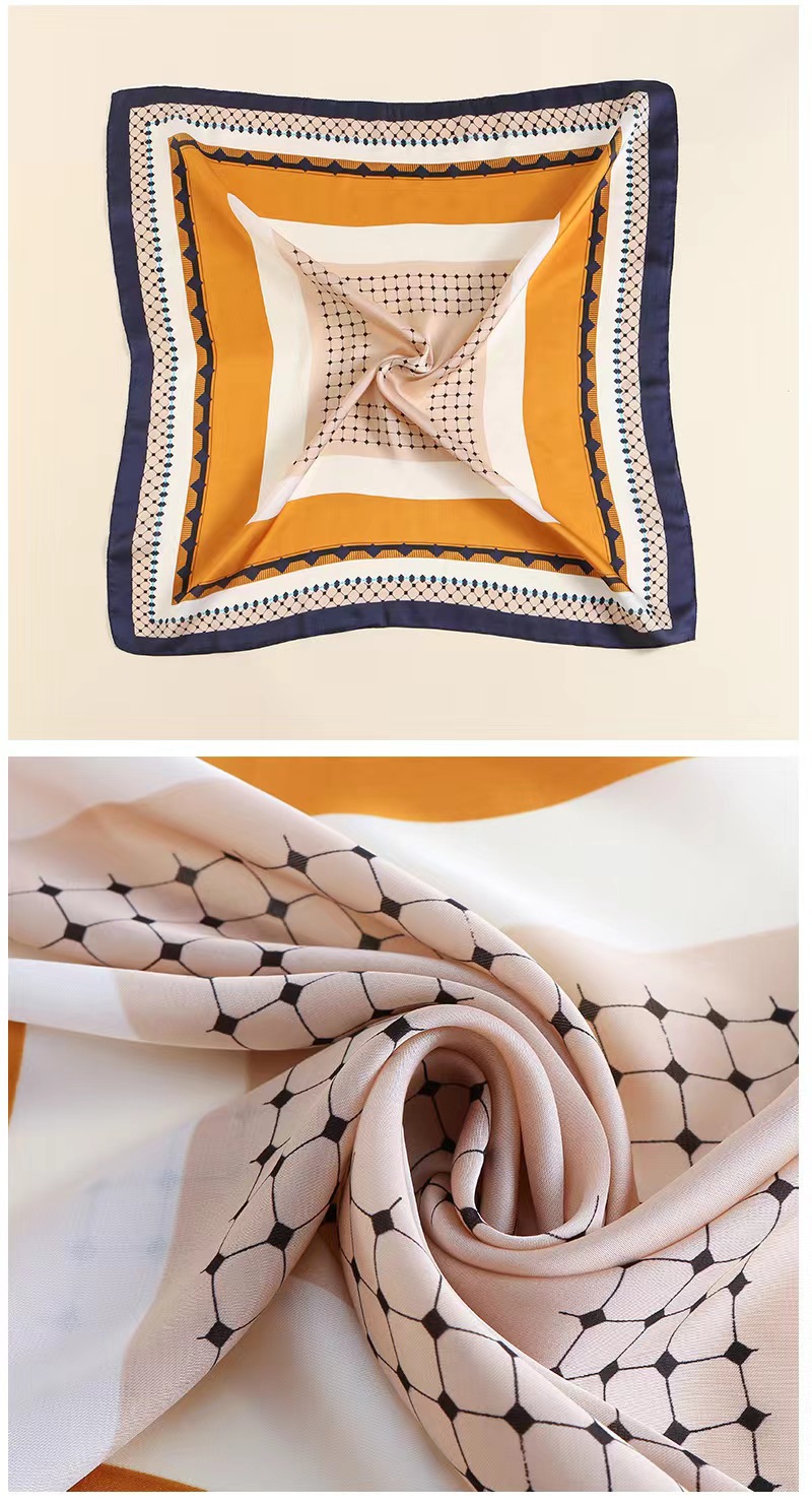 한국 간단한 기하학적 색 블록 새틴 인쇄 스카프 70cm 모방 실크 장식 스카프 다기능 헤어 타이 리본