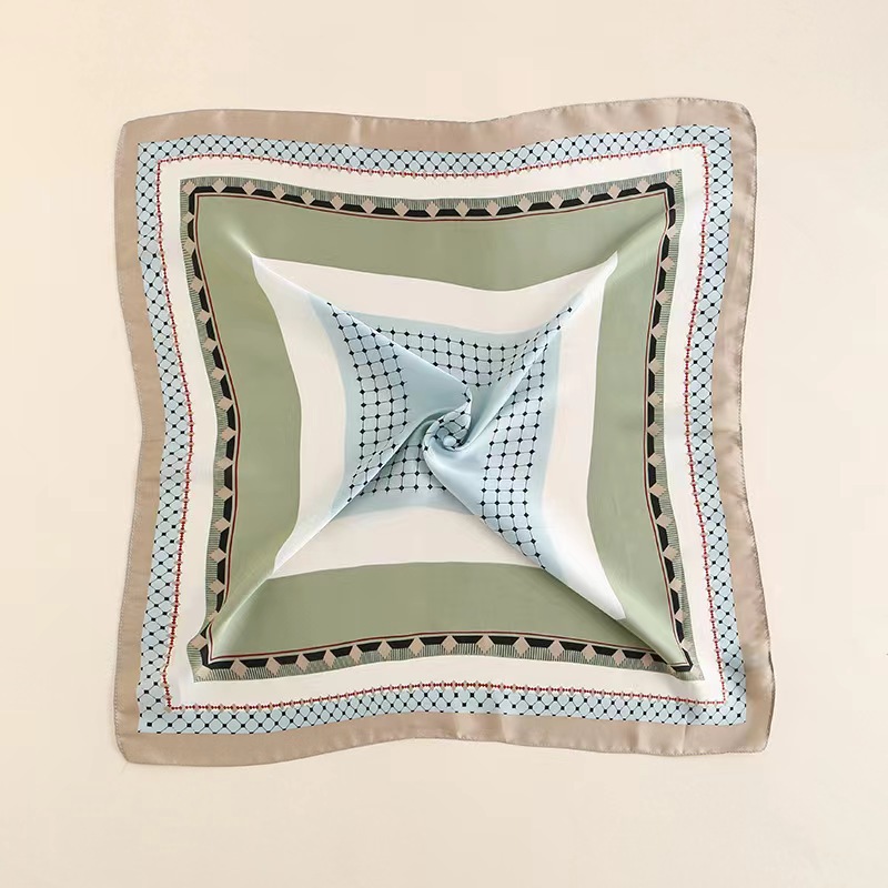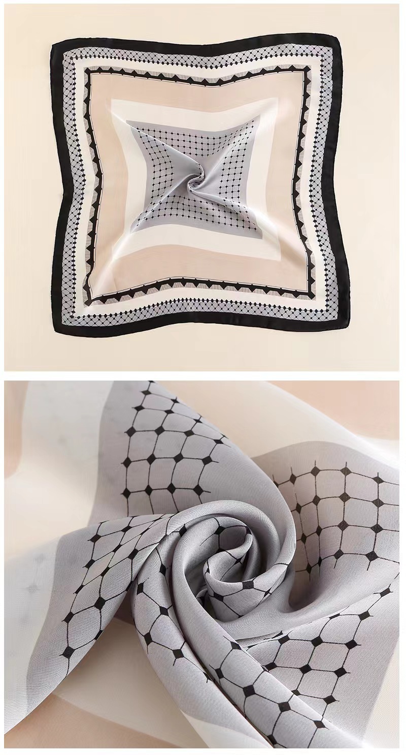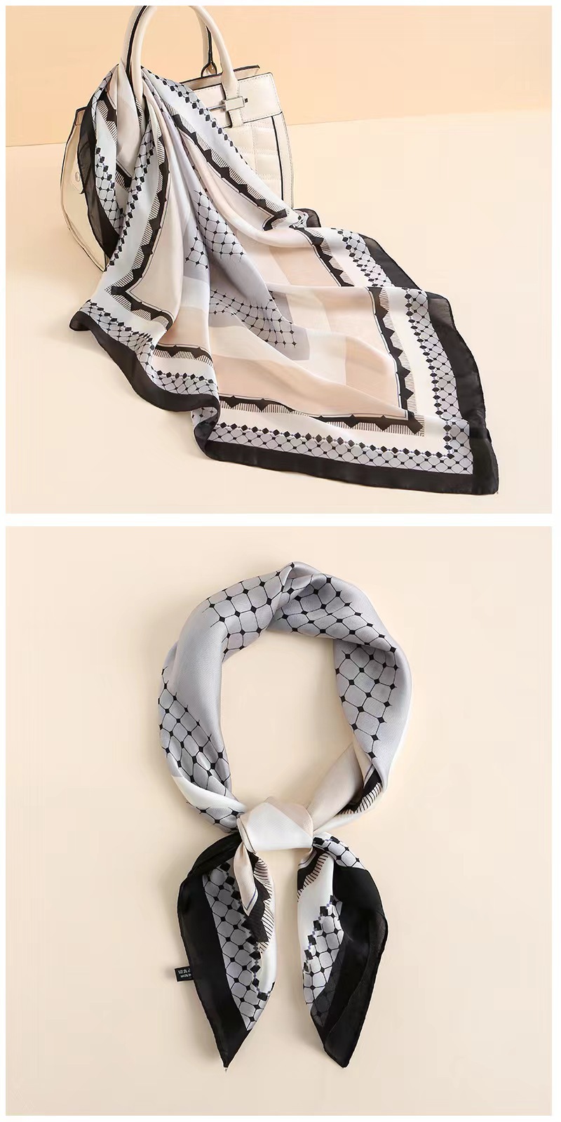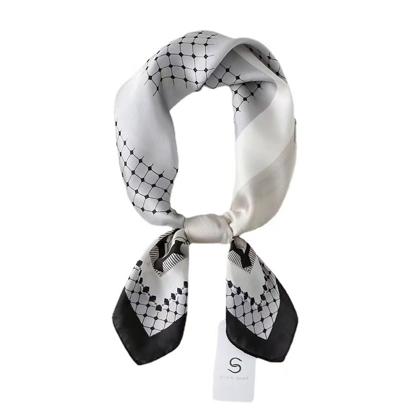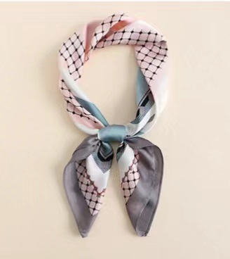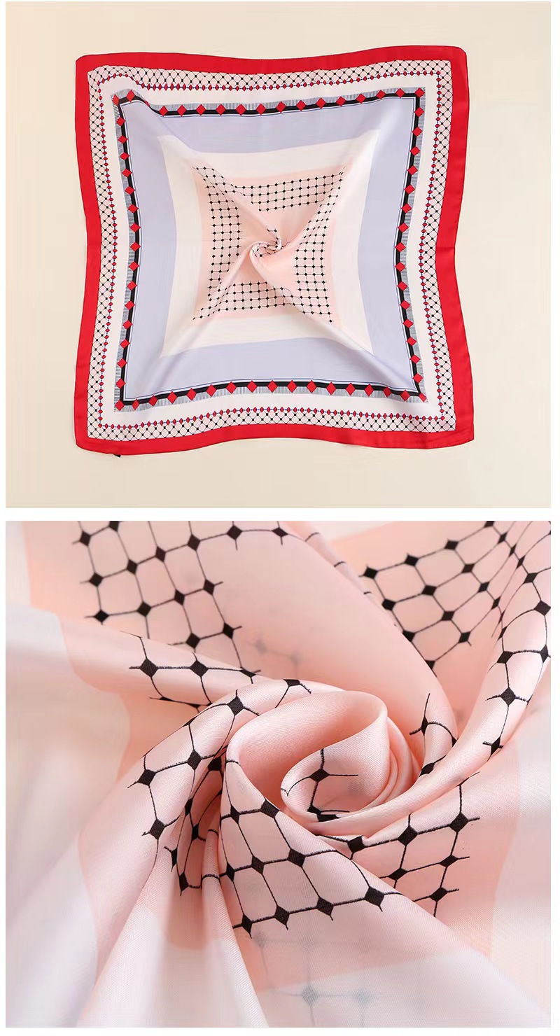 한국 간단한 기하학적 색 블록 새틴 인쇄 스카프 70cm 모방 실크 장식 스카프 다기능 헤어 타이 리본
