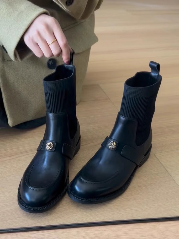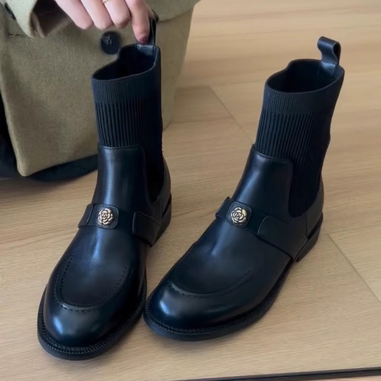 [재고 있음, 몇 초 안에 배송] 가을 겨울 여성용 카멜리아 스트레치 숏부츠 플러스 벨벳 슬림 부츠 플랫 마틴 부츠