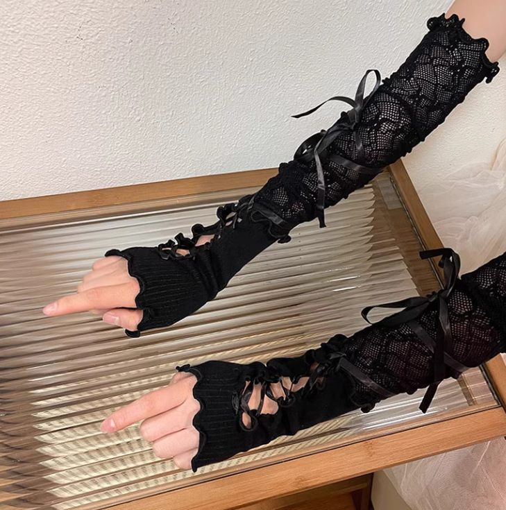 로리타 레이스 업 핸드 슬리브 여성 일본식 스티칭 발레 스타일 리본 스트랩 커프 cos 달콤한 멋진 스타일 장갑