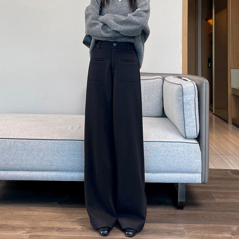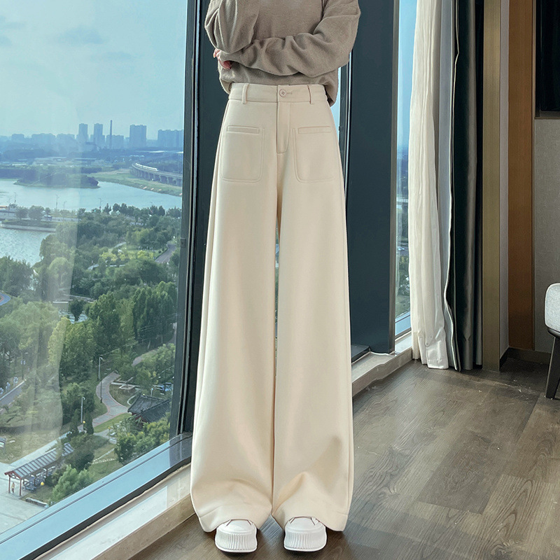 기모 모직 넓은 다리 바지 여성의 2024 가을/겨울 높은 허리 느슨한 캐주얼 두꺼운 엘라스티스 허리 스트레이트 바닥 바지