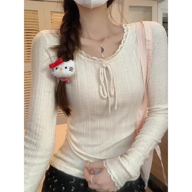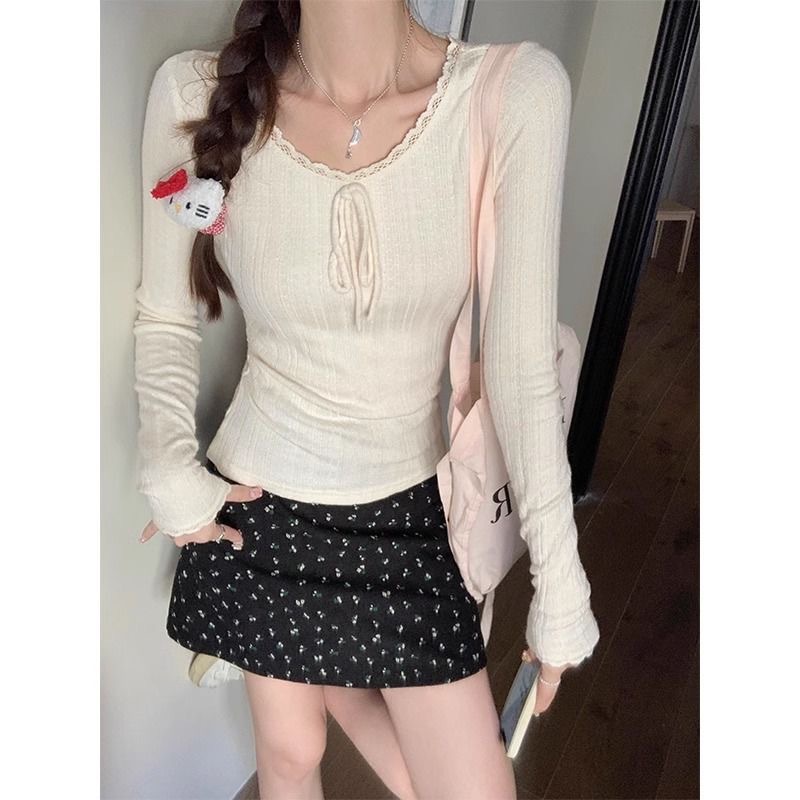 디자인 센스 틈새 레이스 바느질 긴팔 티셔츠 여성용 봄과 가을 새로운 슬림핏 슬리밍 스위트 스파이스 소녀 순수한 욕망 스타일 탑스토어 가기