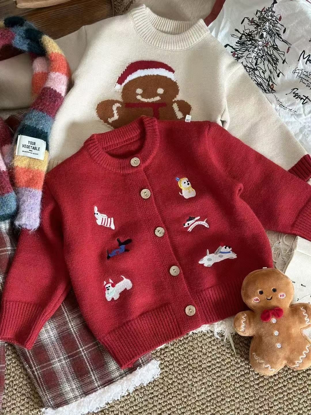 어린이 스웨터 카디건 2024 가을과 겨울 새로운 소년과 소녀 레드 강아지 축제 니트웨어 아기 웨스턴 스타일 코트스토어 가기