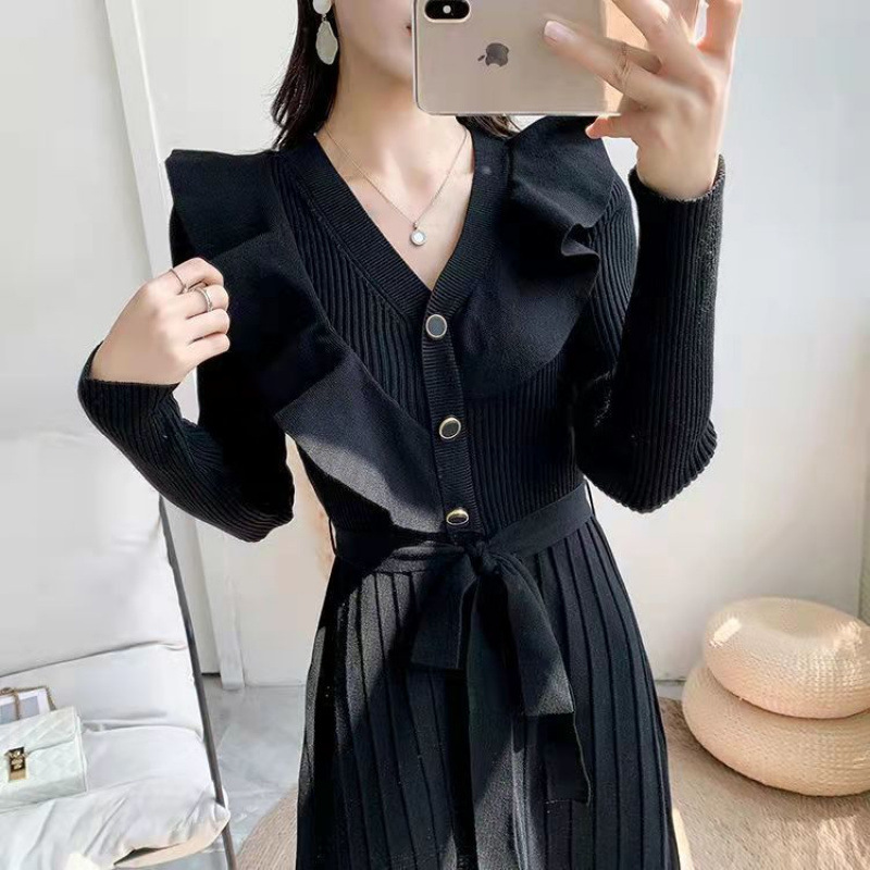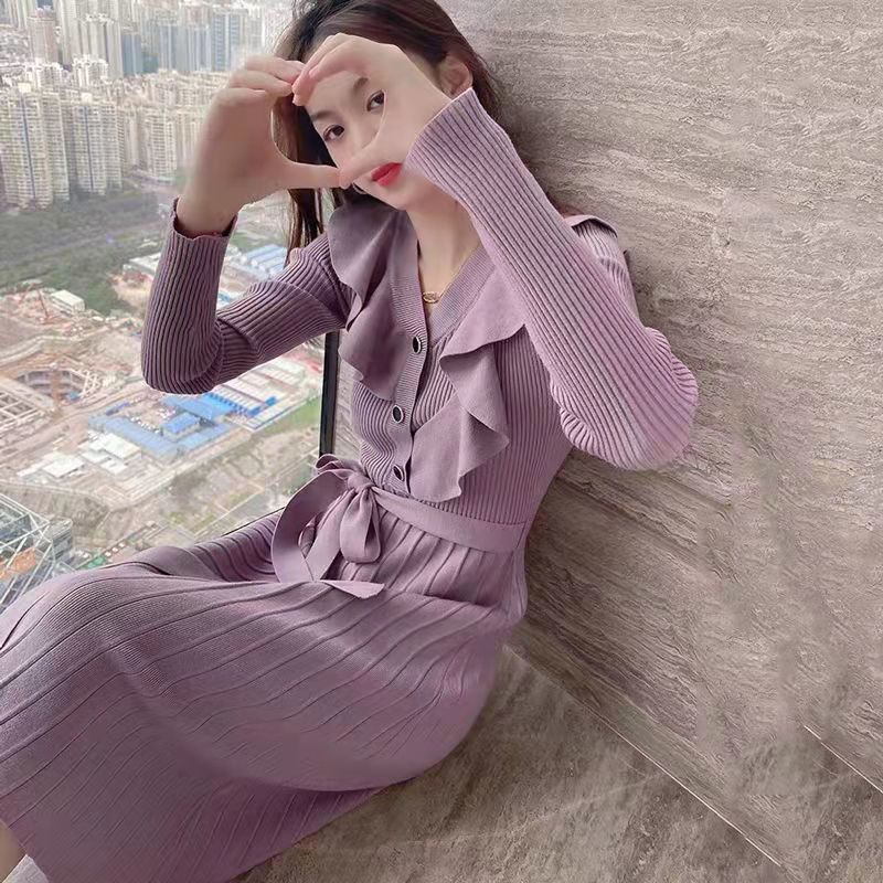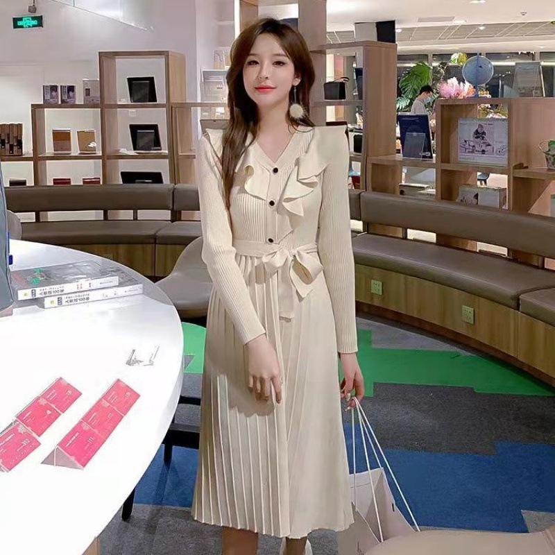샤넬 스타일 코트 니트 원피스 여성용 가을 및 겨울 중장베이스 허리 스웨터 원피스 무릎 위 우아한 스커트스토어 가기