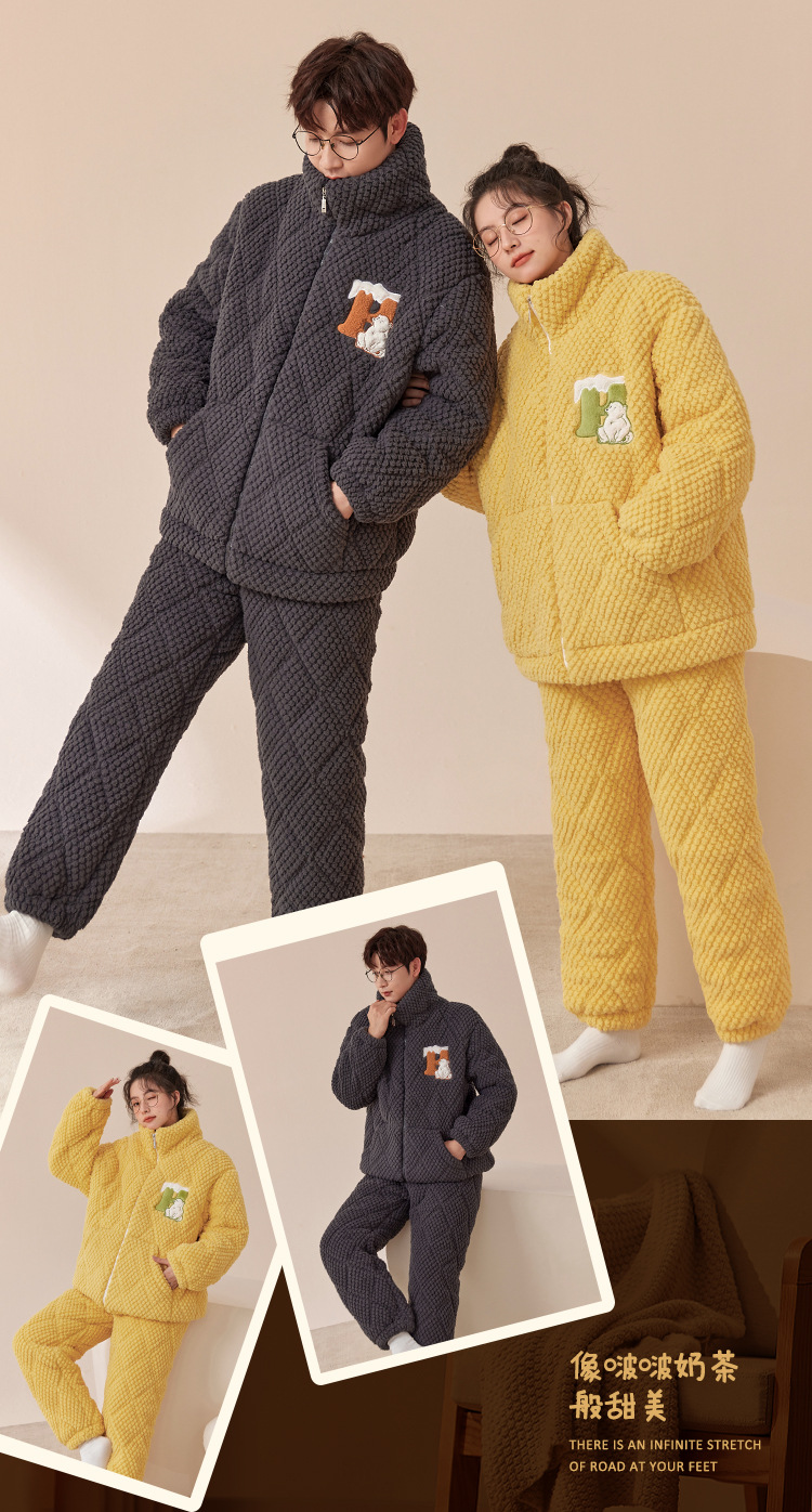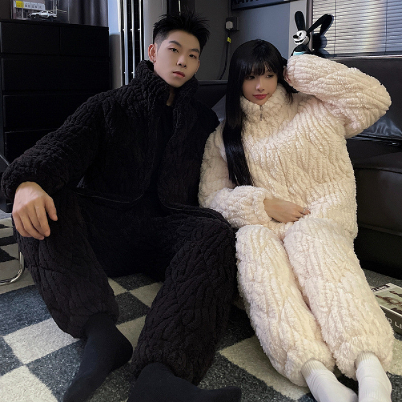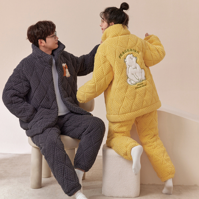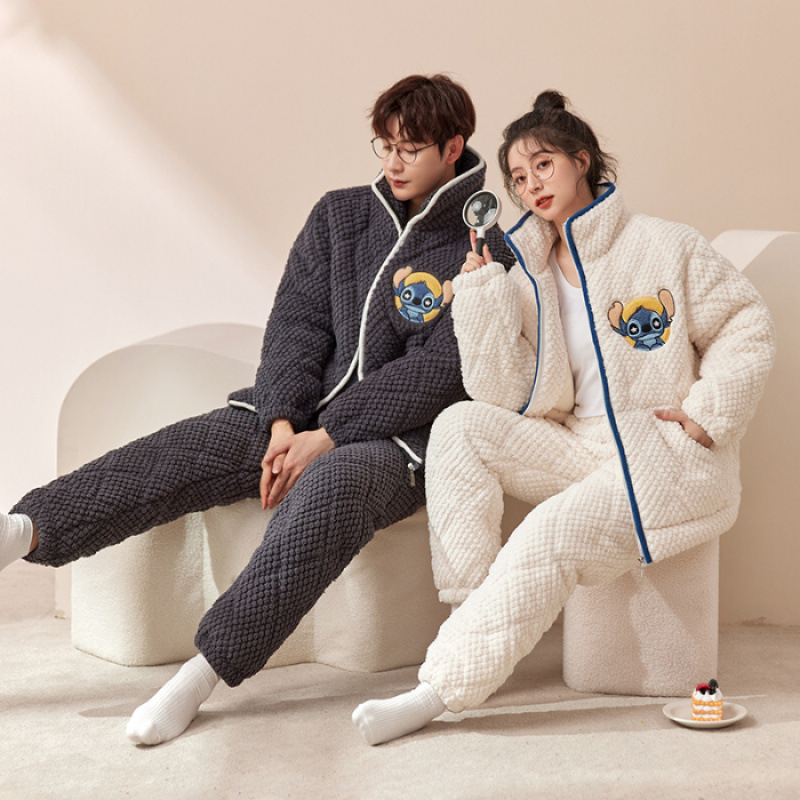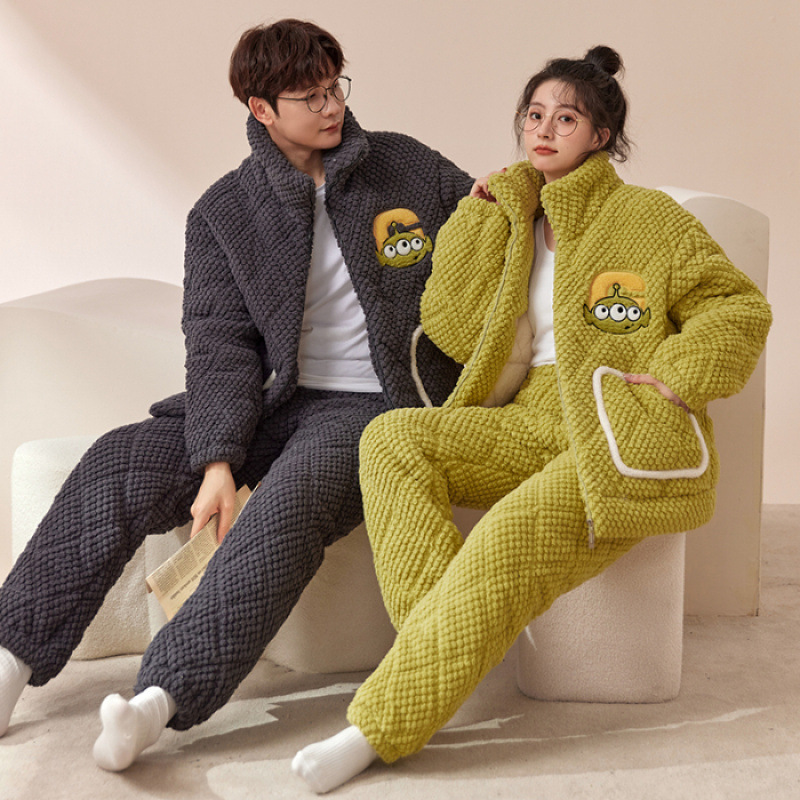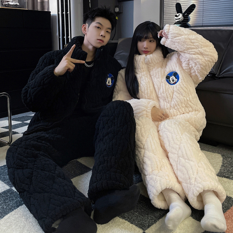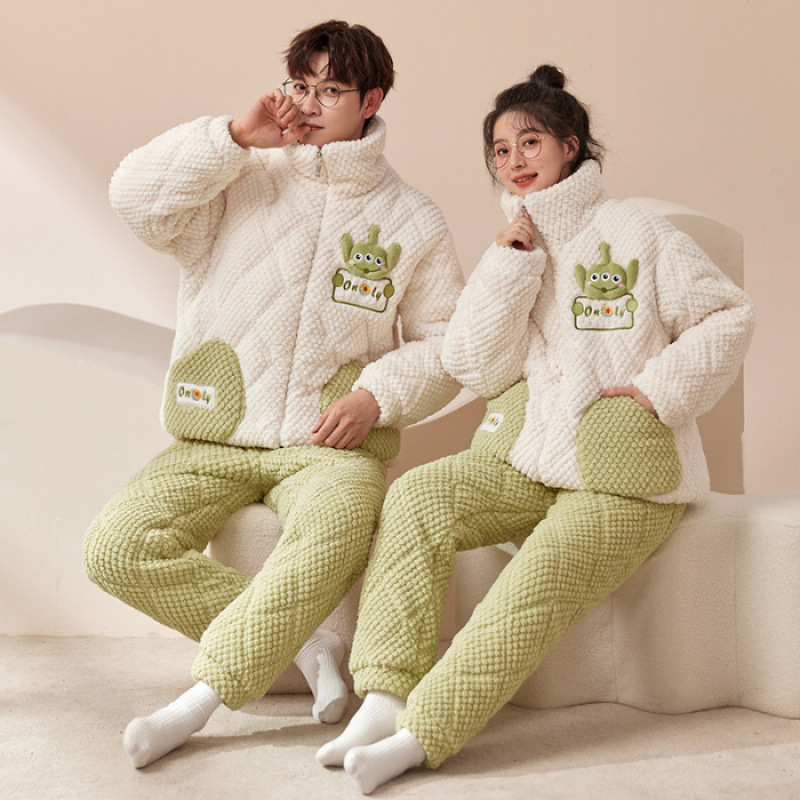 새로운 청소년 간단한 산호 양털 지퍼 만화 커플 클립 코튼 파자마 겨울 세트 두꺼운 홈 의류 세트스토어 가기