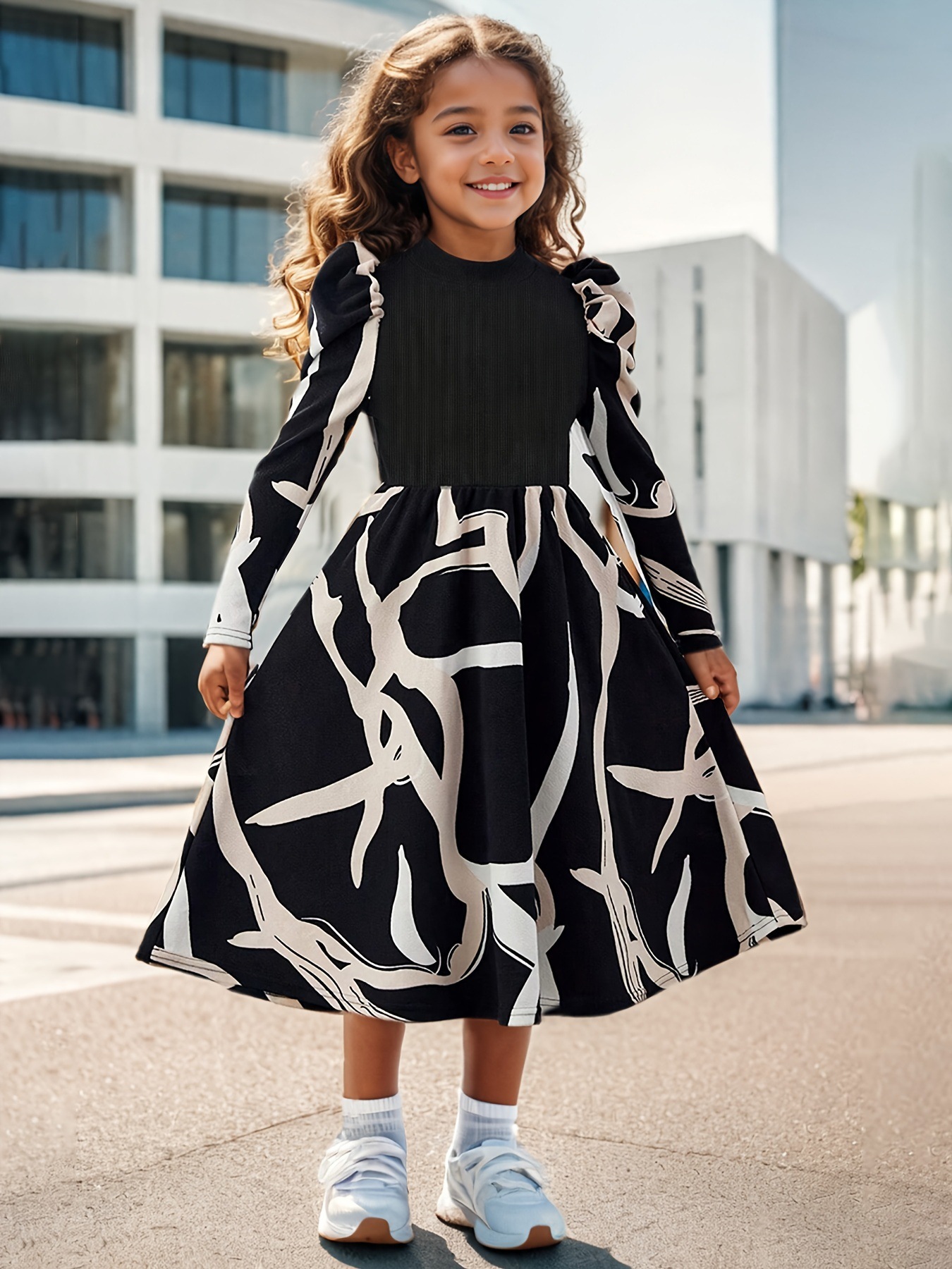 국경 간 대외 무역 INS 소녀 꽃 인쇄 기하학적 패턴 장식 긴 소매 스탠드 칼라 거품 소매 간단한 원피스