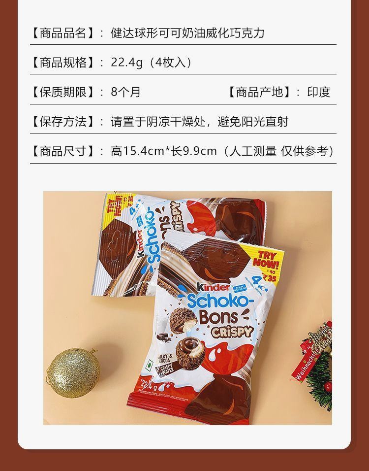 健达巧克力脆皮球:22.4g/袋。一箱96袋。