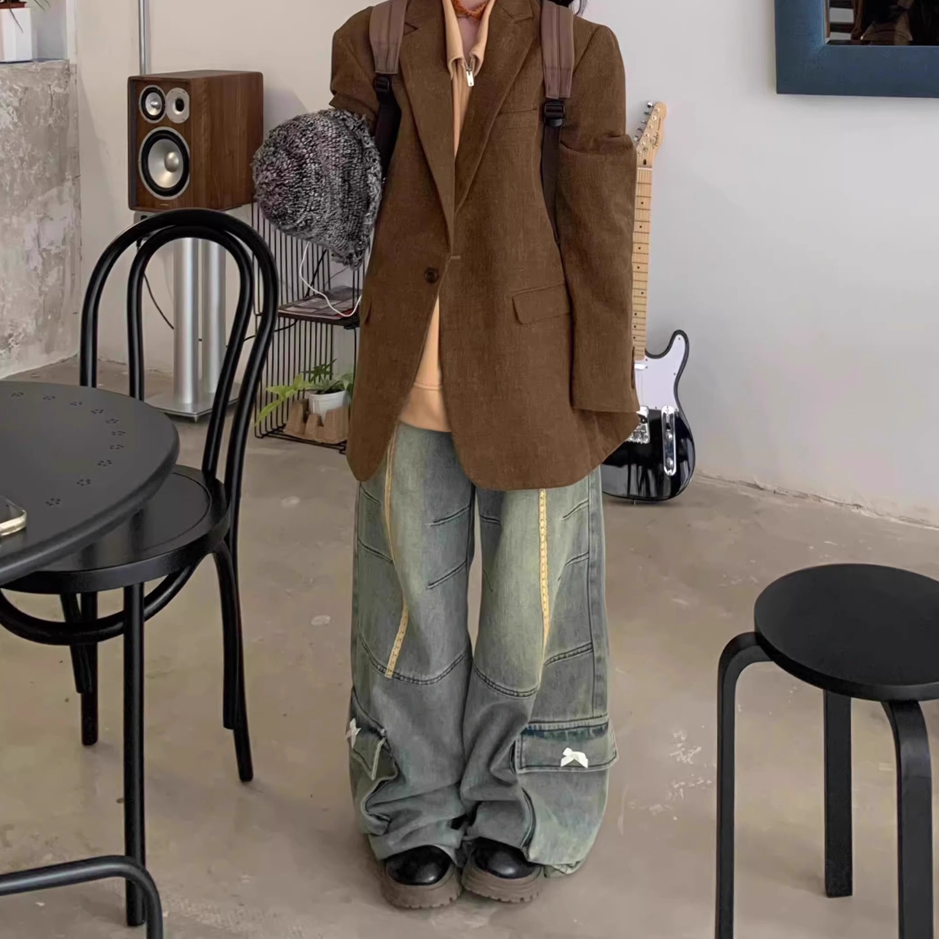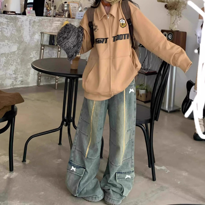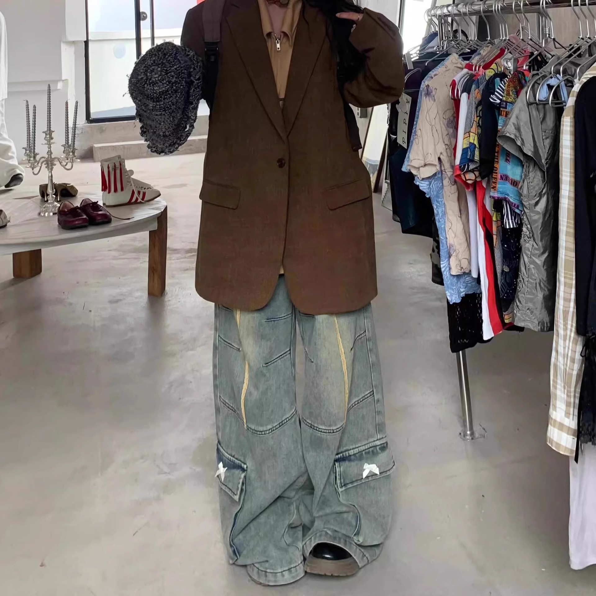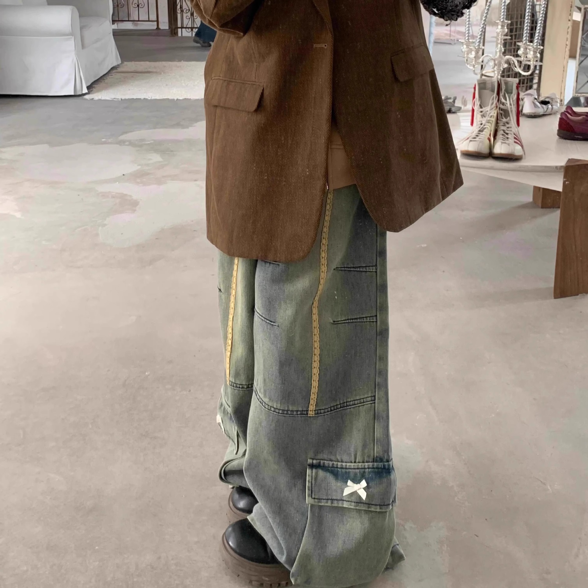 아메리칸 스타일 레트로 올드 Bowknot 와이드 레그 청바지 여성용 이른 봄 핫 걸 느슨한 연속 올 매치 바지스토어 가기
